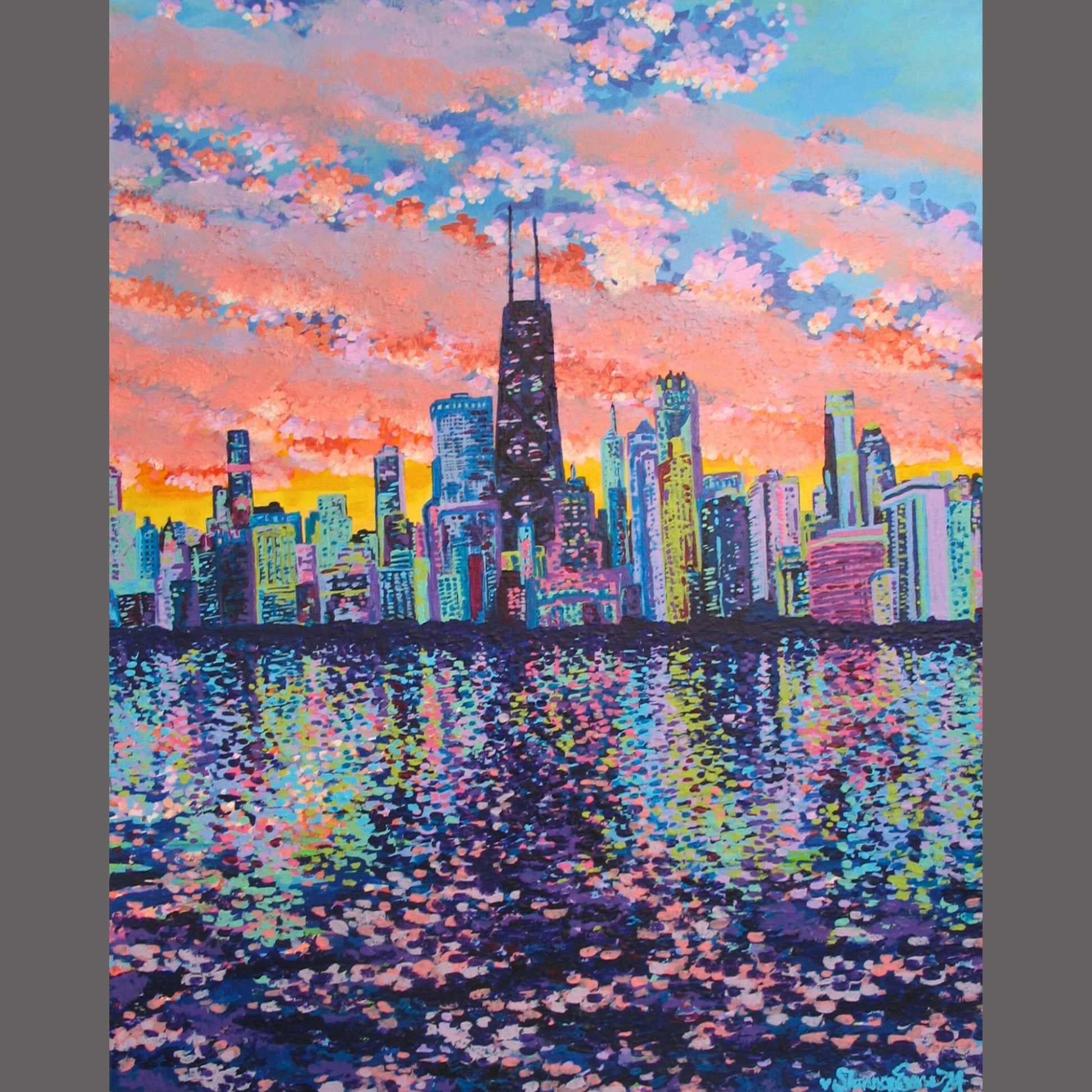 This love letter to Chicago explodes with the dynamic energy of the city. Crafted in detailed color expressionism, it depicts the downtown skyline as the sun sets. The city’s iconic silhouette is affectionately mirrored in prismatic color over the glittering waters of Lake Michigan.