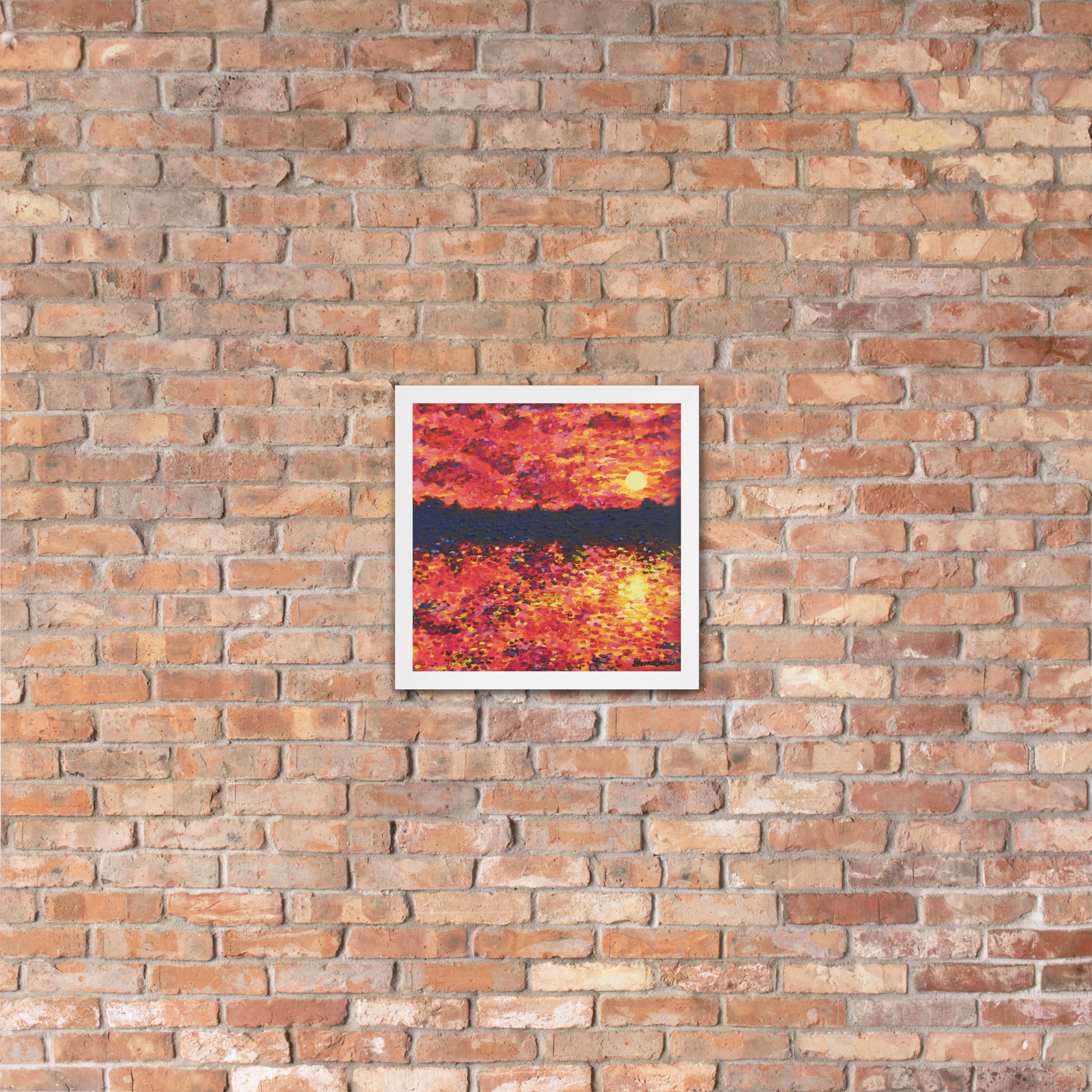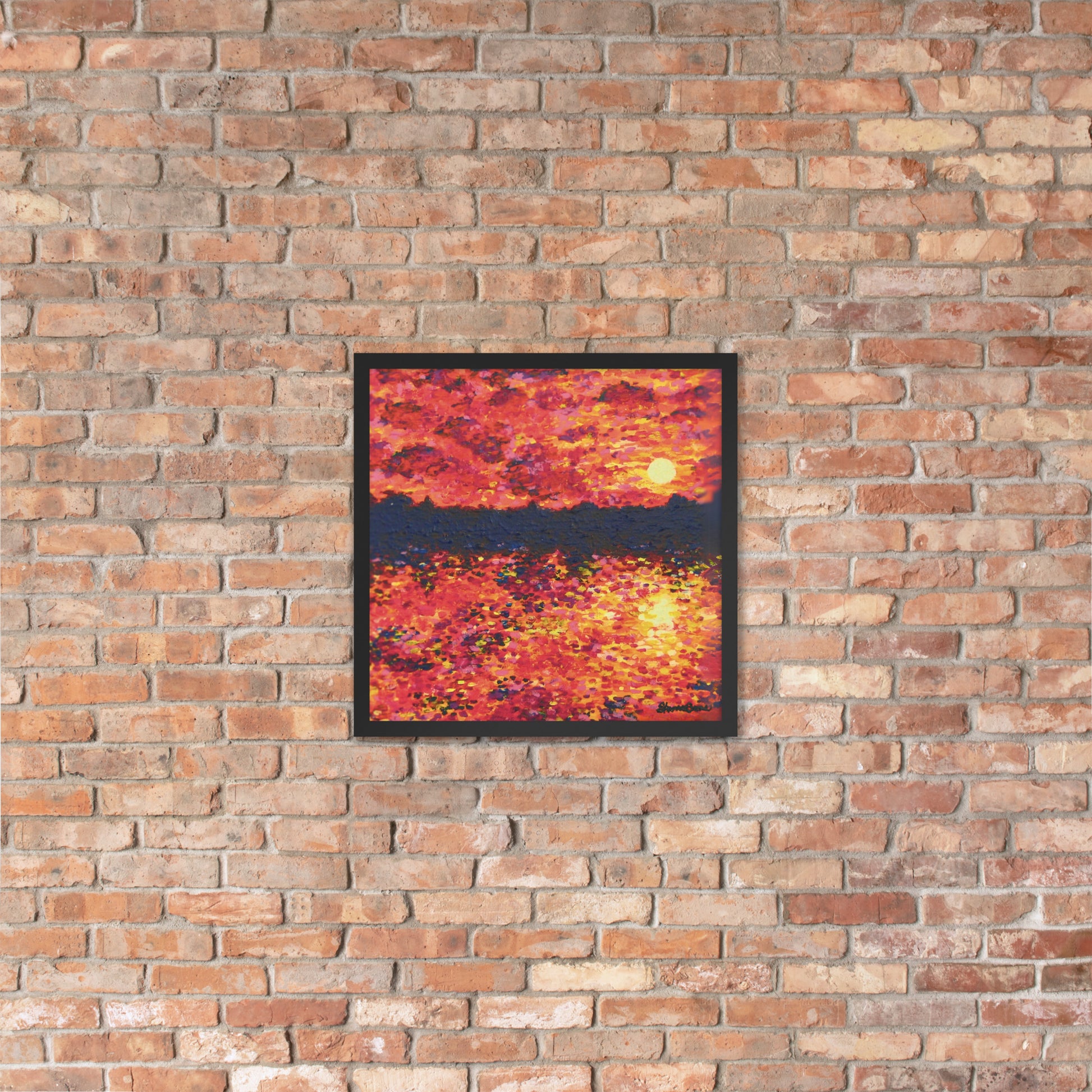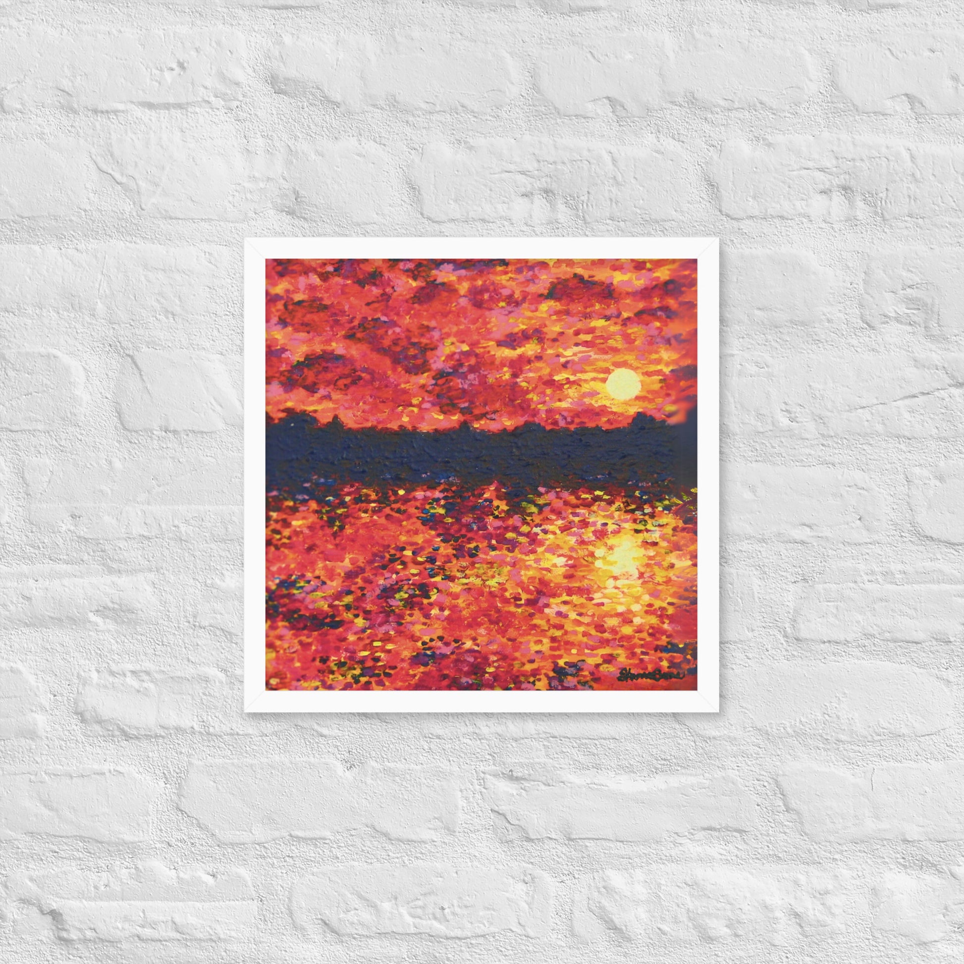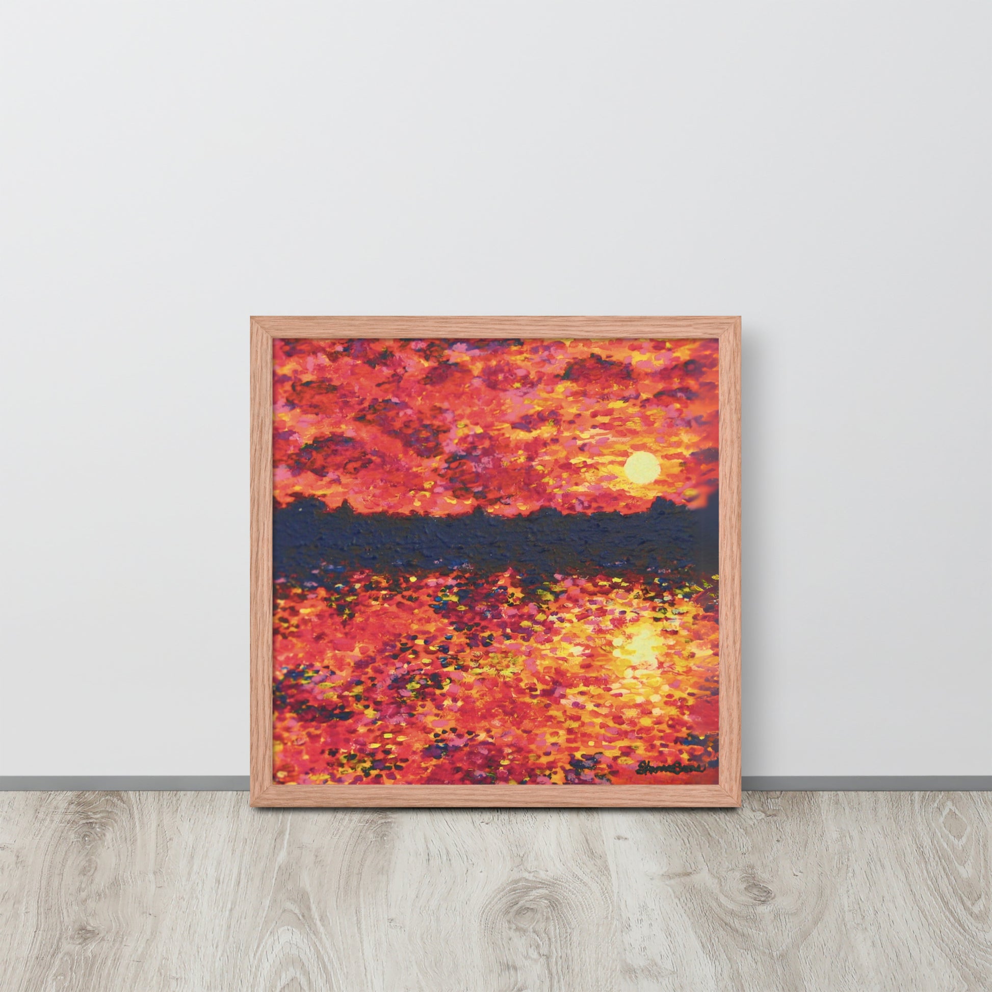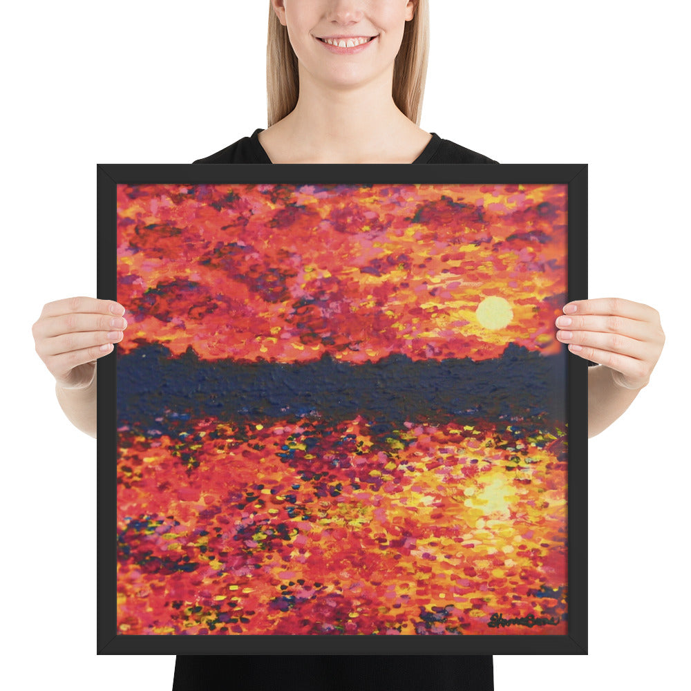 Awaken your senses with Just Think About It, an energizing contemporary painting that captures the spirit of nature's daily renewal. This stunning piece features a fiery orange-hued sunrise that bathes the landscape in warmth and vitality. As the sun rises over the silhouette of trees, light cascades across the serene lake below with tickling reflections as it forms a breathtaking scene that both demands notice and instills gratitude.