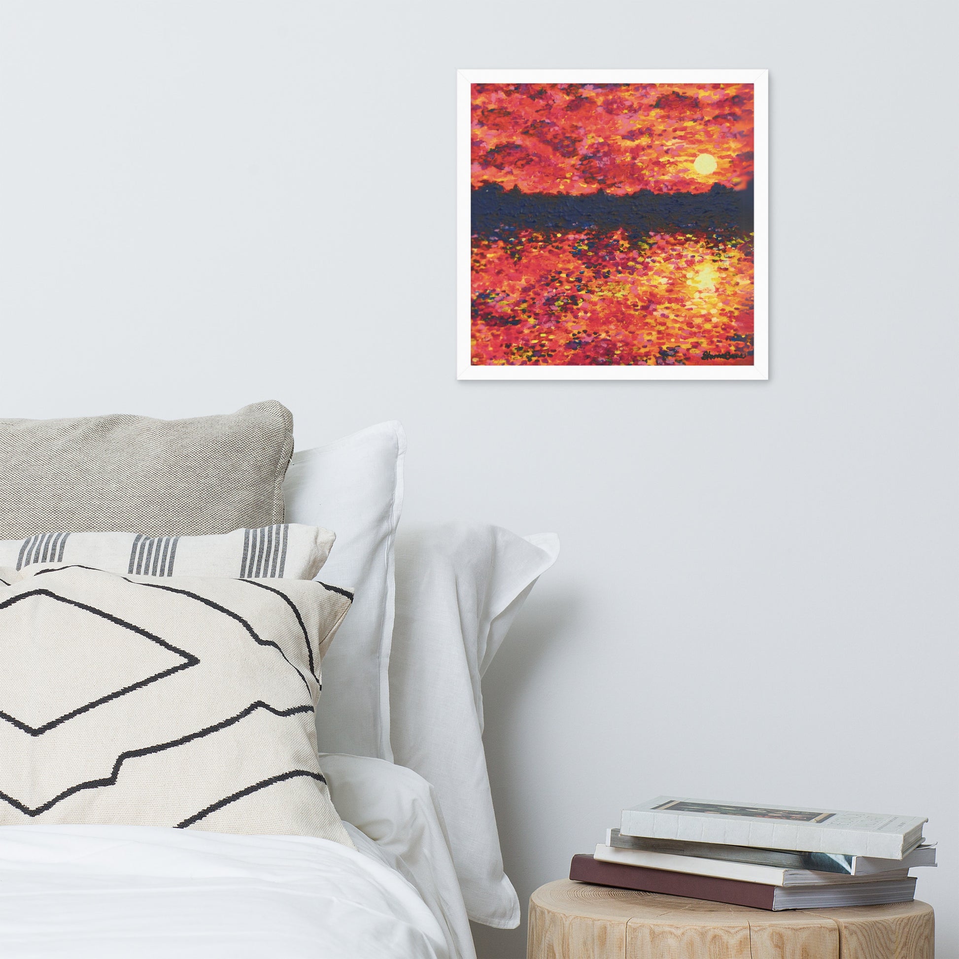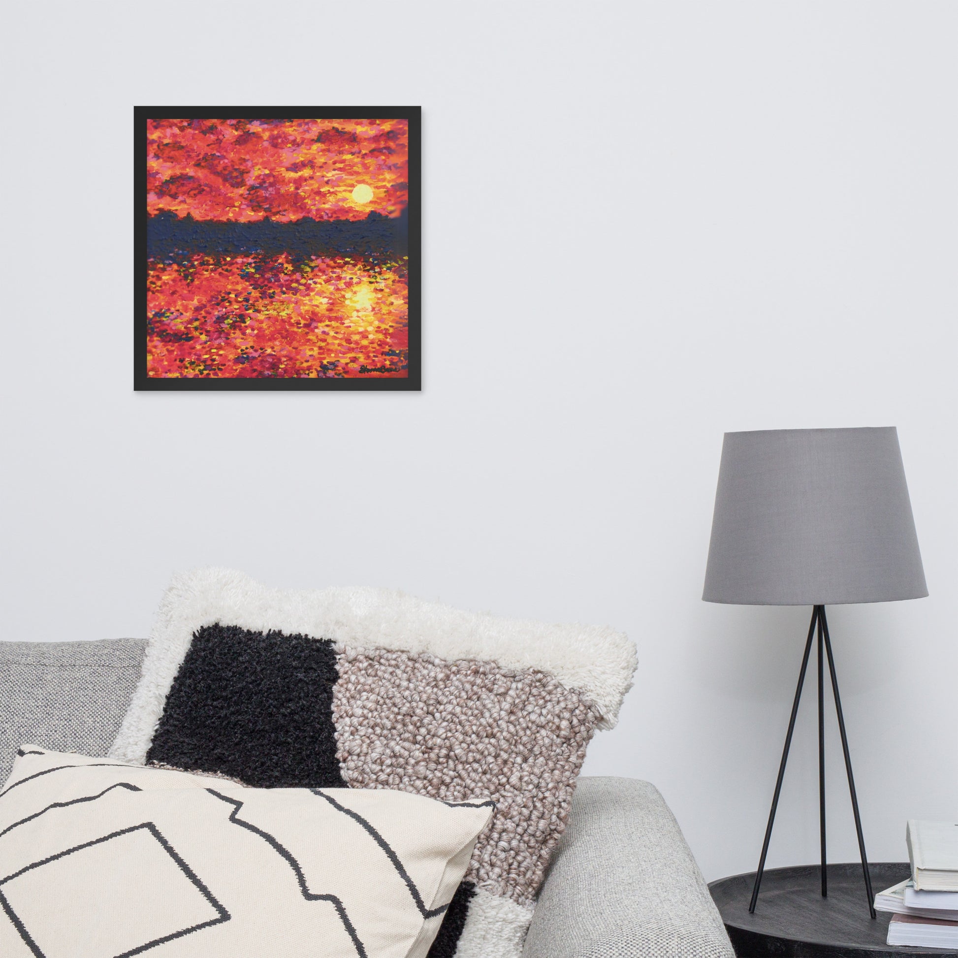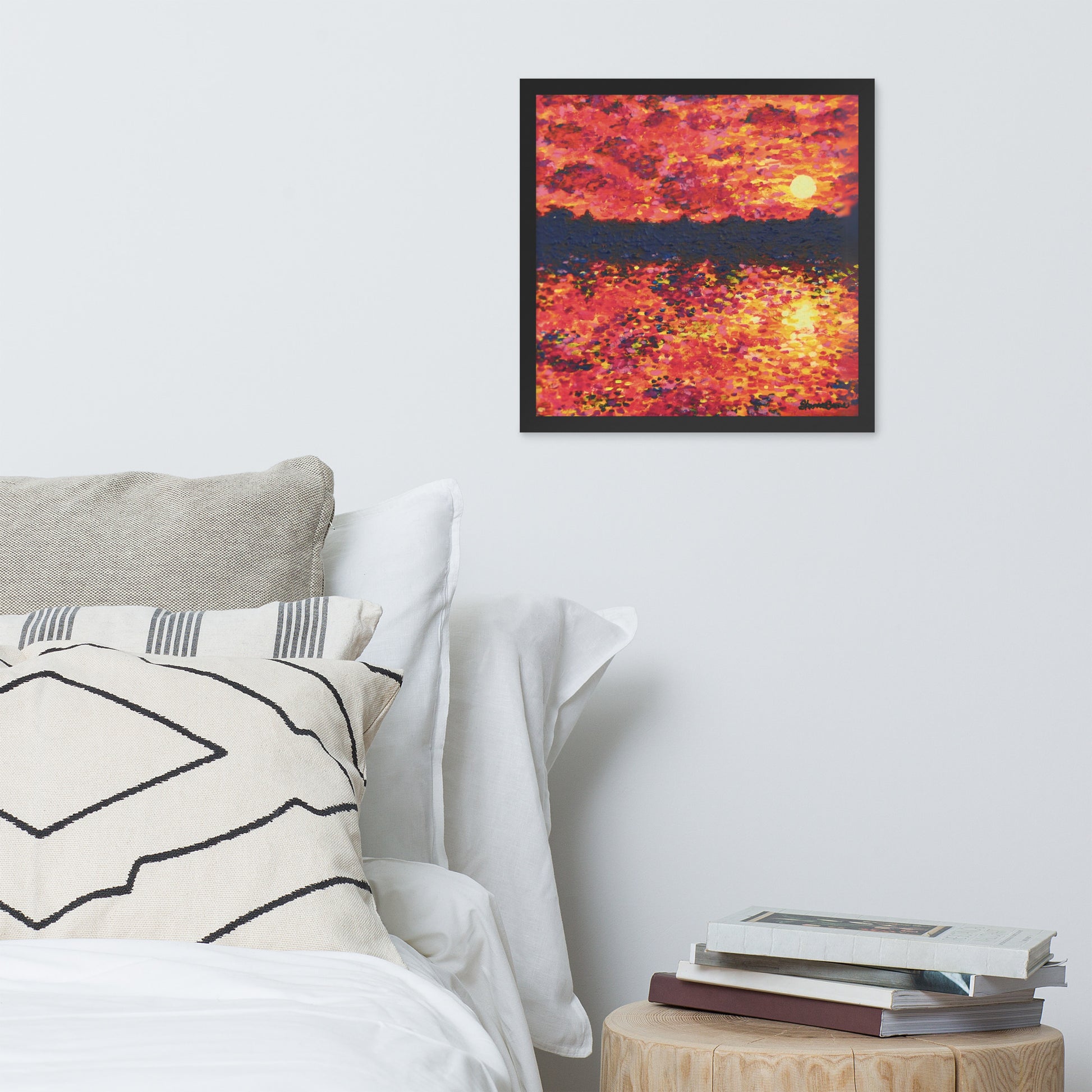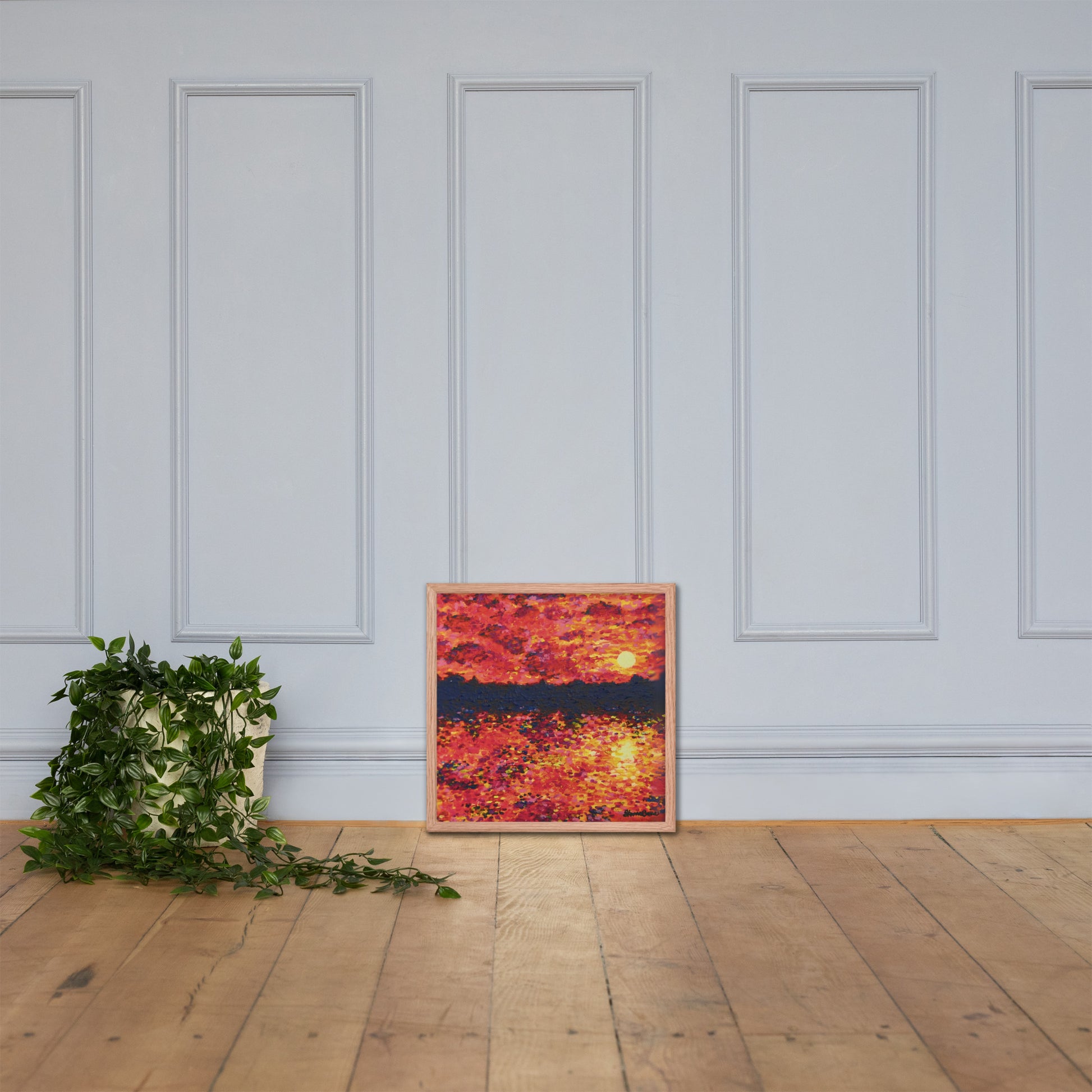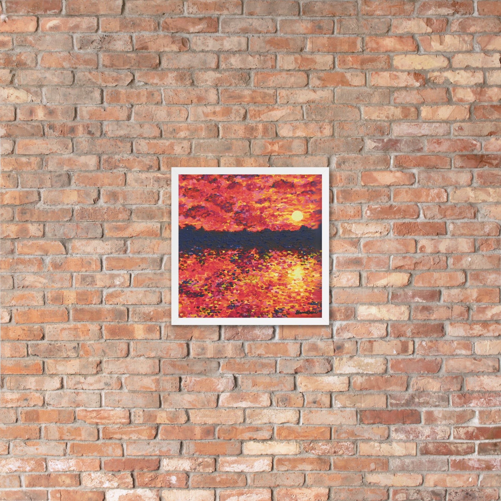 Awaken your senses with Just Think About It, an energizing contemporary painting that captures the spirit of nature's daily renewal. This stunning piece features a fiery orange-hued sunrise that bathes the landscape in warmth and vitality. As the sun rises over the silhouette of trees, light cascades across the serene lake below with tickling reflections as it forms a breathtaking scene that both demands notice and instills gratitude.