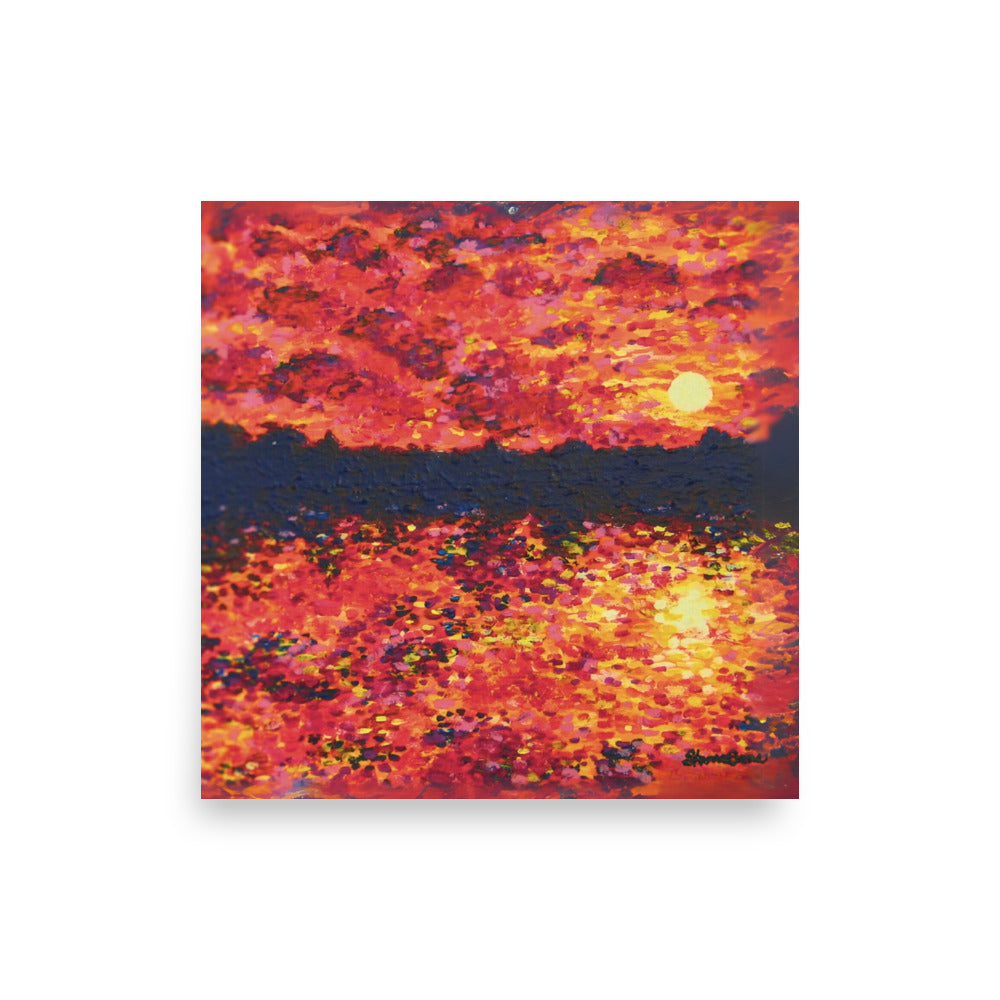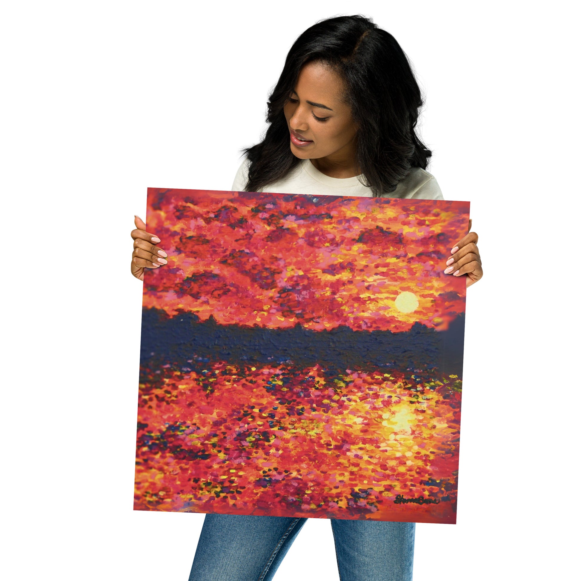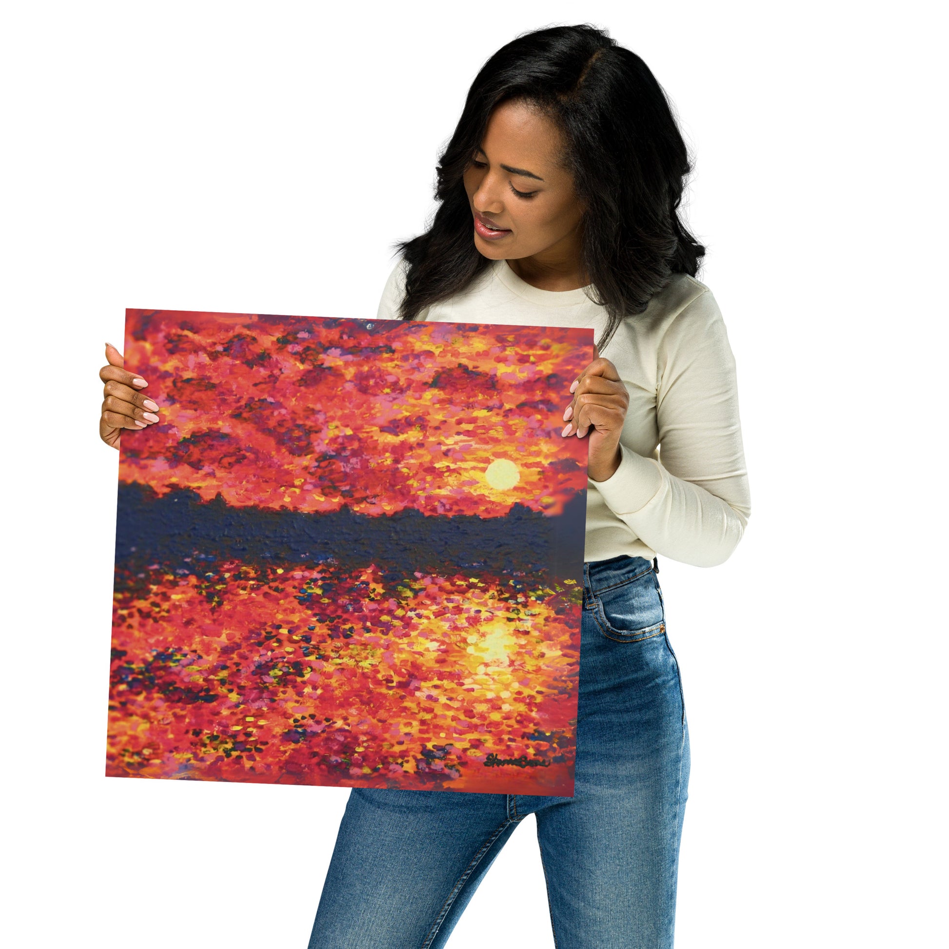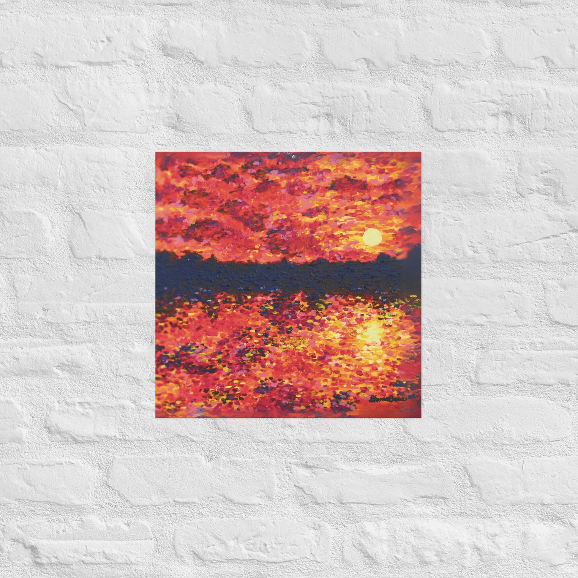 Awaken your senses with Just Think About It, an energizing contemporary painting that captures the spirit of nature's daily renewal. This stunning piece features a fiery orange-hued sunrise that bathes the landscape in warmth and vitality. As the sun rises over the silhouette of trees, light cascades across the serene lake below with tickling reflections as it forms a breathtaking scene that both demands notice and instills gratitude.