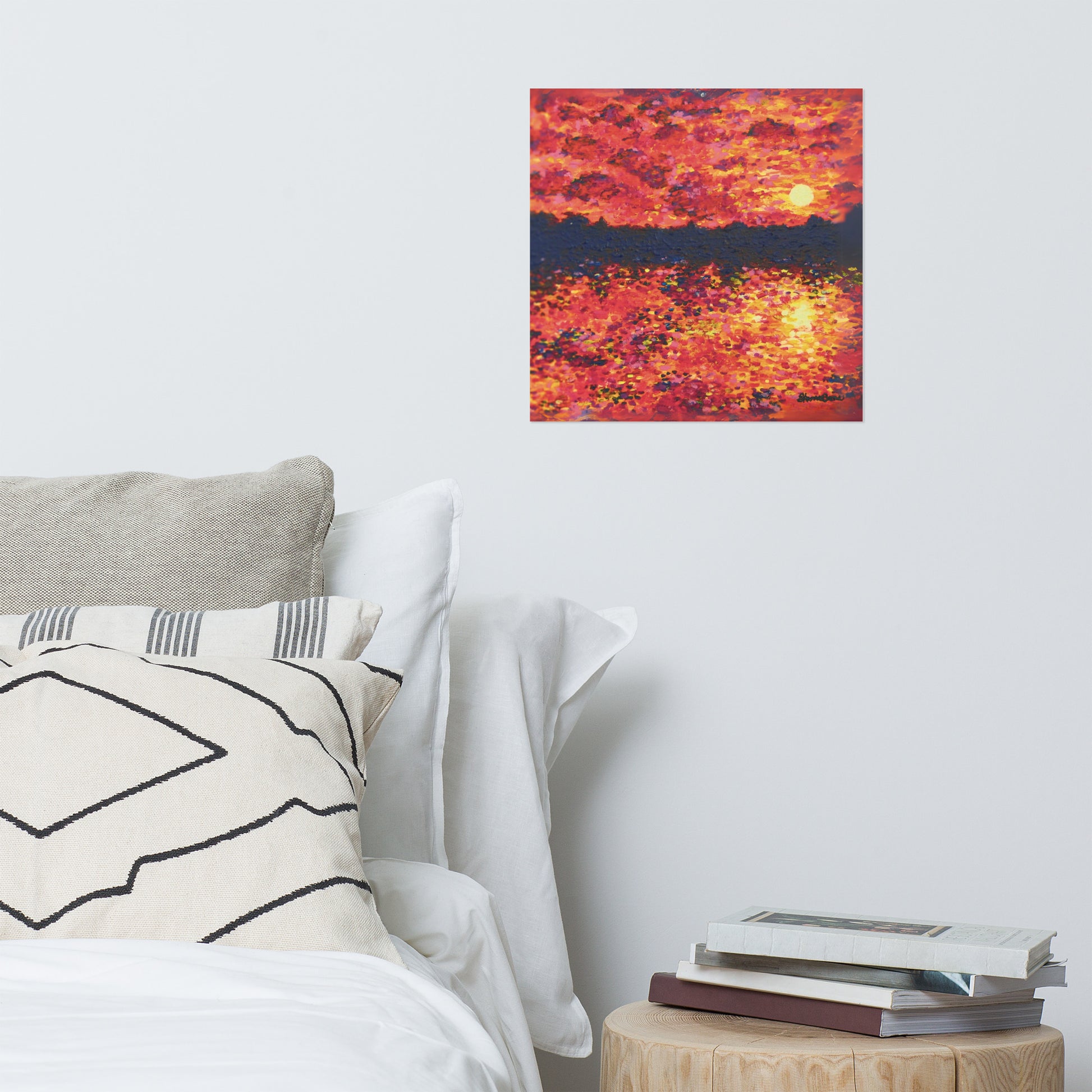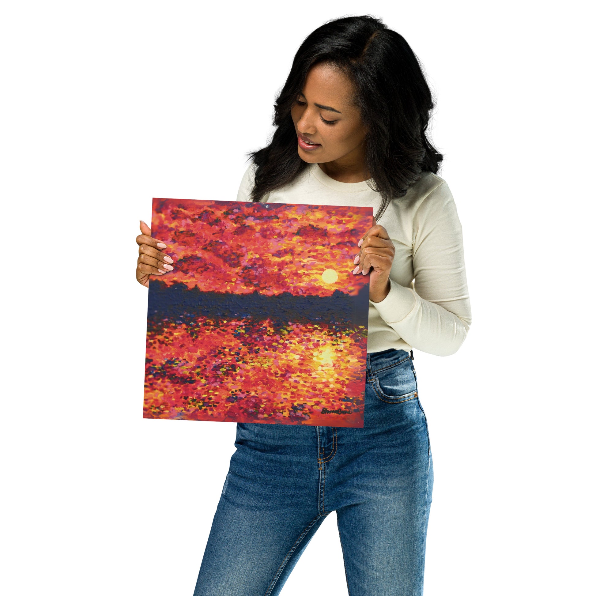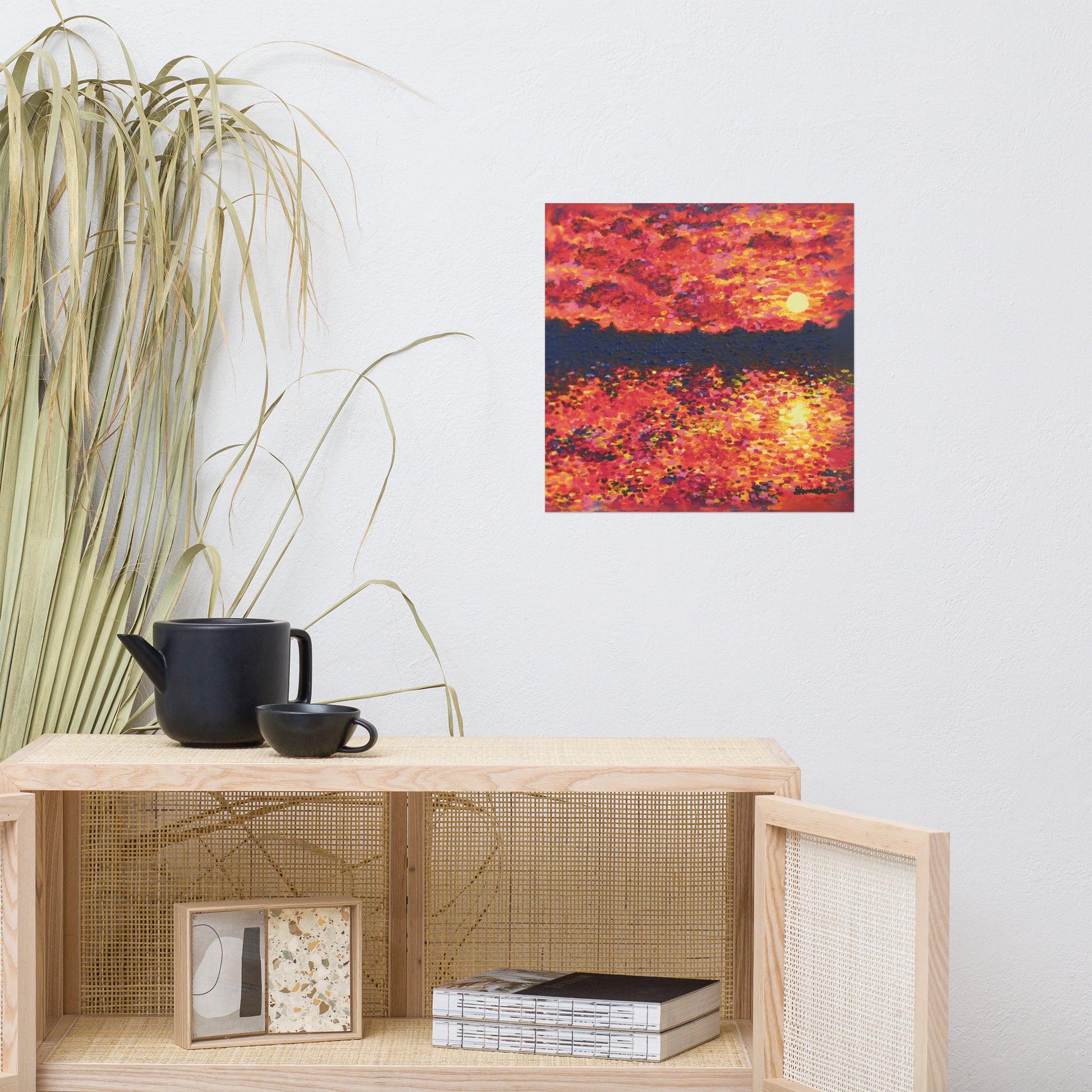 Awaken your senses with Just Think About It, an energizing contemporary painting that captures the spirit of nature's daily renewal. This stunning piece features a fiery orange-hued sunrise that bathes the landscape in warmth and vitality. As the sun rises over the silhouette of trees, light cascades across the serene lake below with tickling reflections as it forms a breathtaking scene that both demands notice and instills gratitude.
