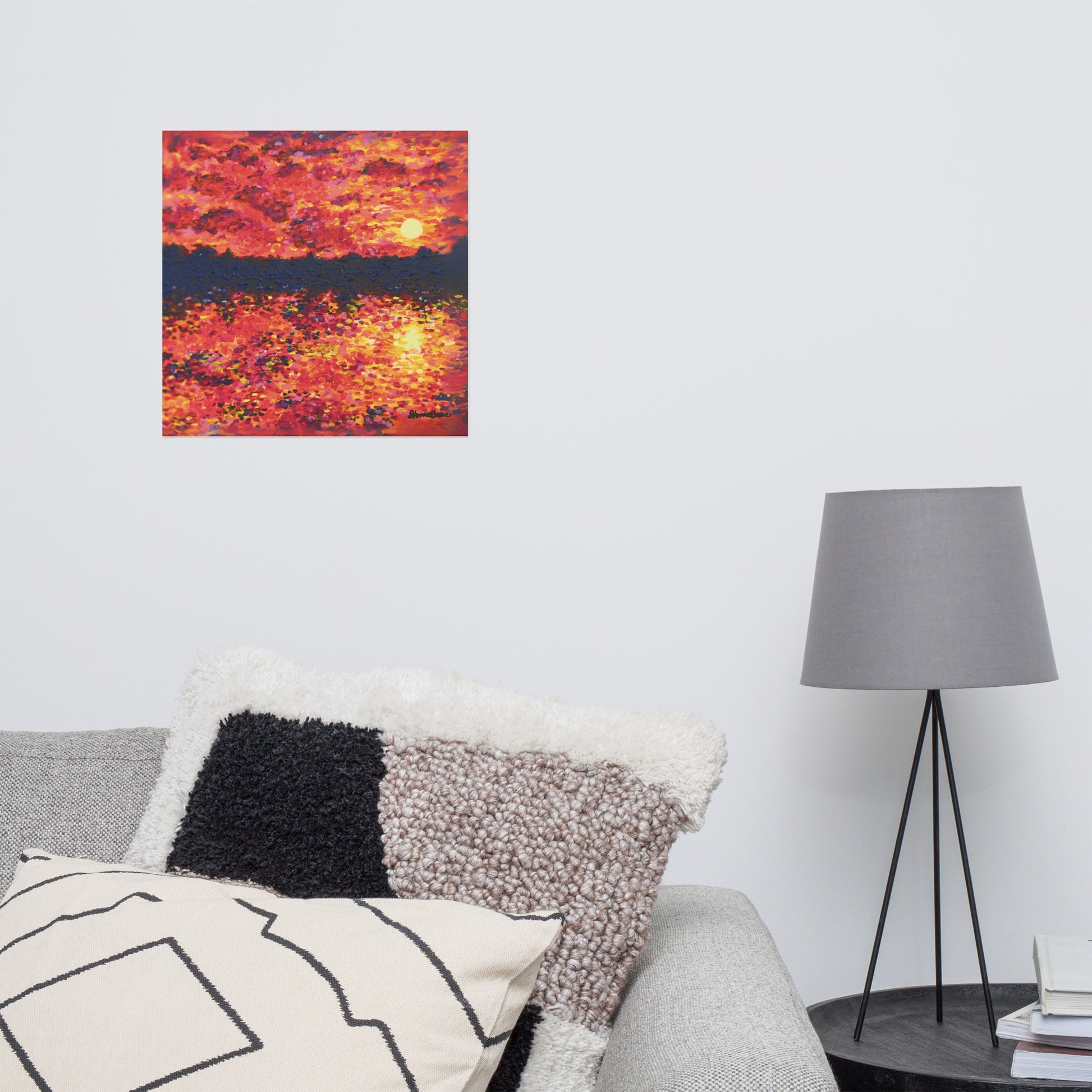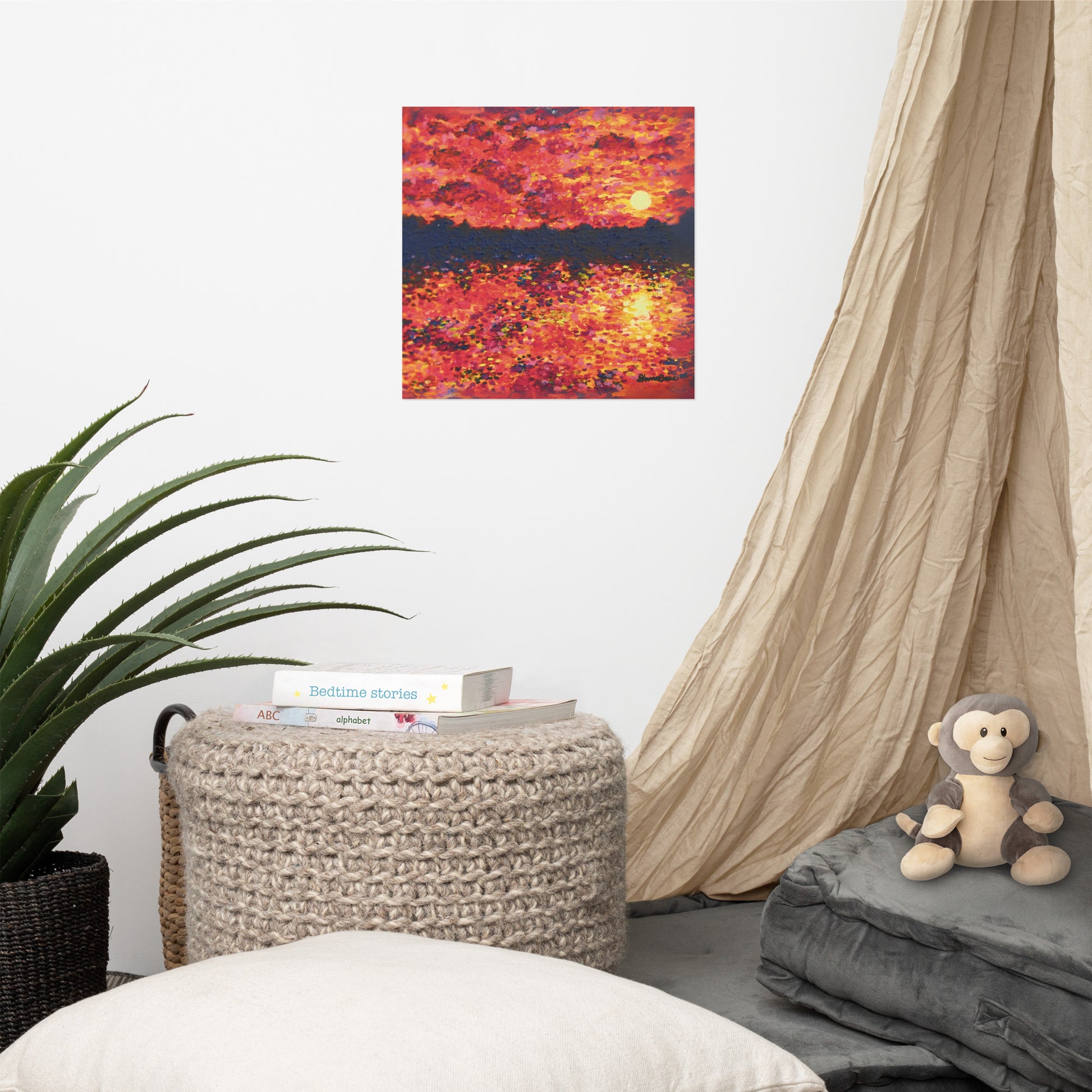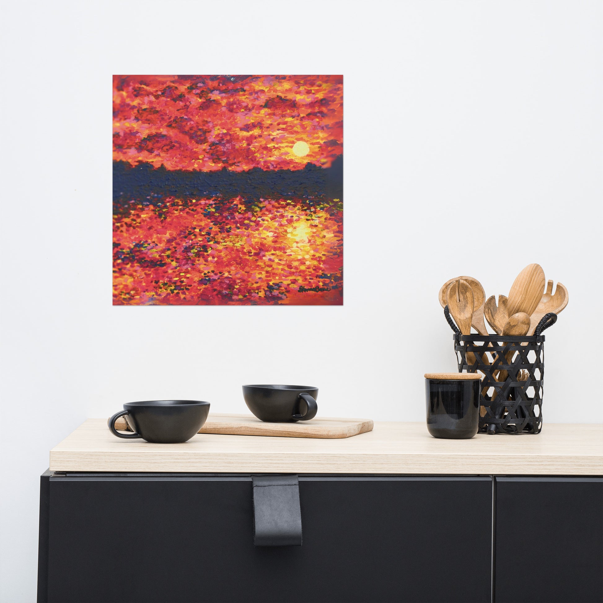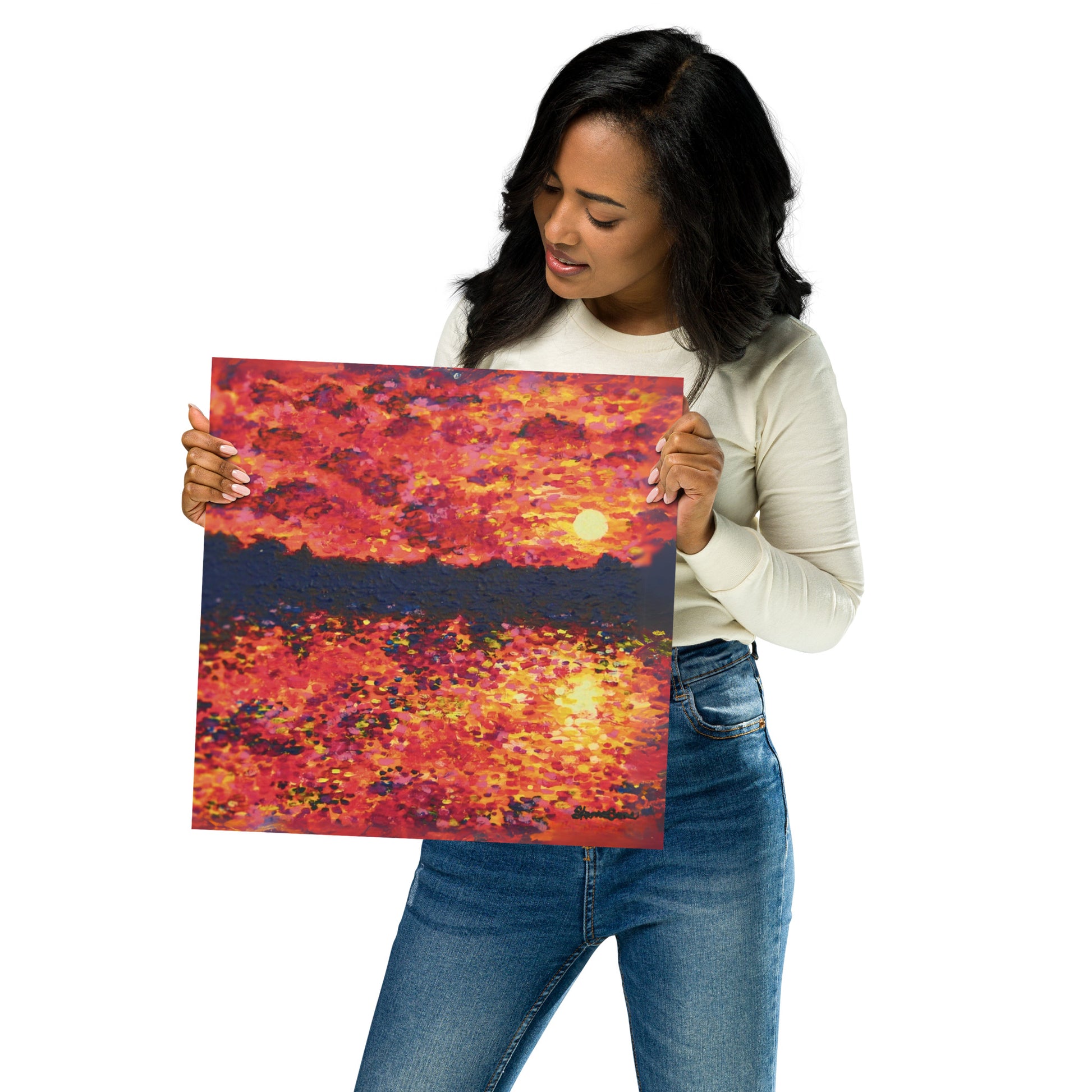 Awaken your senses with Just Think About It, an energizing contemporary painting that captures the spirit of nature's daily renewal. This stunning piece features a fiery orange-hued sunrise that bathes the landscape in warmth and vitality. As the sun rises over the silhouette of trees, light cascades across the serene lake below with tickling reflections as it forms a breathtaking scene that both demands notice and instills gratitude.