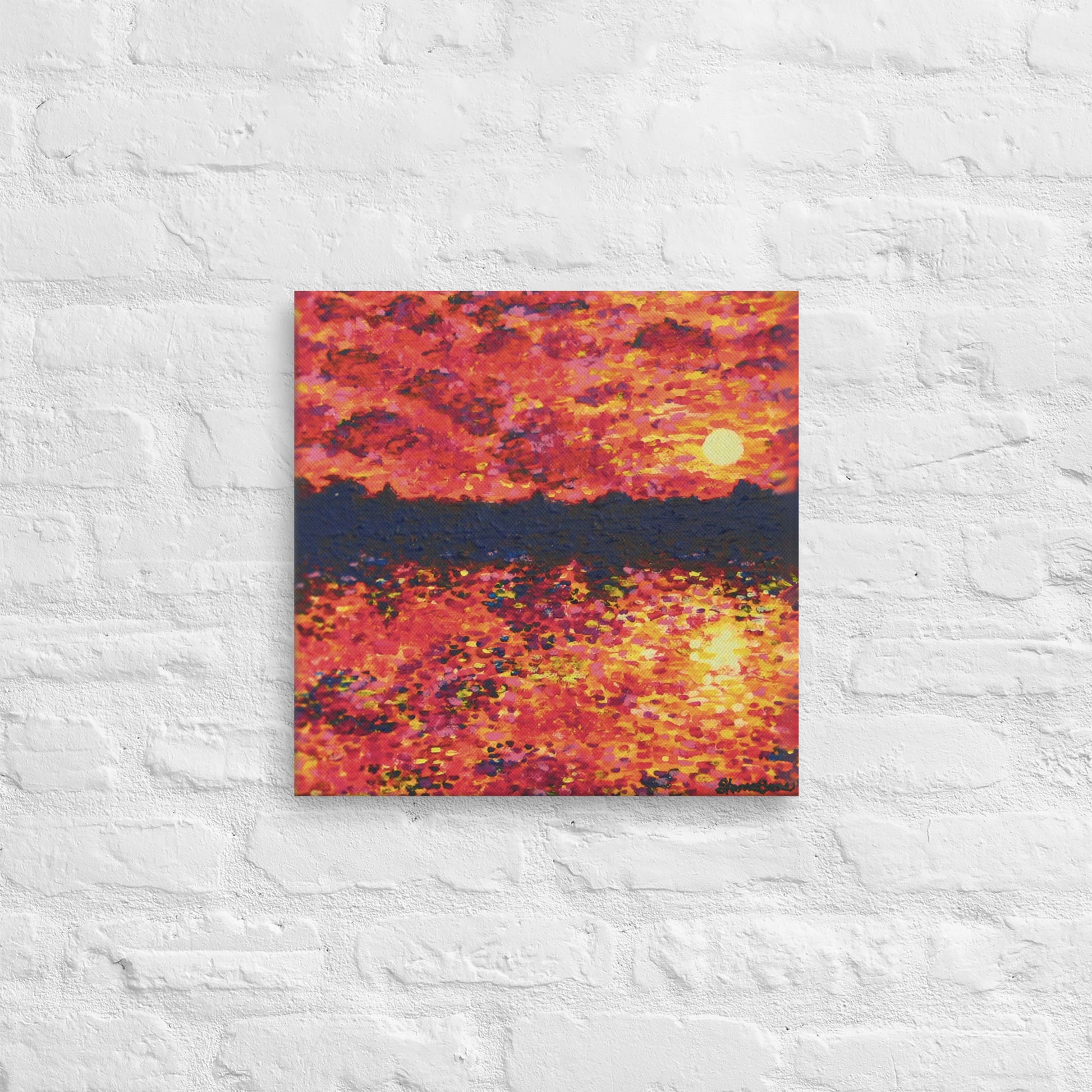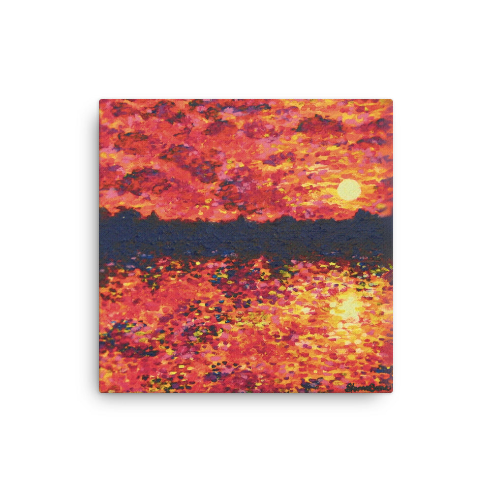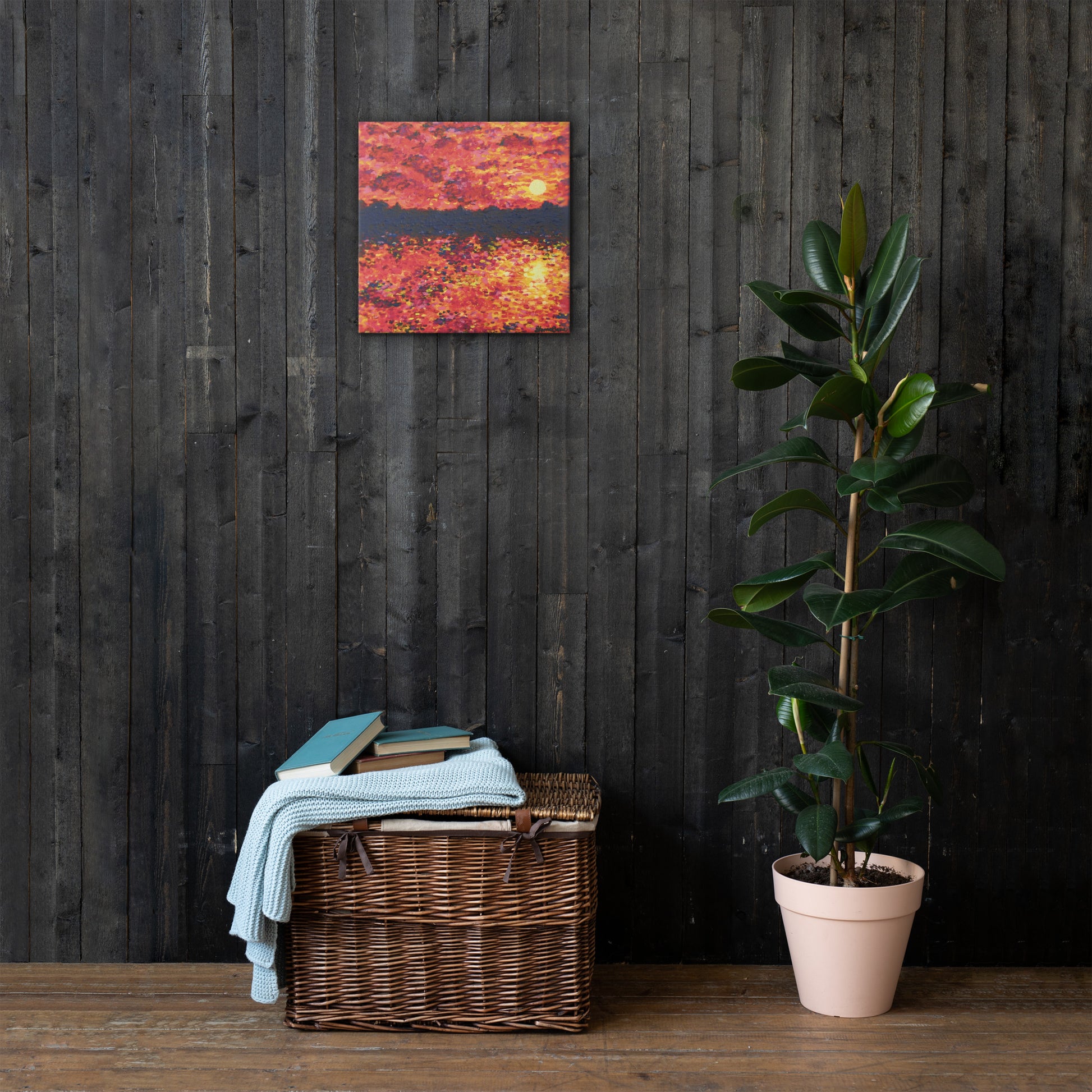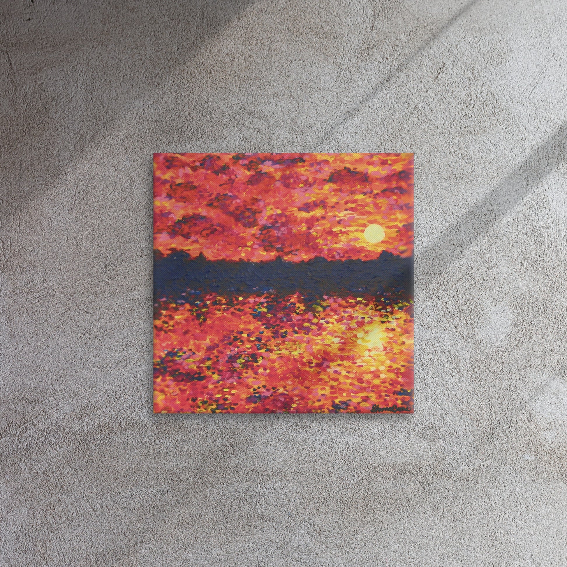 Awaken your senses with Just Think About It, an energizing contemporary painting that captures the spirit of nature's daily renewal. This stunning piece features a fiery orange-hued sunrise that bathes the landscape in warmth and vitality. As the sun rises over the silhouette of trees, light cascades across the serene lake below with tickling reflections as it forms a breathtaking scene that both demands notice and instills gratitude.