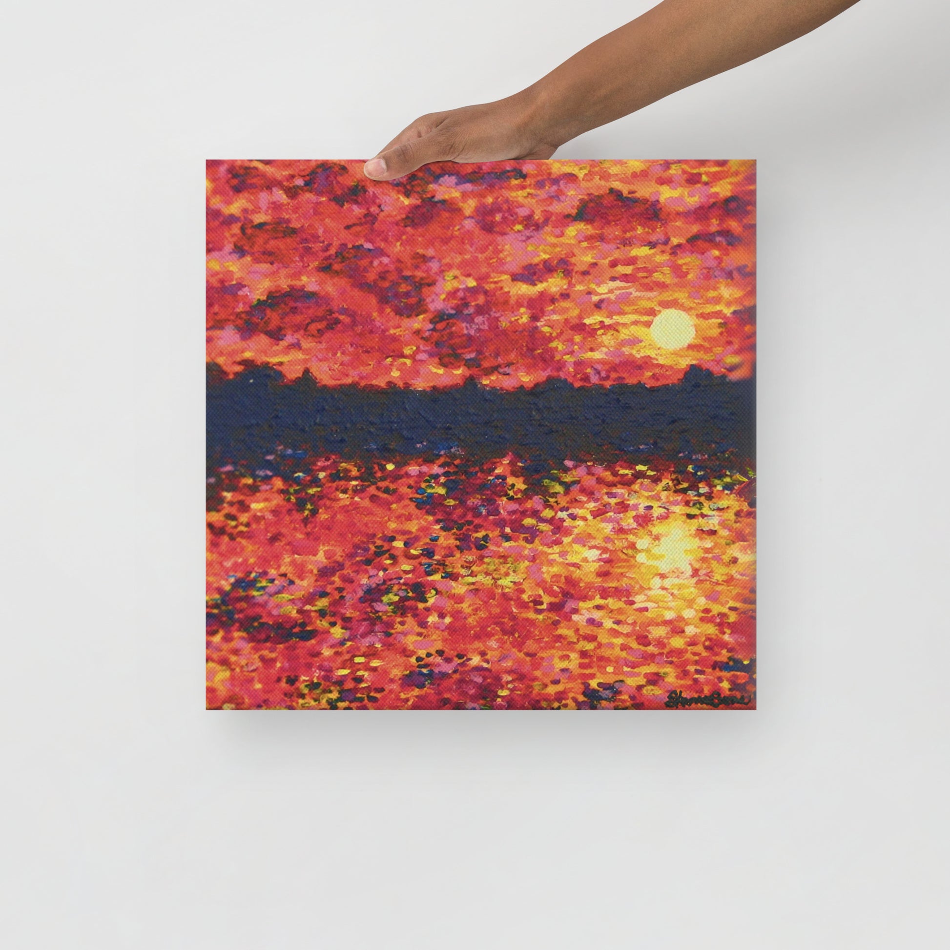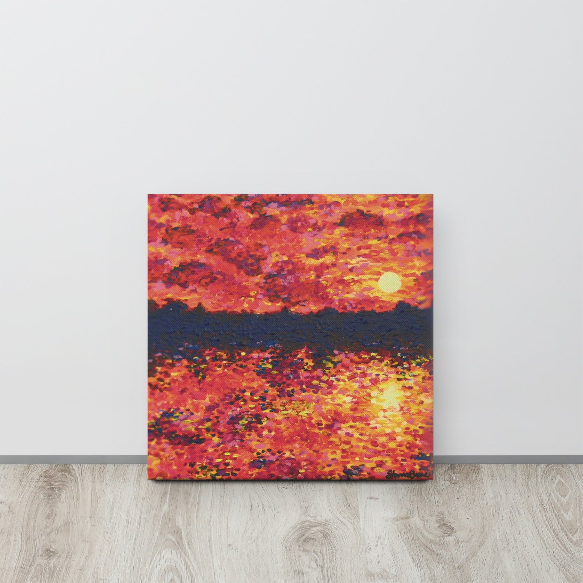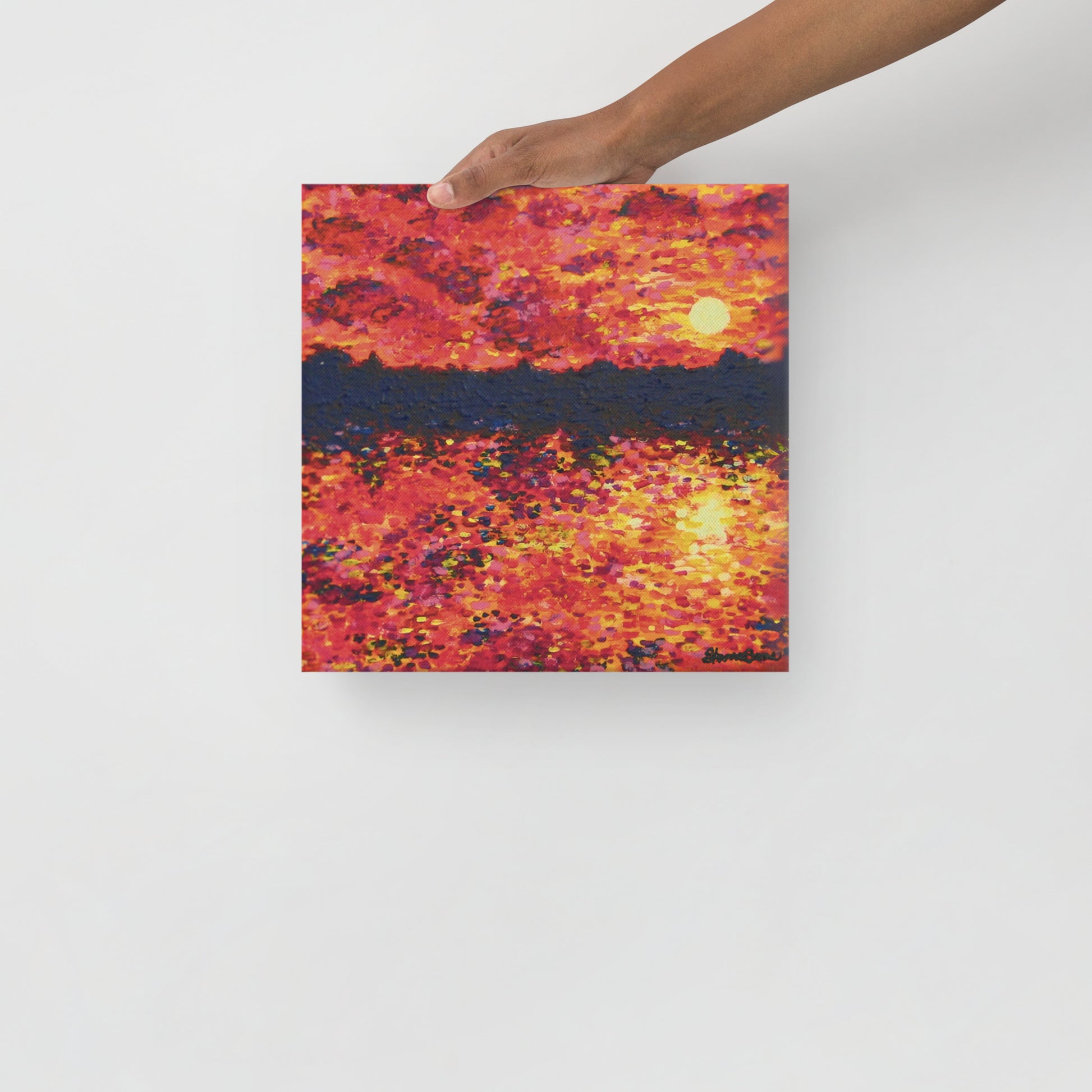 Awaken your senses with Just Think About It, an energizing contemporary painting that captures the spirit of nature's daily renewal. This stunning piece features a fiery orange-hued sunrise that bathes the landscape in warmth and vitality. As the sun rises over the silhouette of trees, light cascades across the serene lake below with tickling reflections as it forms a breathtaking scene that both demands notice and instills gratitude.