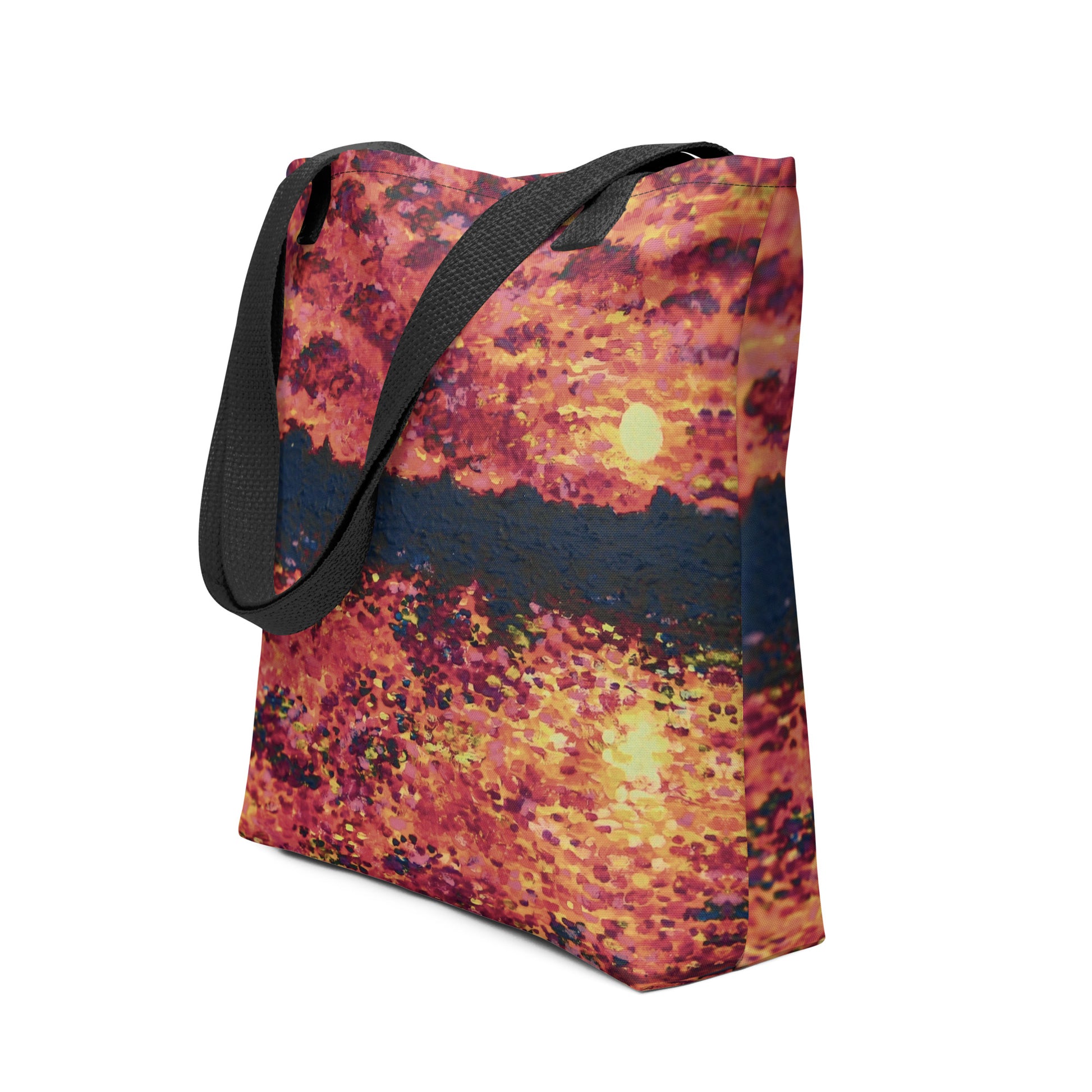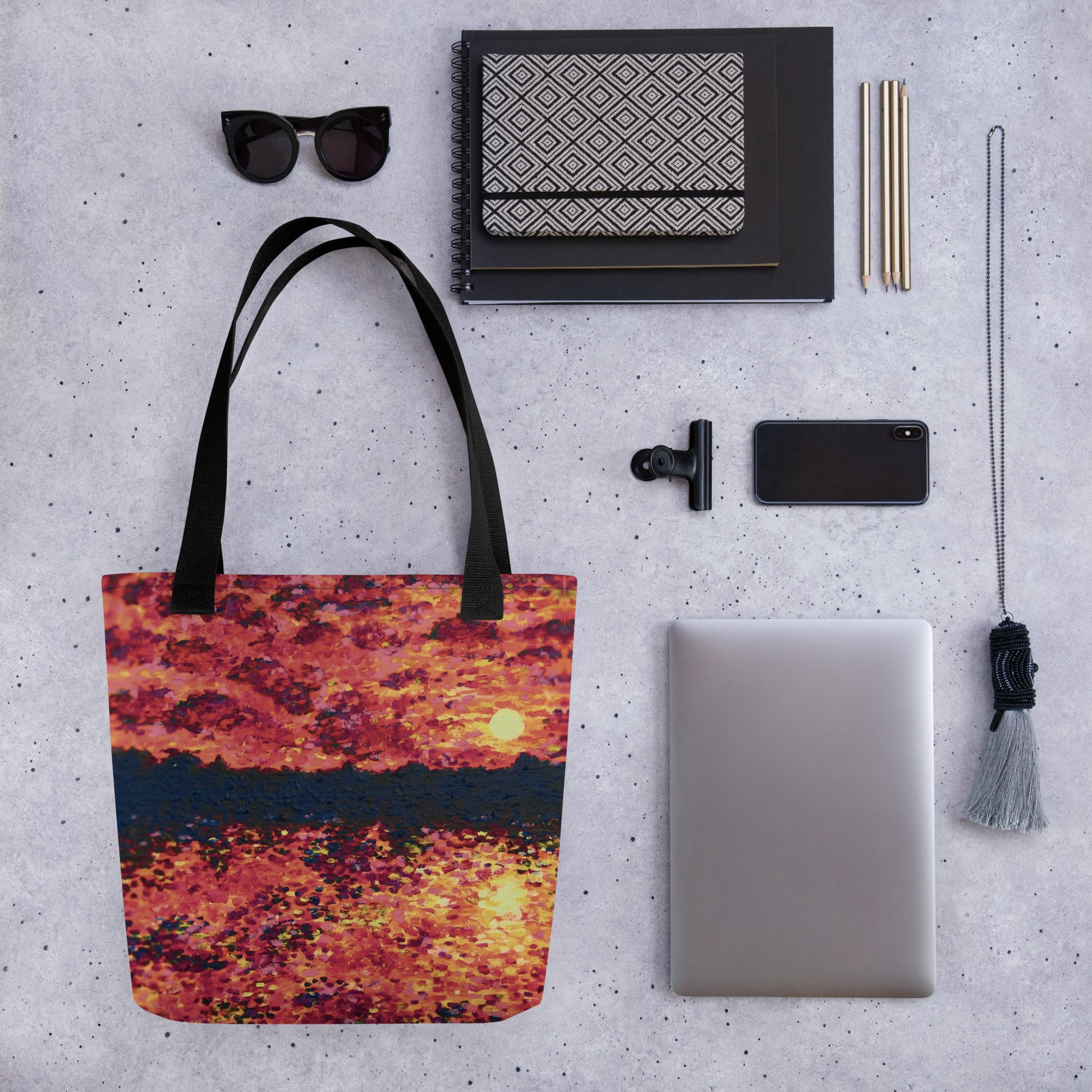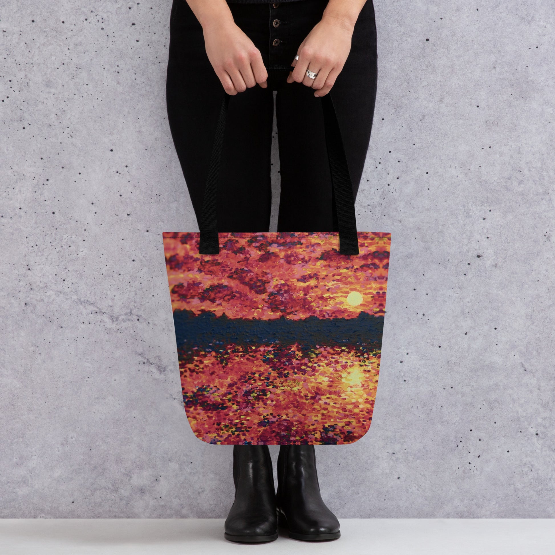 Awaken your senses with Just Think About It, an energizing contemporary painting that captures the spirit of nature's daily renewal. This stunning piece features a fiery orange-hued sunrise that bathes the landscape in warmth and vitality. As the sun rises over the silhouette of trees, light cascades across the serene lake below with tickling reflections as it forms a breathtaking scene that both demands notice and instills gratitude.