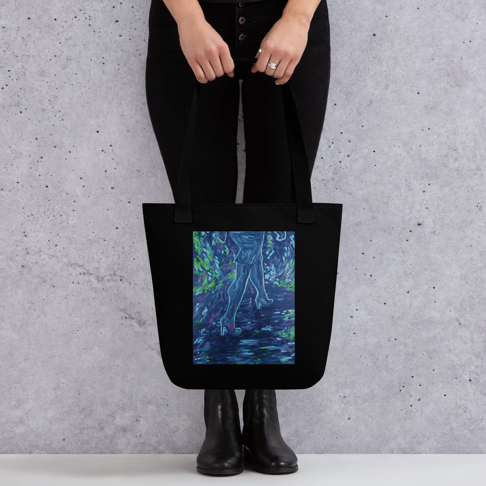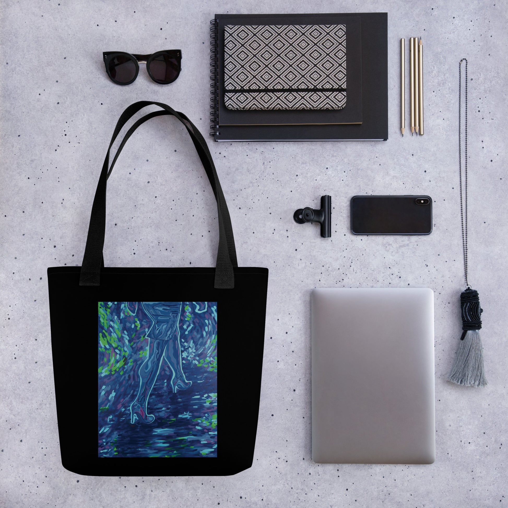Her skirt means business, paired with defiant stiletto heels, and adds a modern vibe to this timeless story. The woman's extravagantly pronounced calves testify to her long-established history of walking, making this artwork an eye-catching conversation-starter for any space.