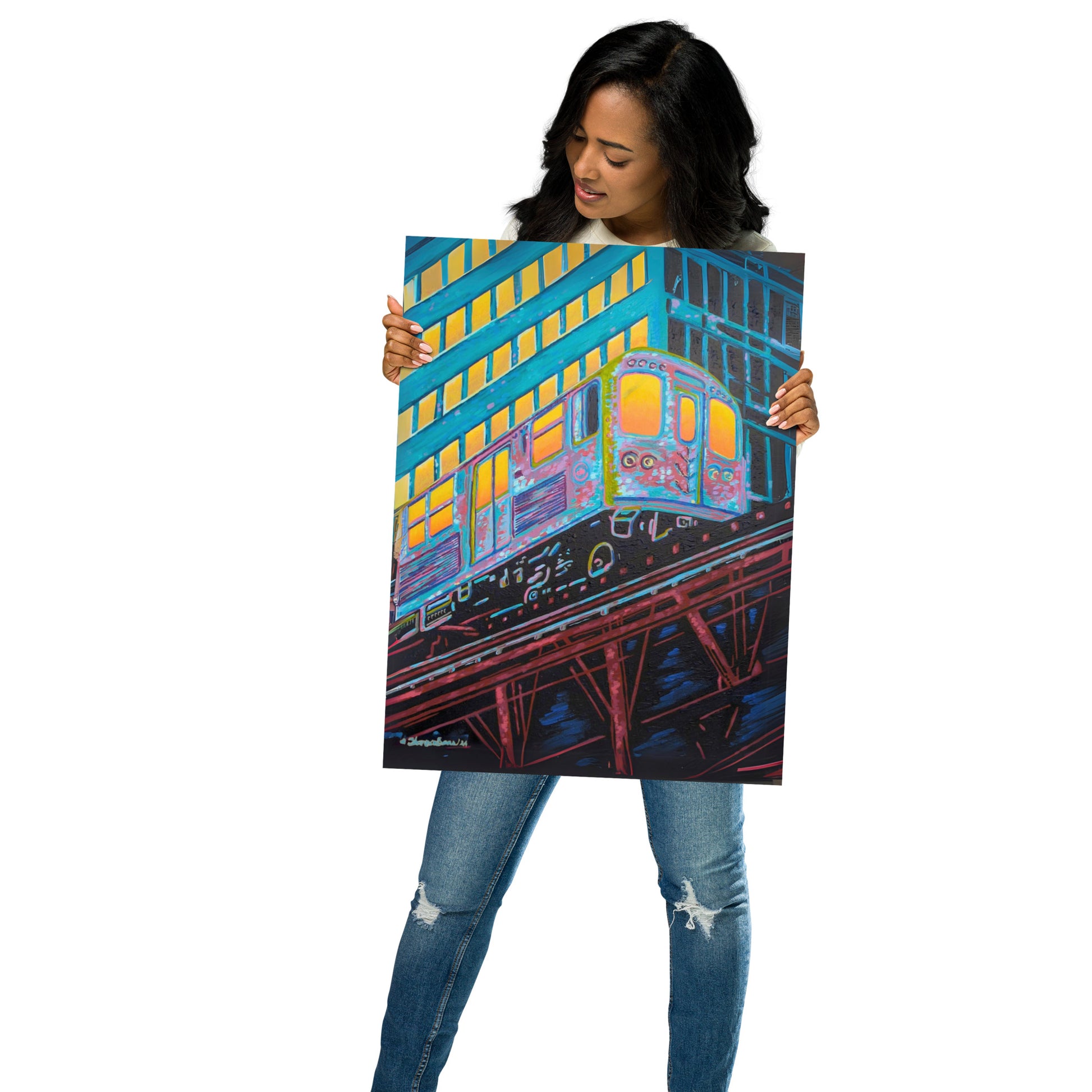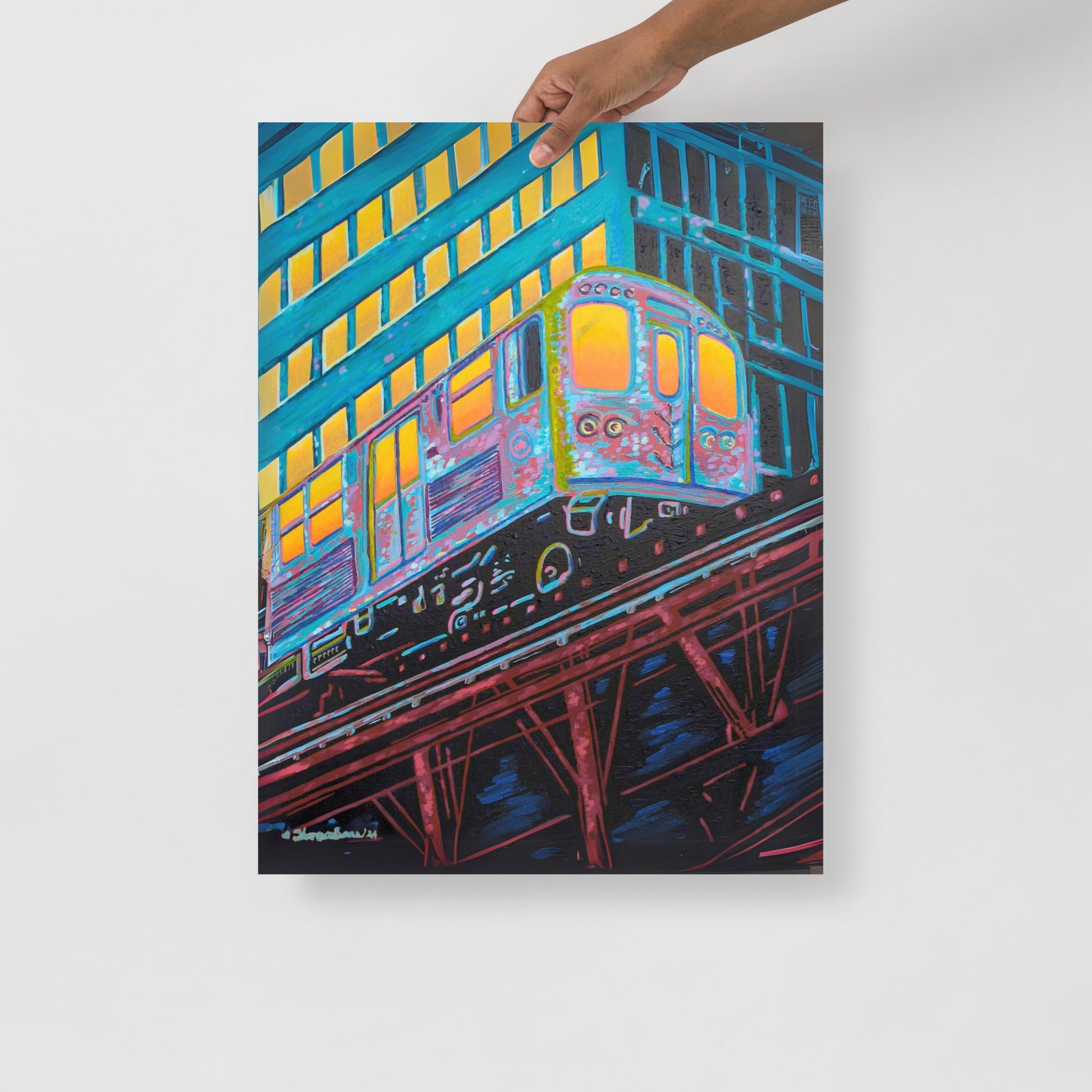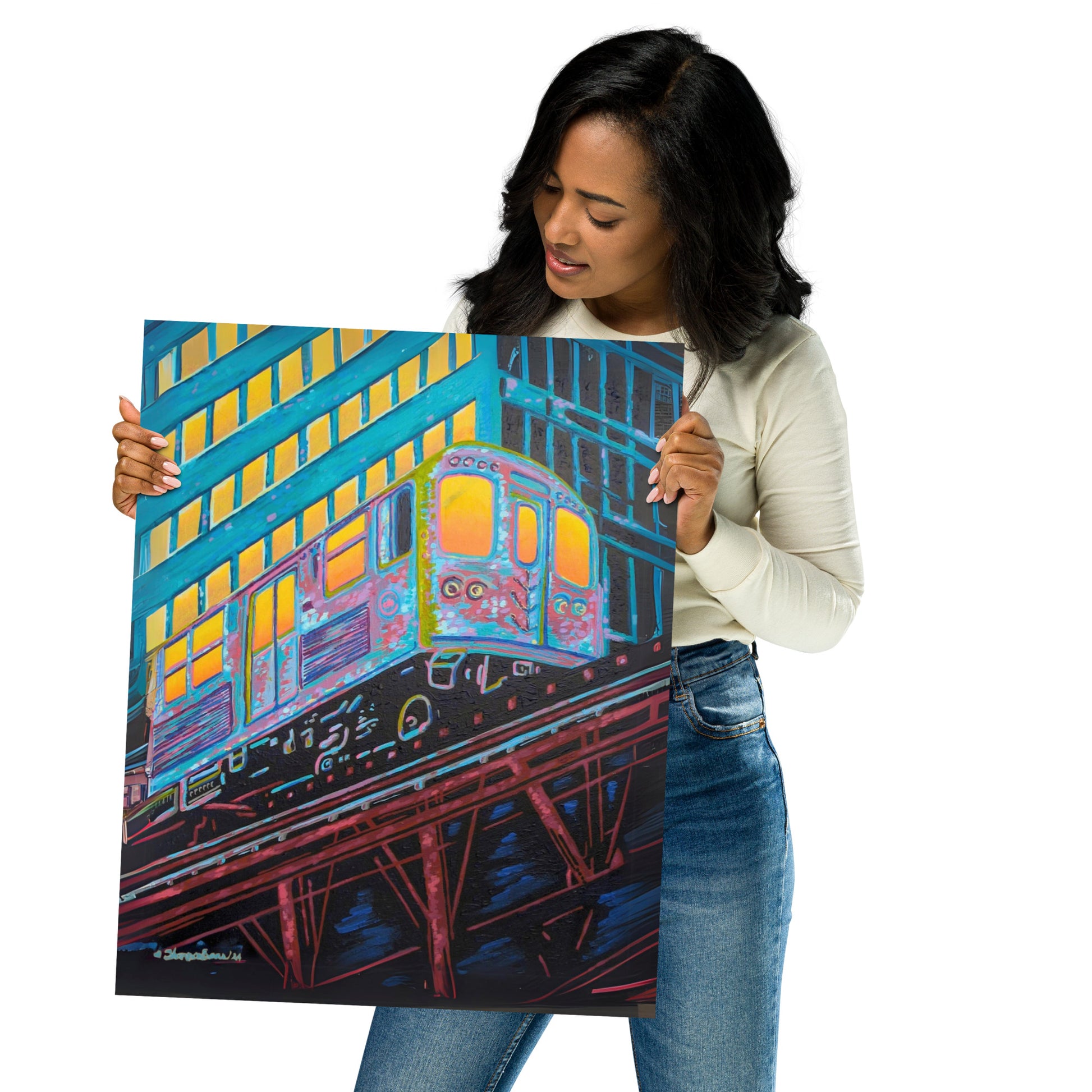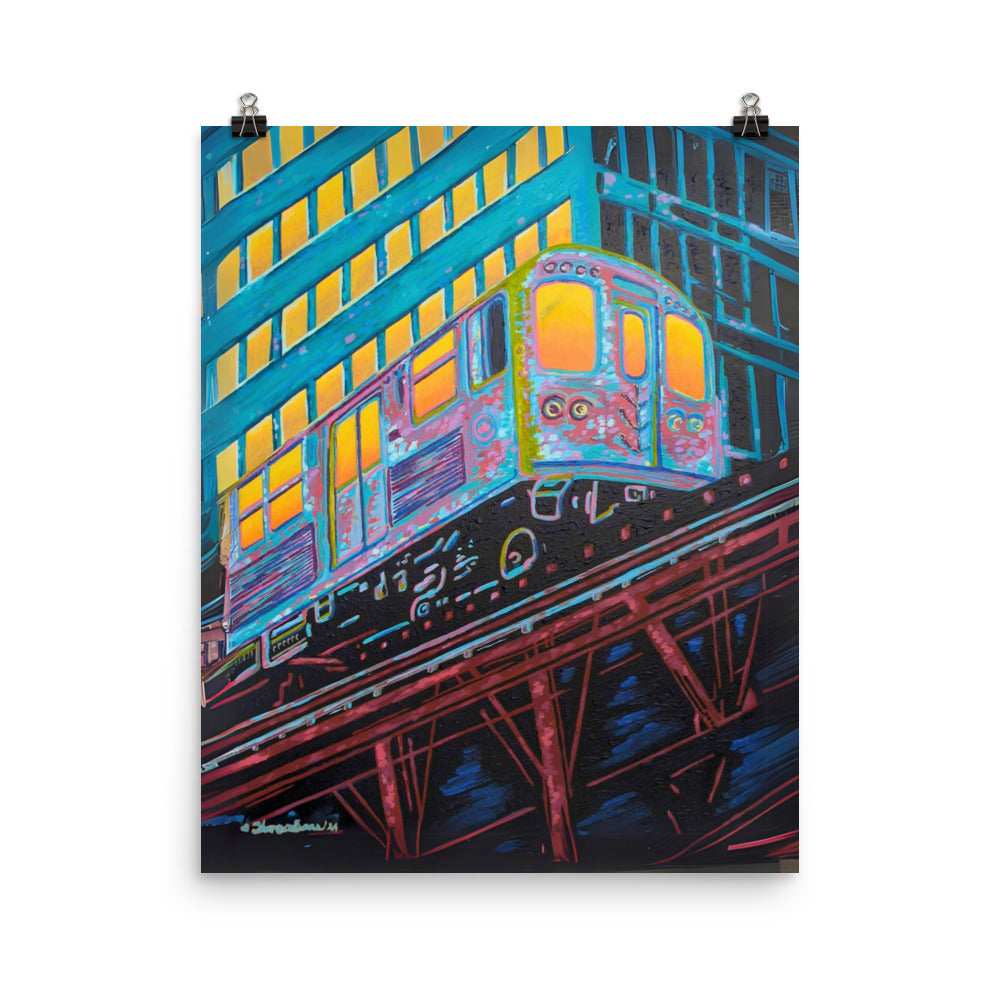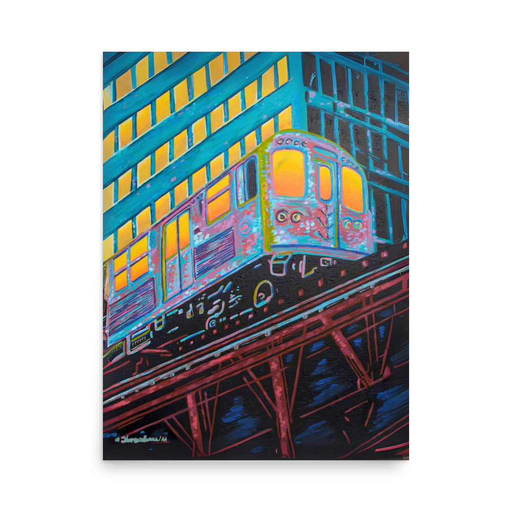 The artist's skillful use of color expressionism breathes life into the cheerful scene, with hues of orange, pink, purple, and steely blue bathing the canvas, reflecting the first light of dawn. The interplay of colors and the sense of speeding motion born from the composition evoke a sense of optimism and anticipation. This distinctive work inspired by the people of Chicago is a fitting addition to any room in need of an energy fix or for those who glow in their hustle.