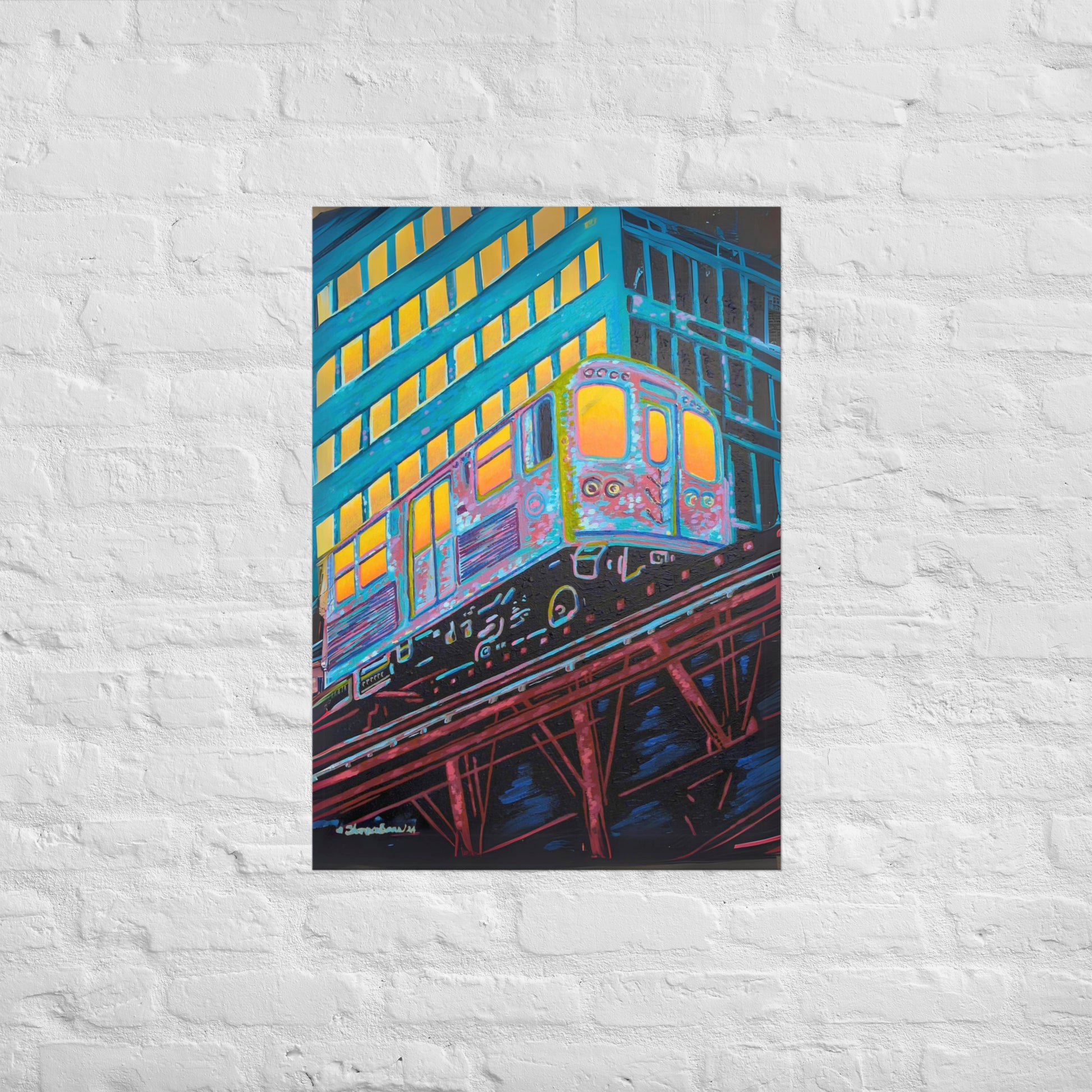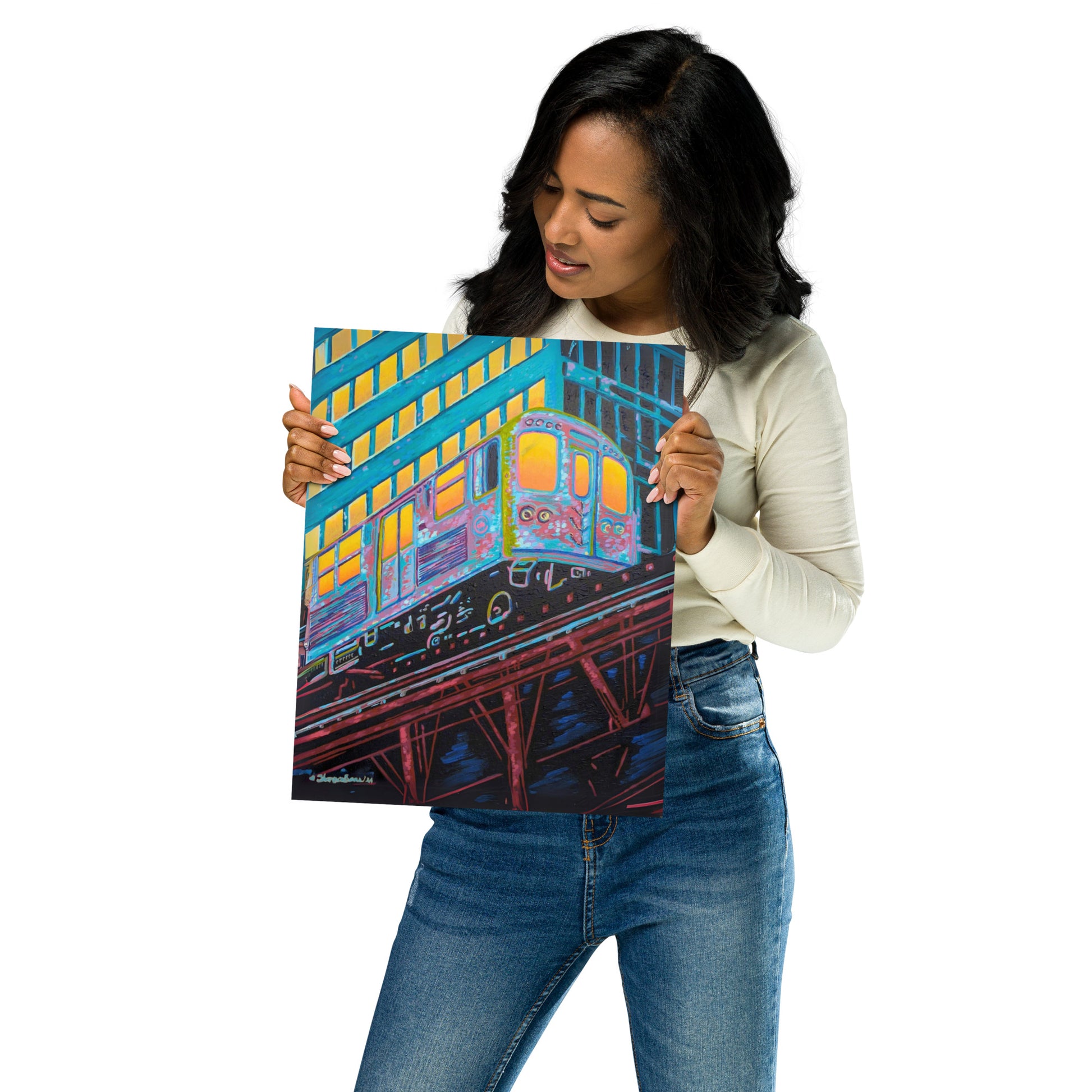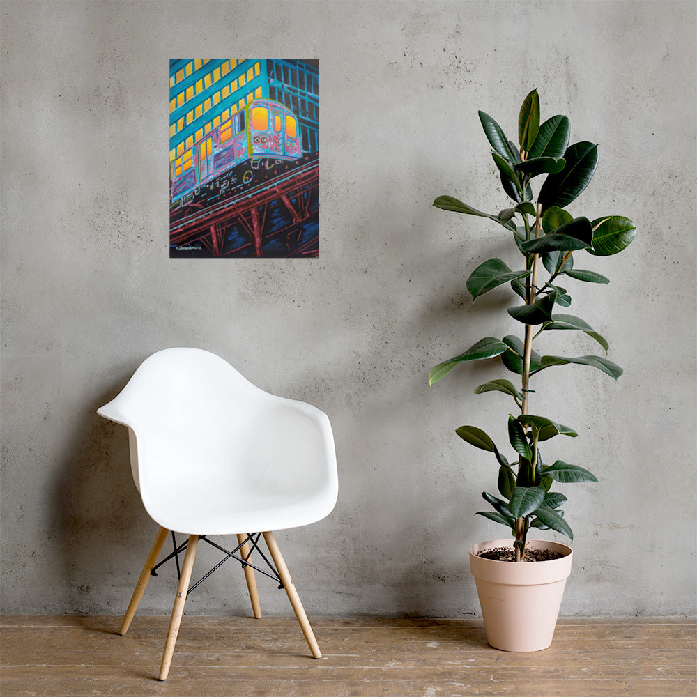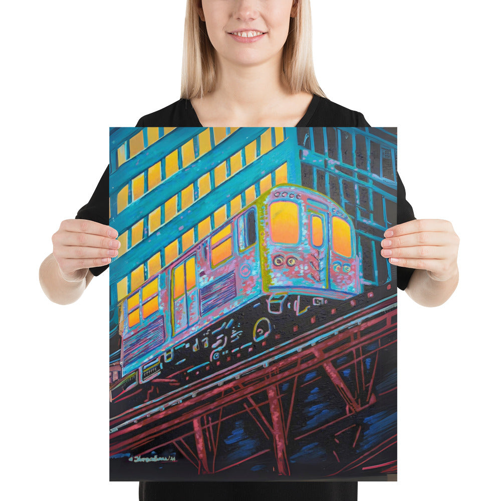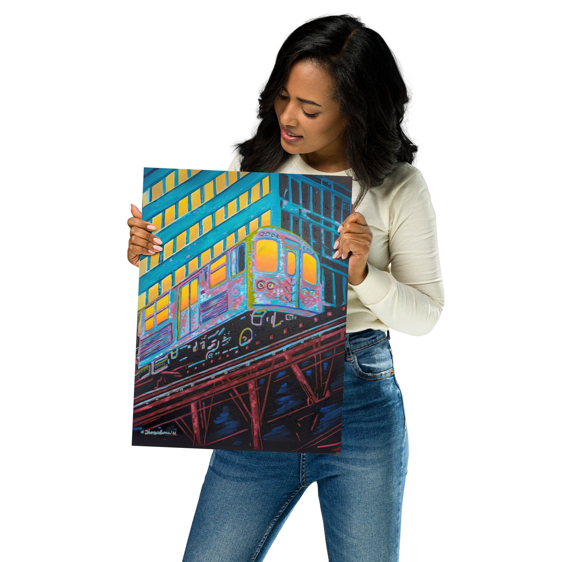 The artist's skillful use of color expressionism breathes life into the cheerful scene, with hues of orange, pink, purple, and steely blue bathing the canvas, reflecting the first light of dawn. The interplay of colors and the sense of speeding motion born from the composition evoke a sense of optimism and anticipation. This distinctive work inspired by the people of Chicago is a fitting addition to any room in need of an energy fix or for those who glow in their hustle.