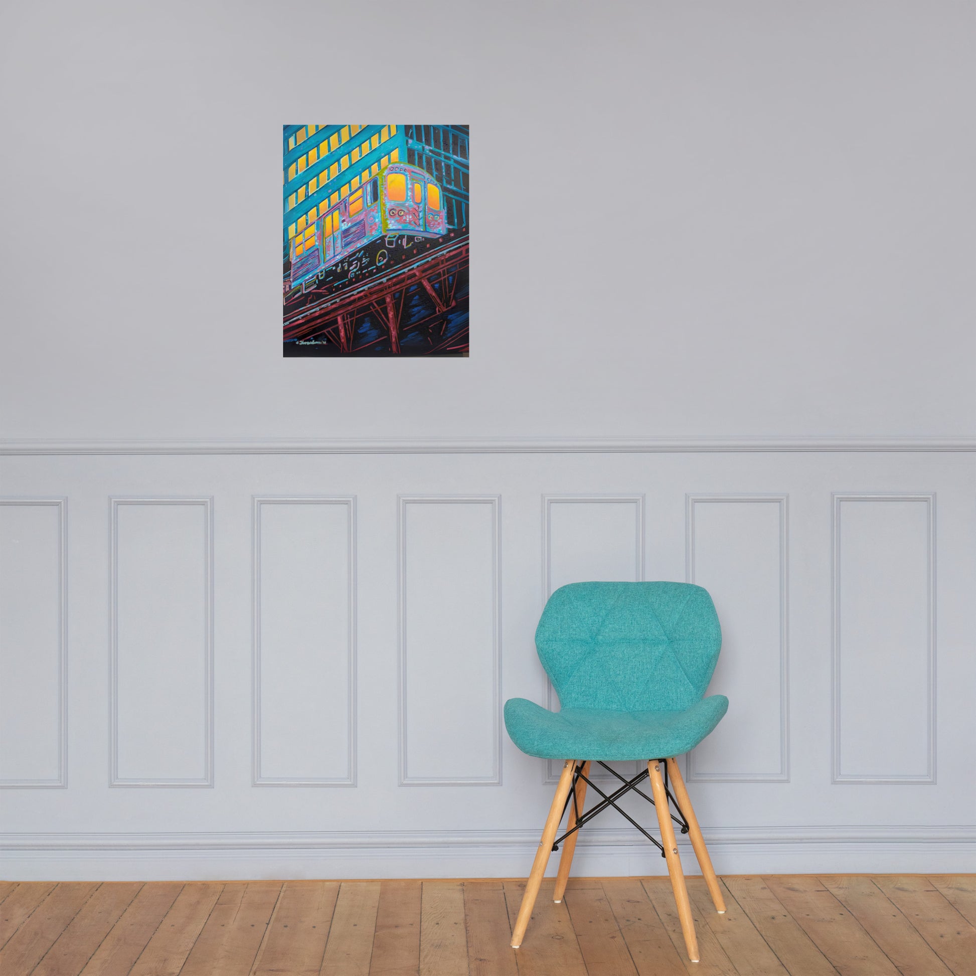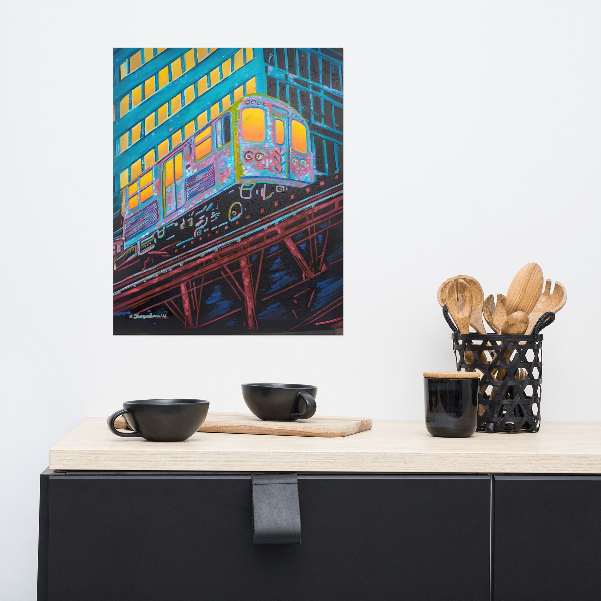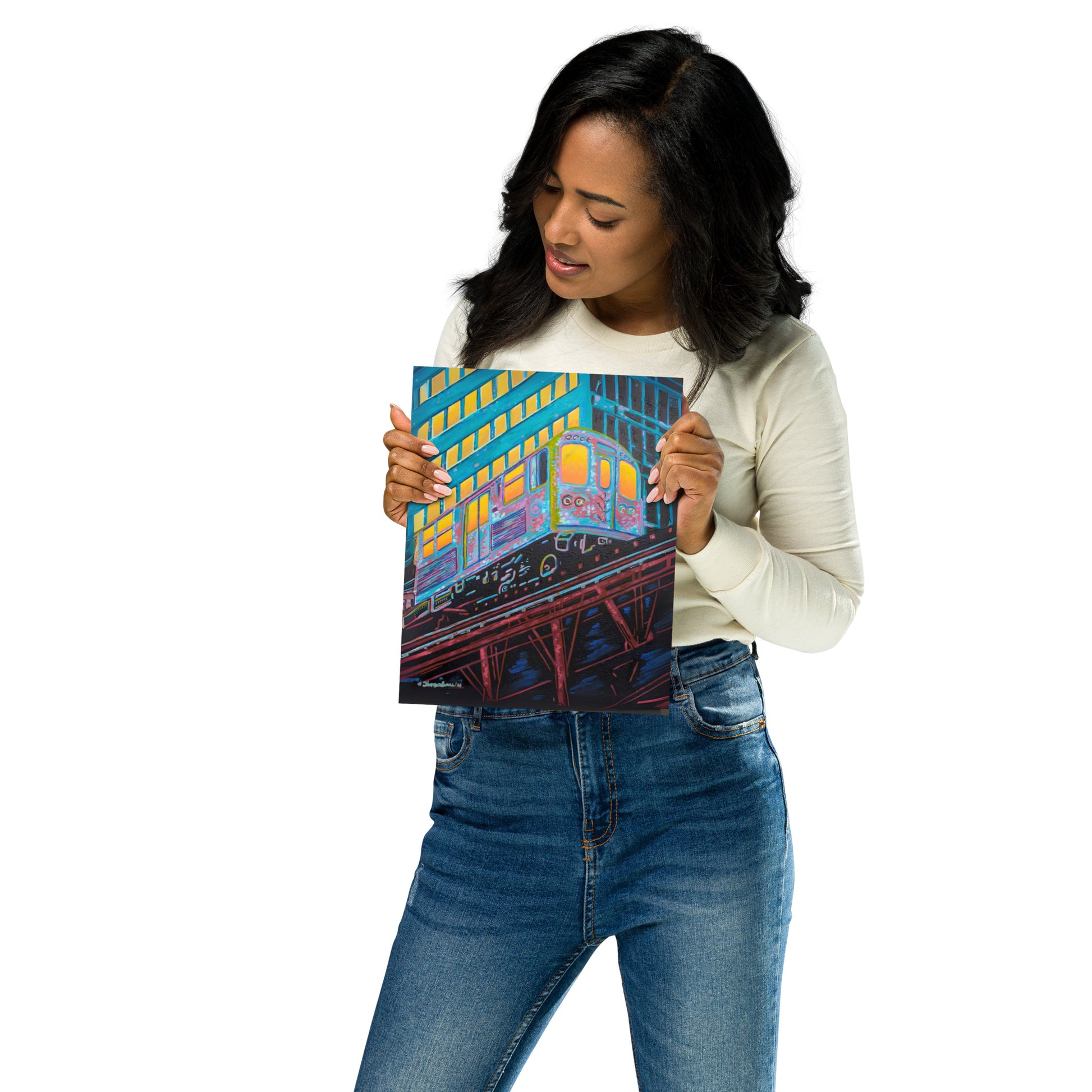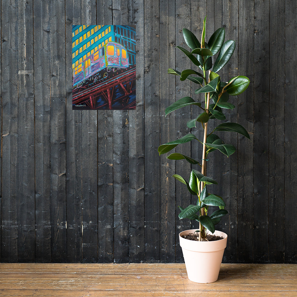 The artist's skillful use of color expressionism breathes life into the cheerful scene, with hues of orange, pink, purple, and steely blue bathing the canvas, reflecting the first light of dawn. The interplay of colors and the sense of speeding motion born from the composition evoke a sense of optimism and anticipation. This distinctive work inspired by the people of Chicago is a fitting addition to any room in need of an energy fix or for those who glow in their hustle.