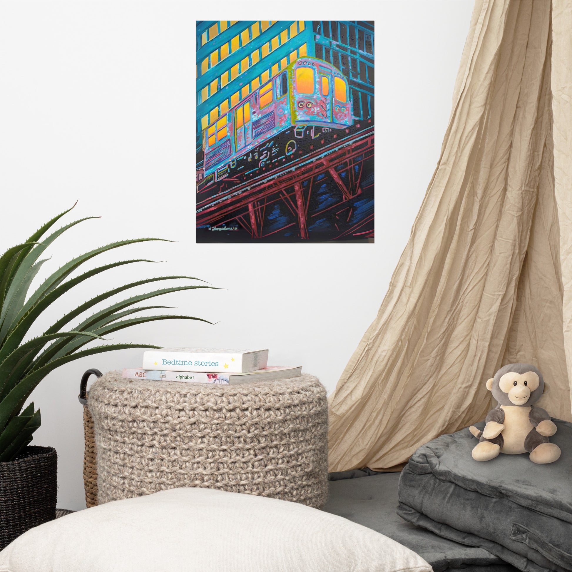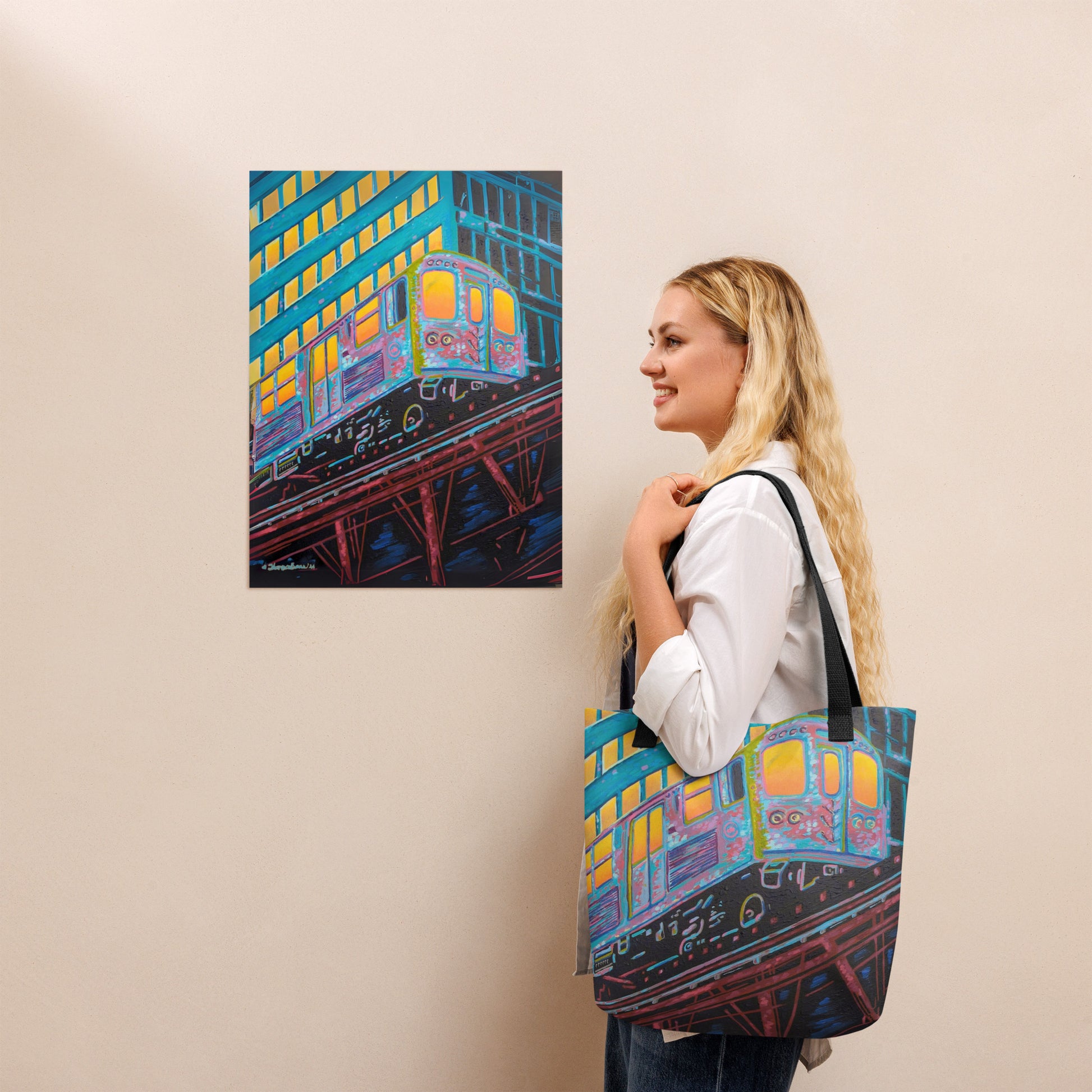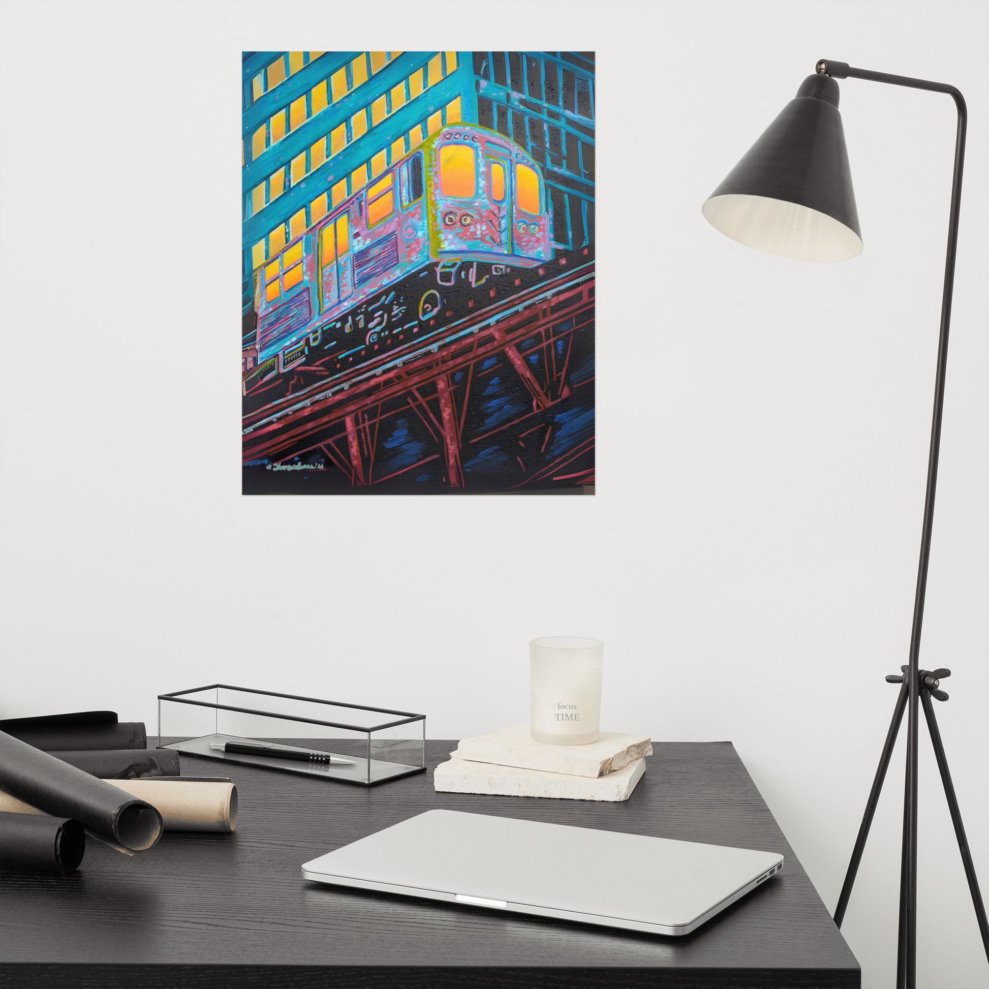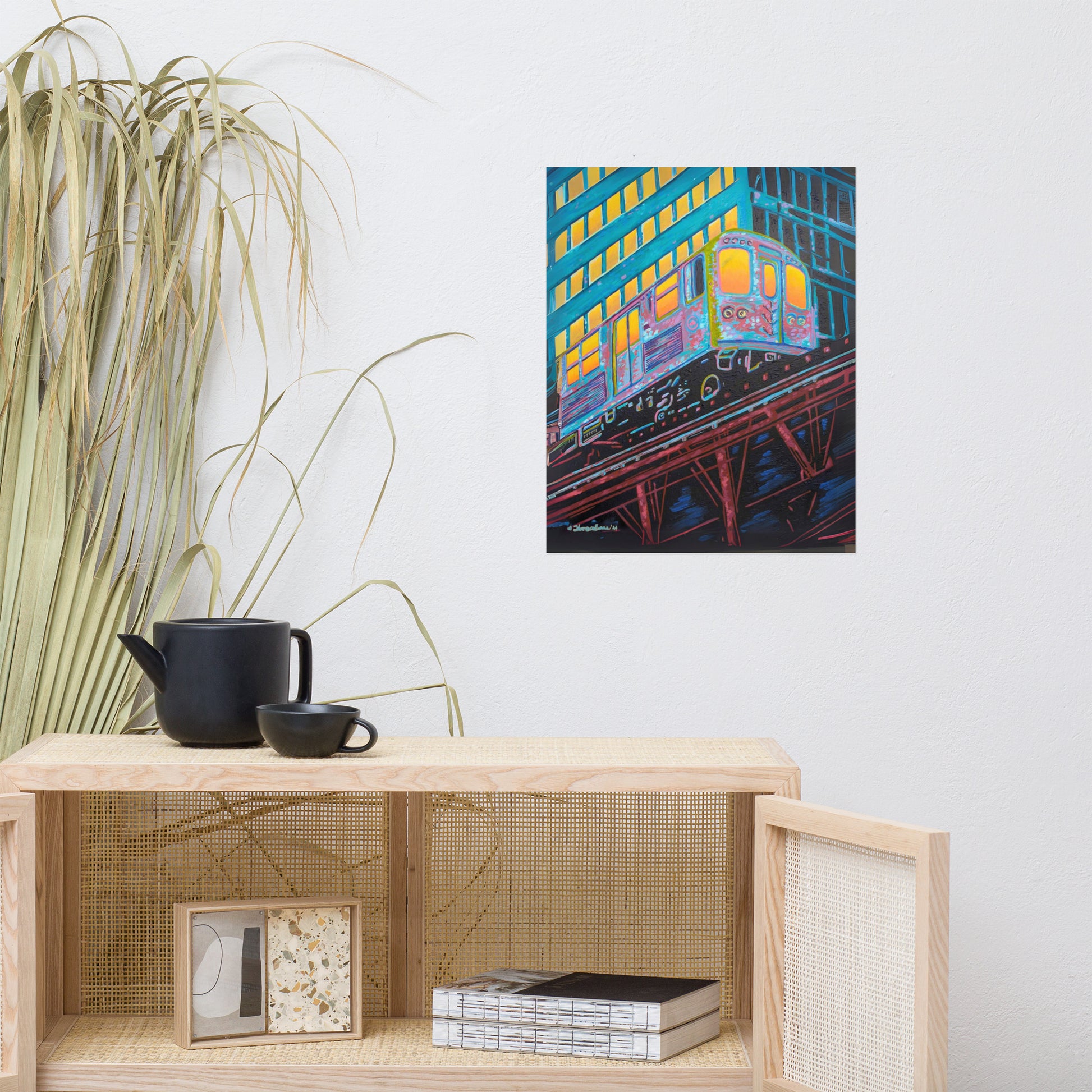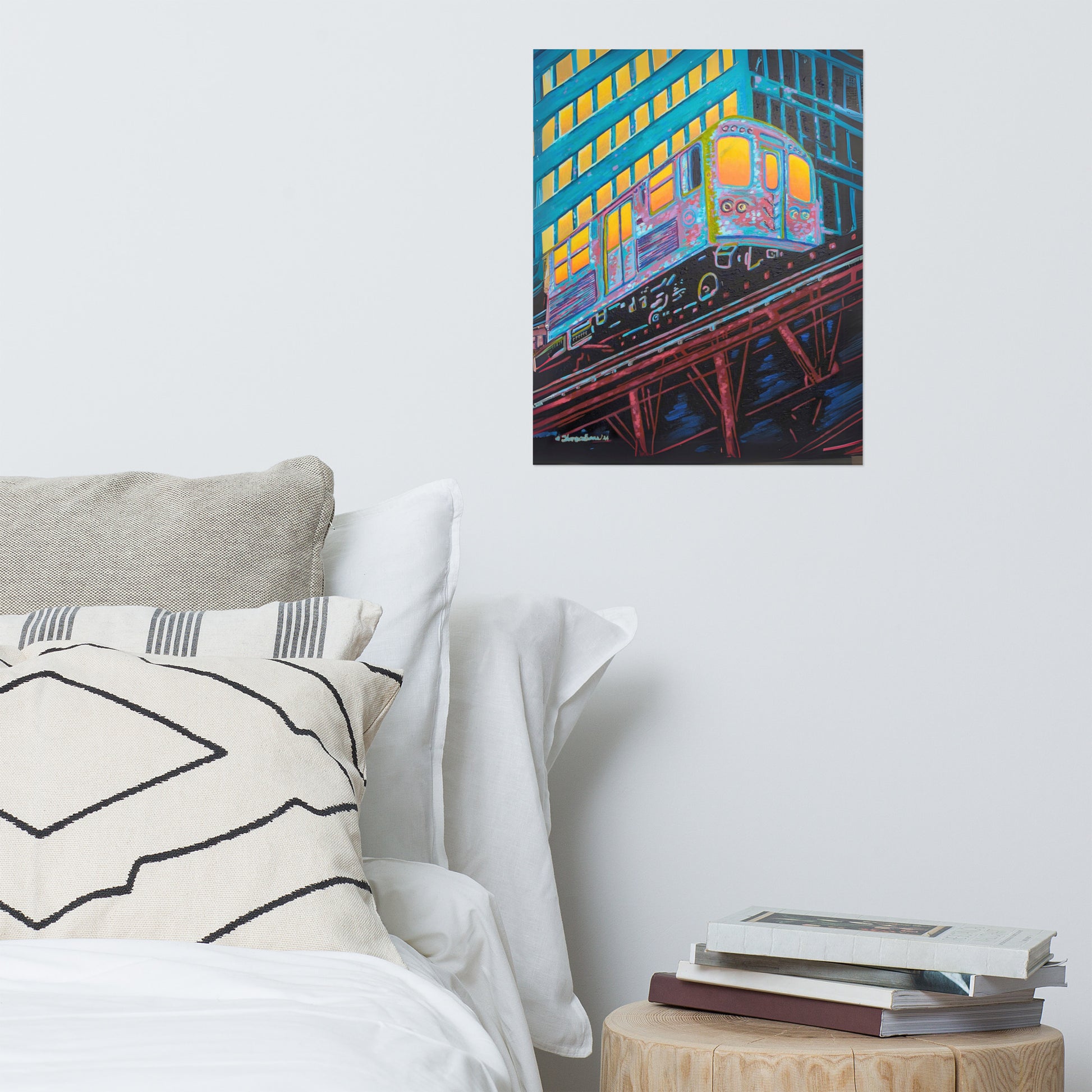 The artist's skillful use of color expressionism breathes life into the cheerful scene, with hues of orange, pink, purple, and steely blue bathing the canvas, reflecting the first light of dawn. The interplay of colors and the sense of speeding motion born from the composition evoke a sense of optimism and anticipation. This distinctive work inspired by the people of Chicago is a fitting addition to any room in need of an energy fix or for those who glow in their hustle.