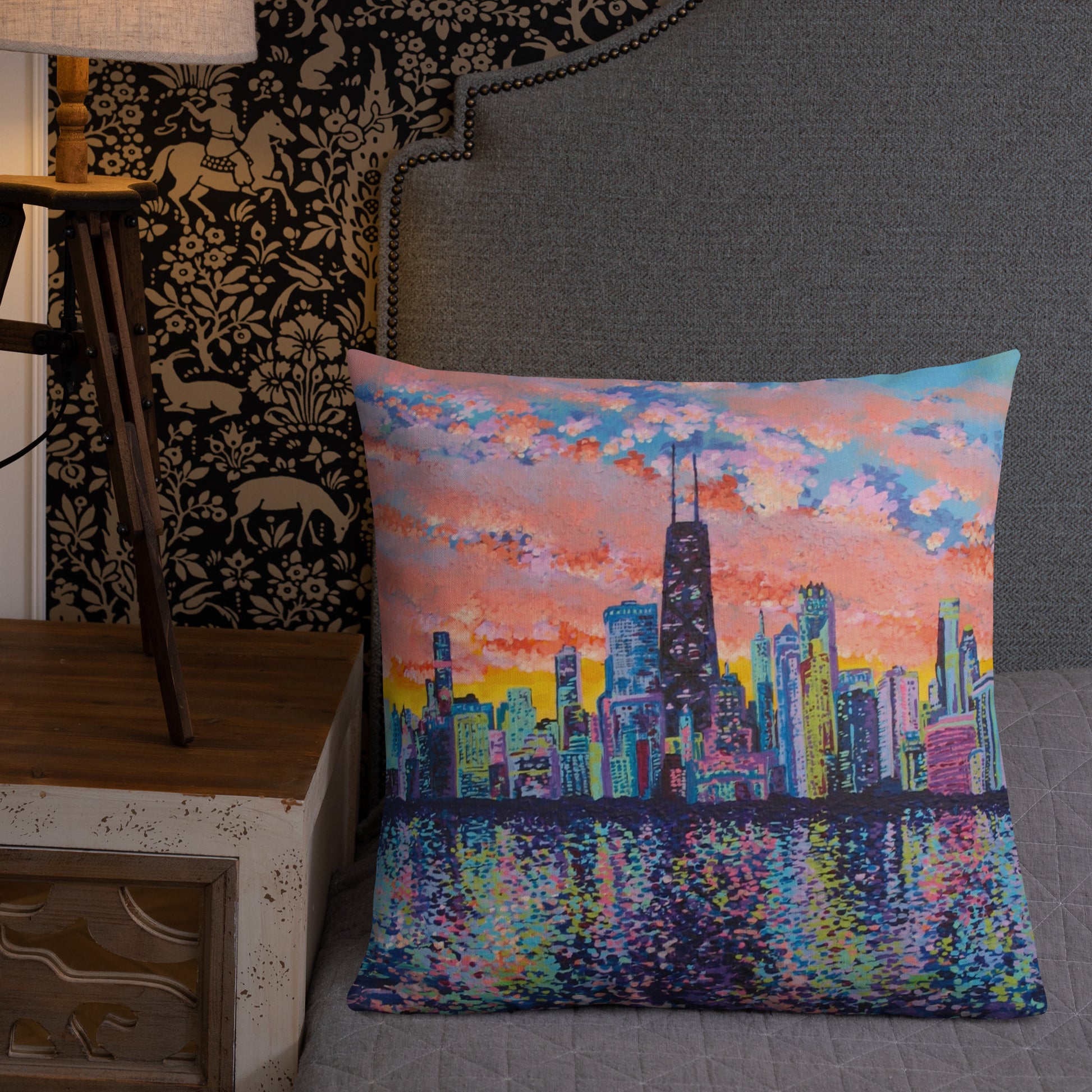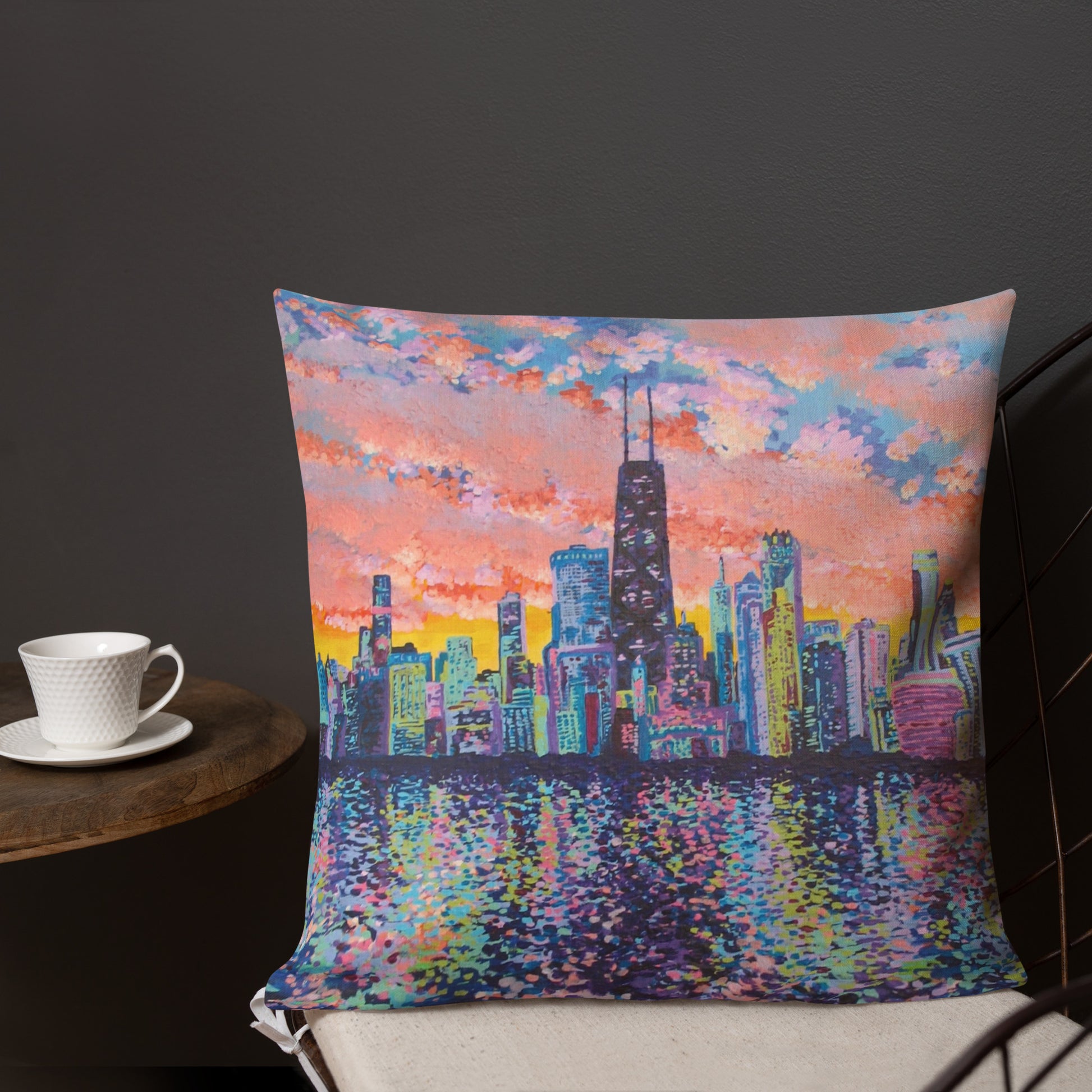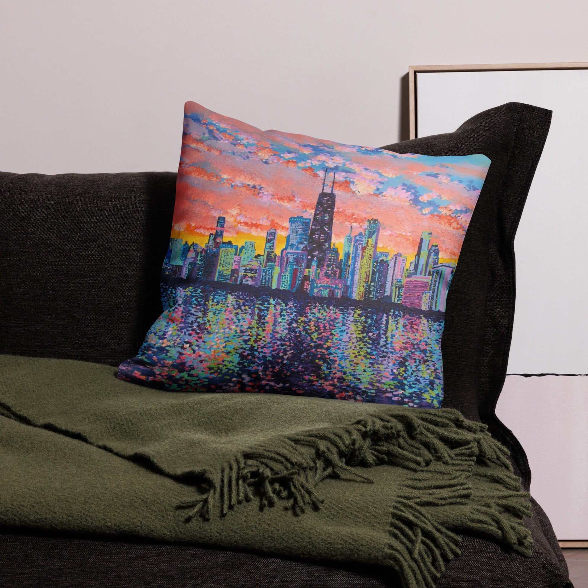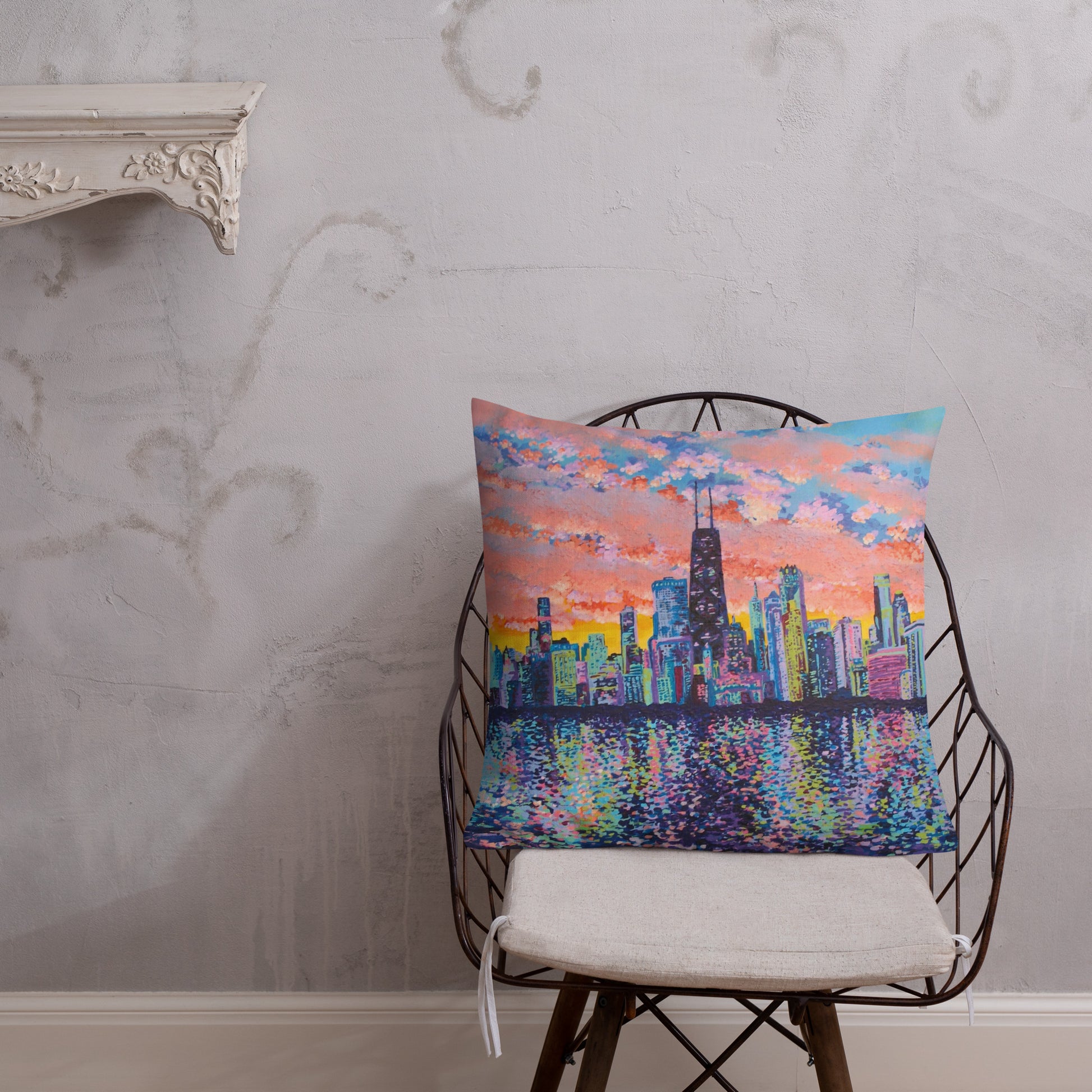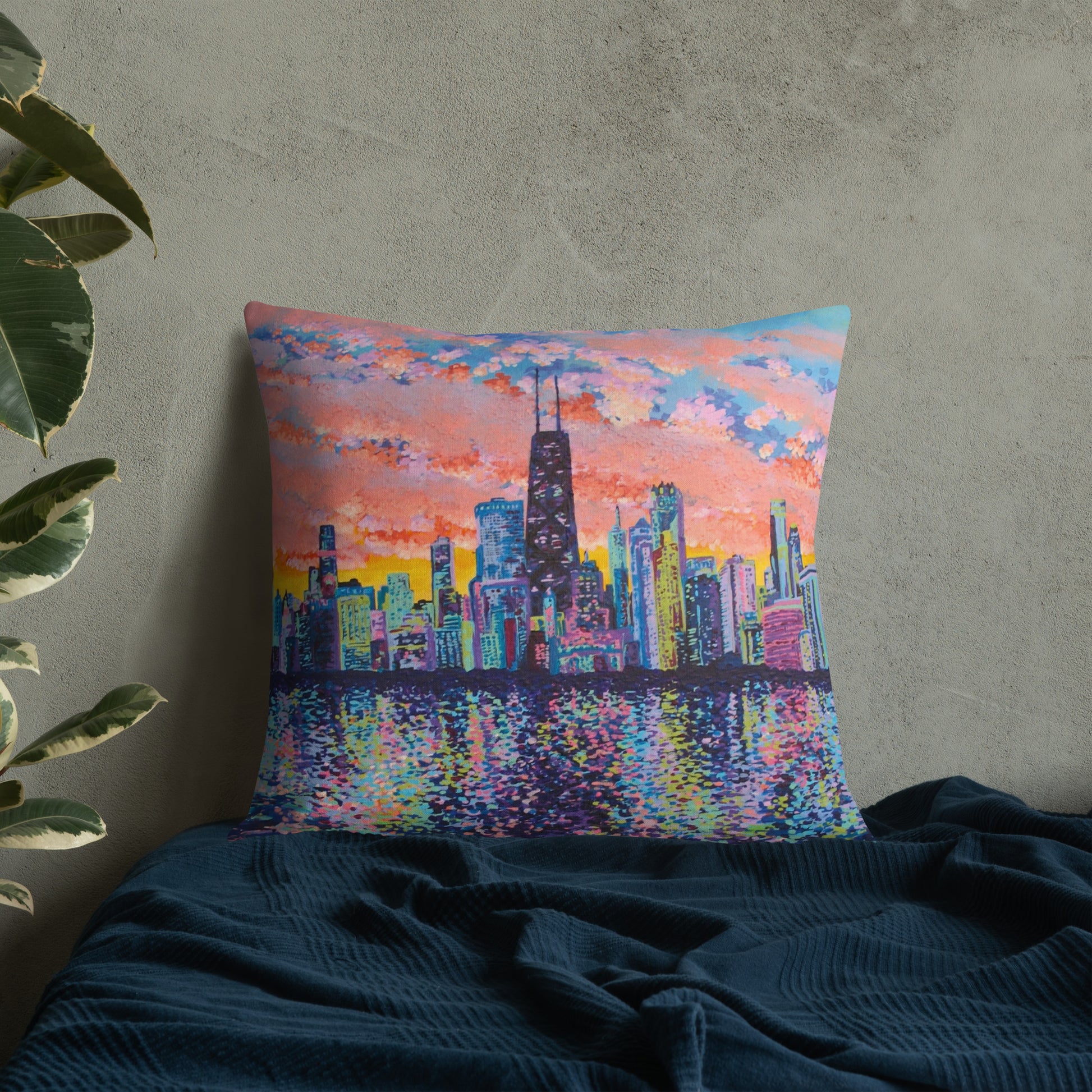This love letter to Chicago explodes with the dynamic energy of the city. Crafted in detailed color expressionism, it depicts the downtown skyline as the sun sets. The city’s iconic silhouette is affectionately mirrored in prismatic color over the glittering waters of Lake Michigan.