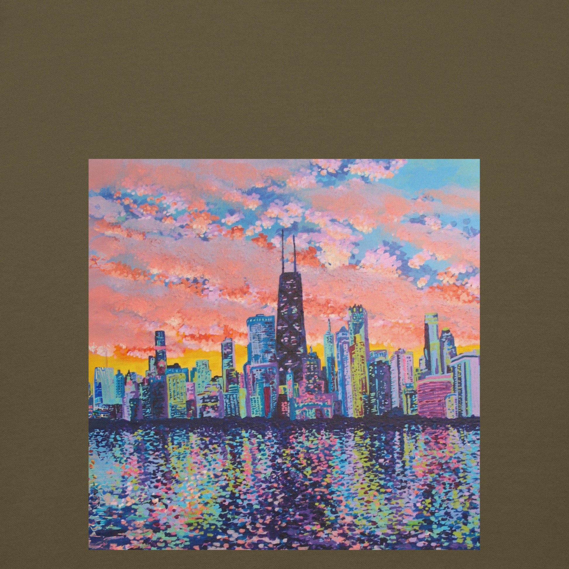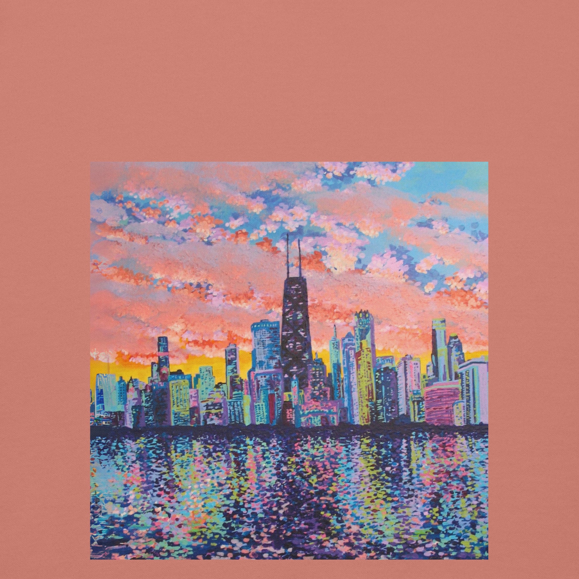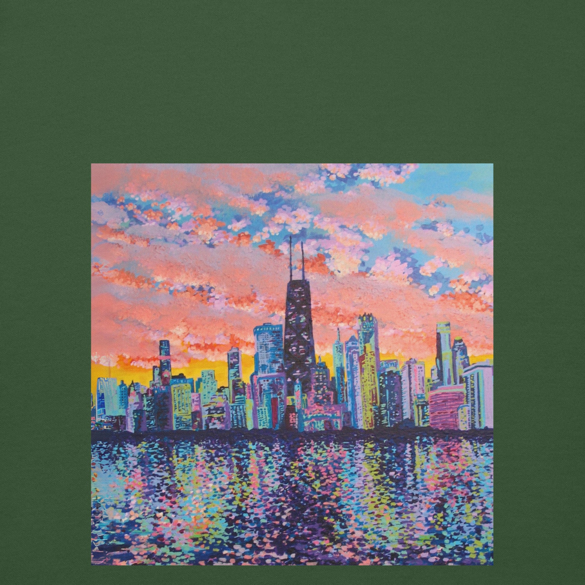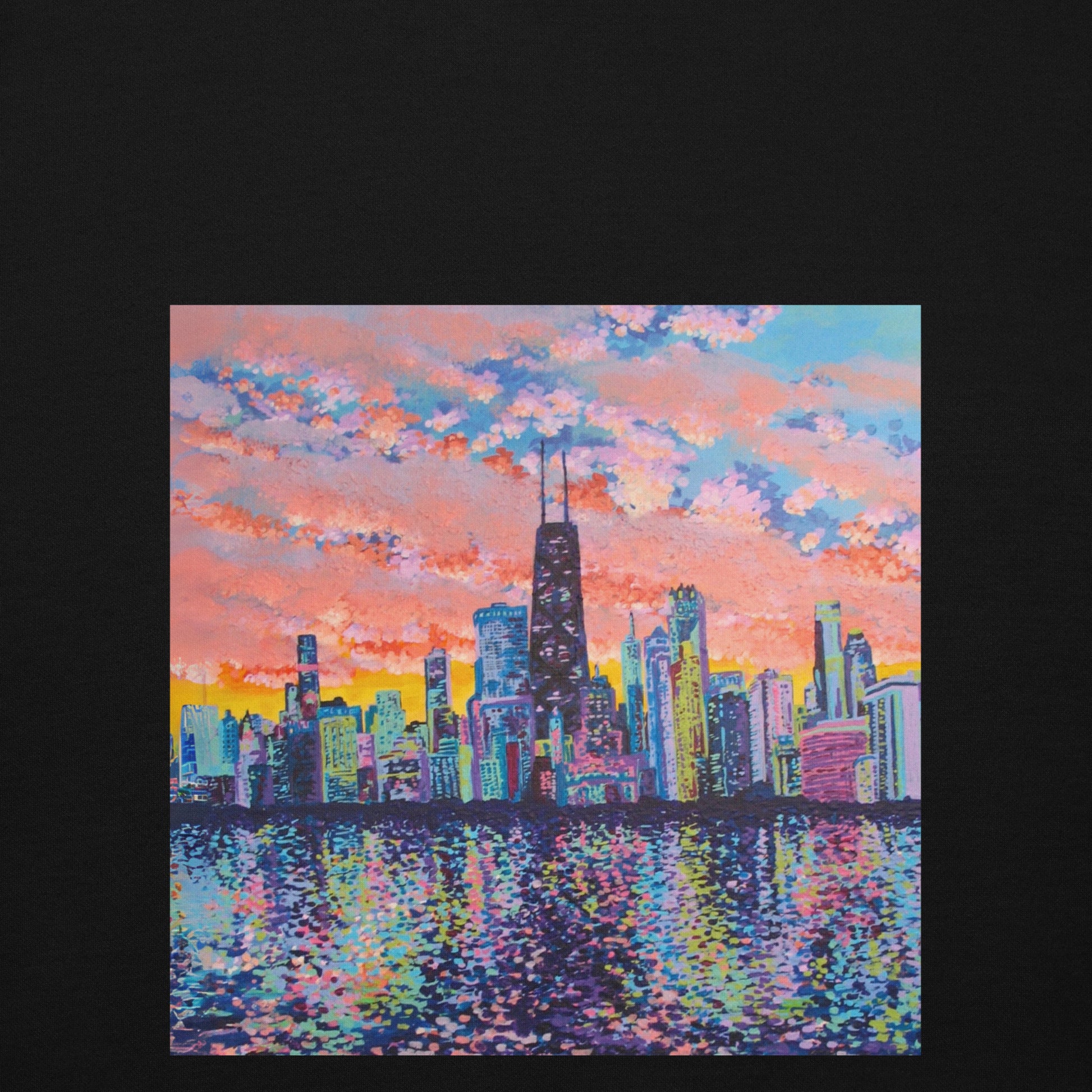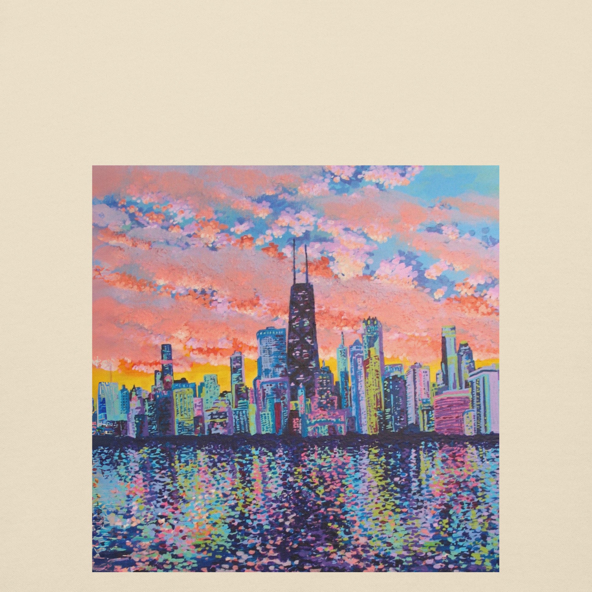 This love letter to Chicago explodes with the dynamic energy of the city. Crafted in detailed color expressionism, it depicts the downtown skyline as the sun sets. The city’s iconic silhouette is affectionately mirrored in prismatic color over the glittering waters of Lake Michigan.