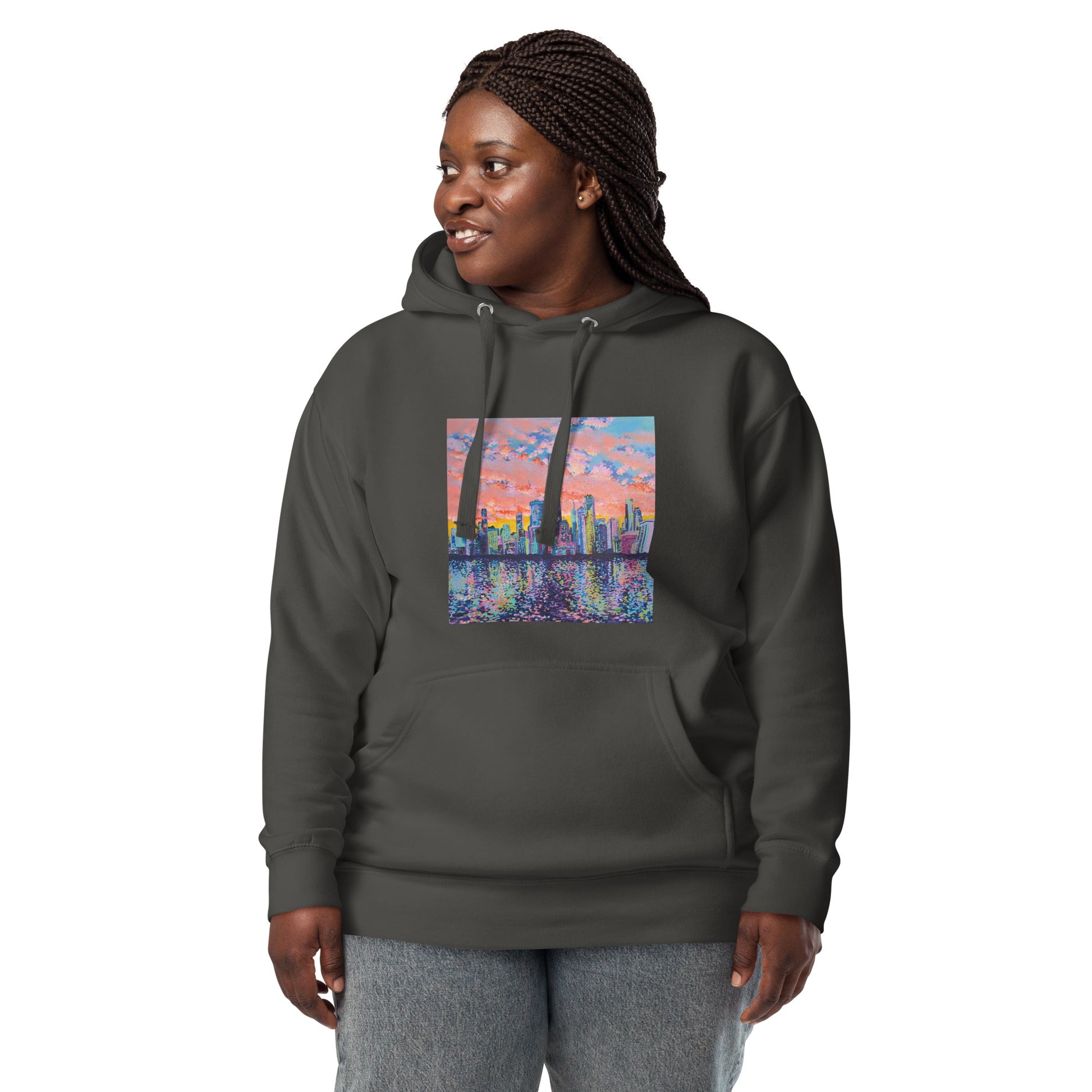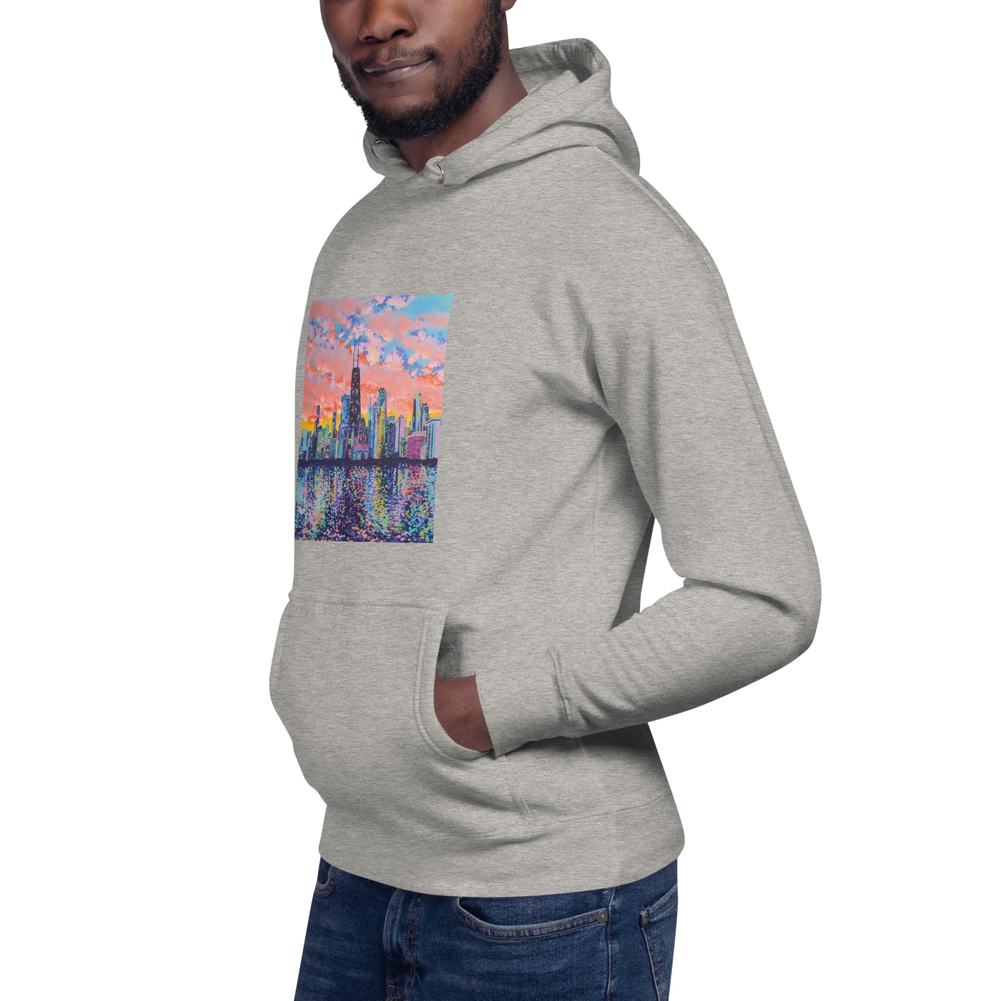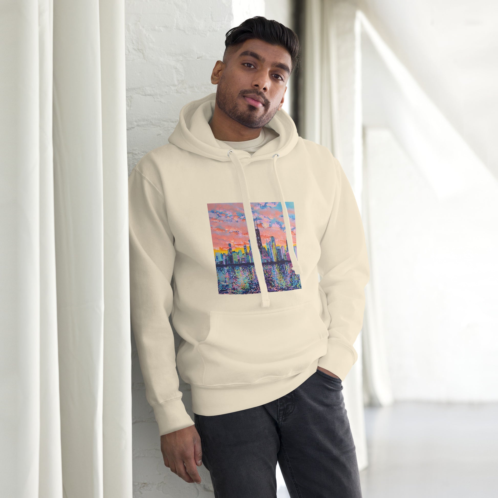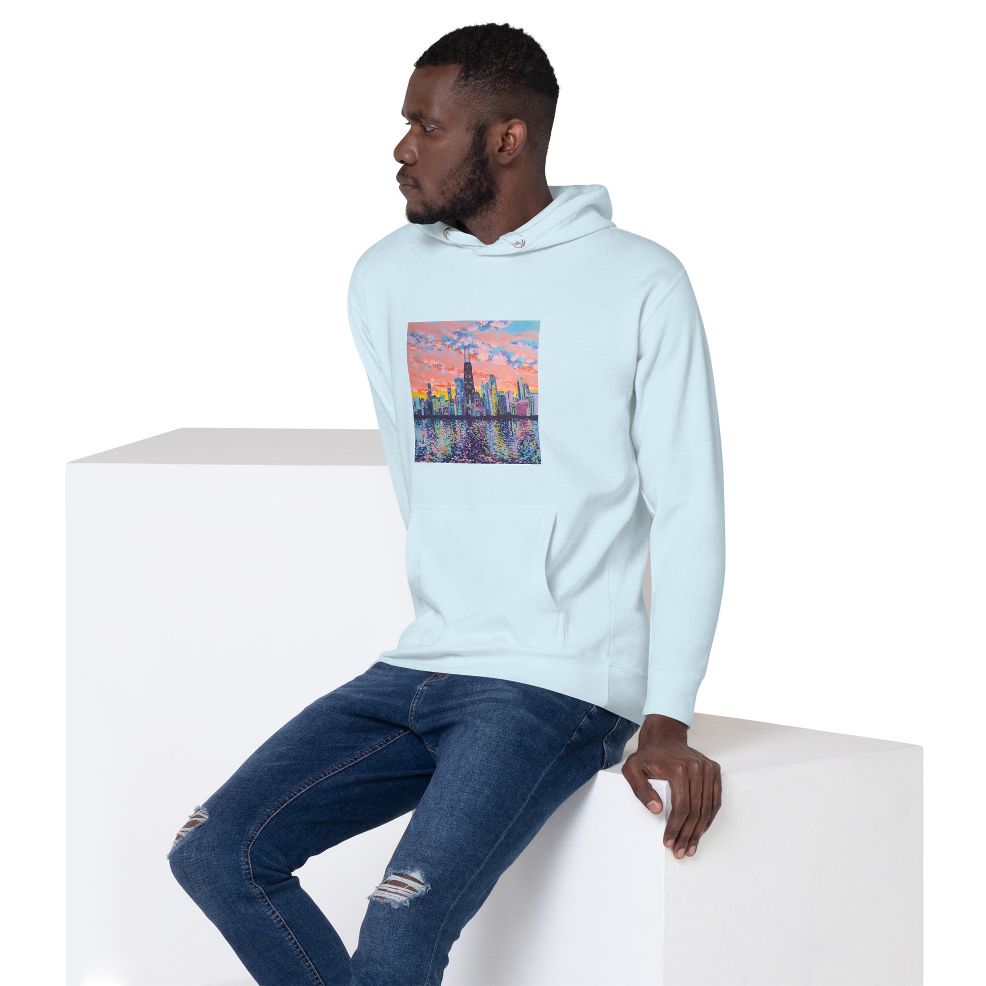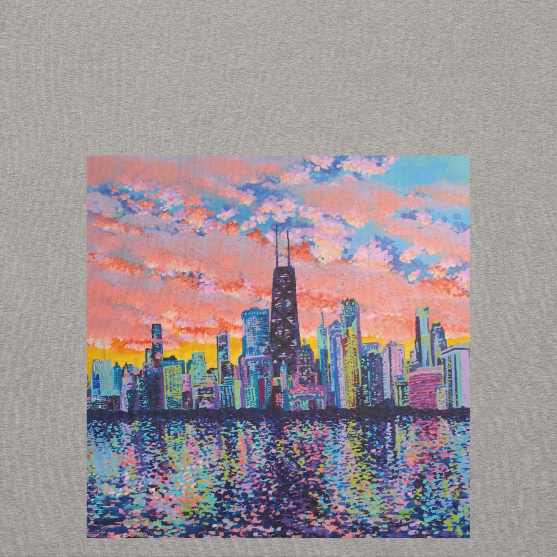 This love letter to Chicago explodes with the dynamic energy of the city. Crafted in detailed color expressionism, it depicts the downtown skyline as the sun sets. The city’s iconic silhouette is affectionately mirrored in prismatic color over the glittering waters of Lake Michigan.