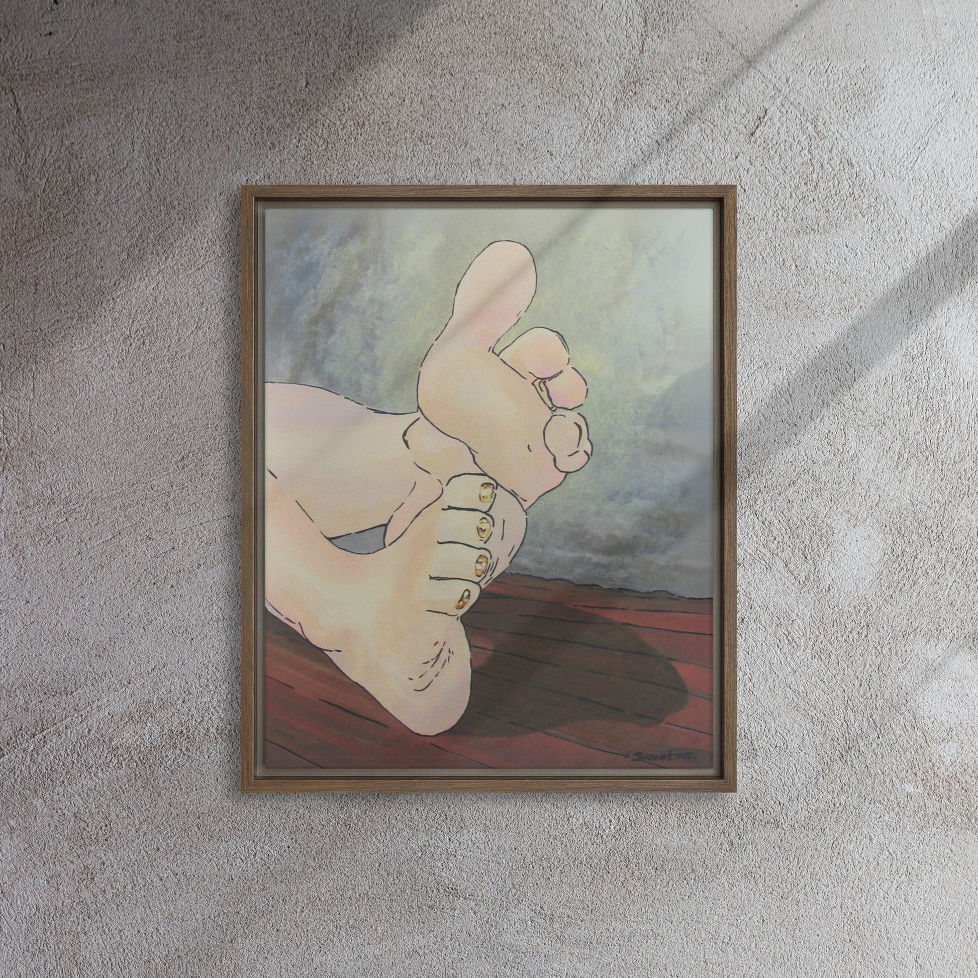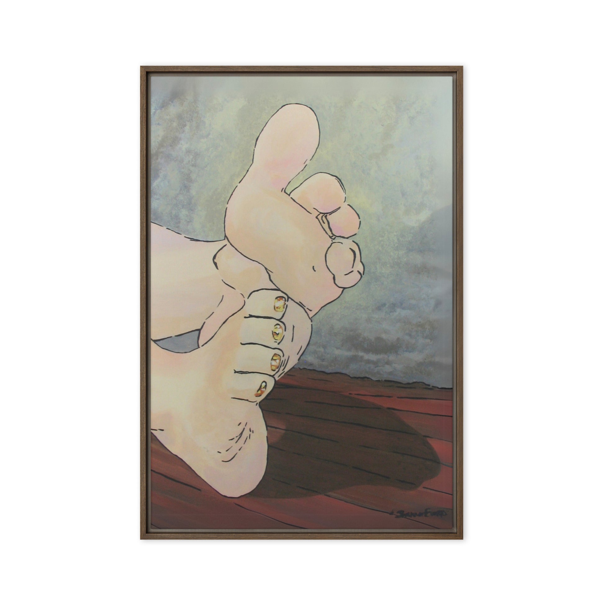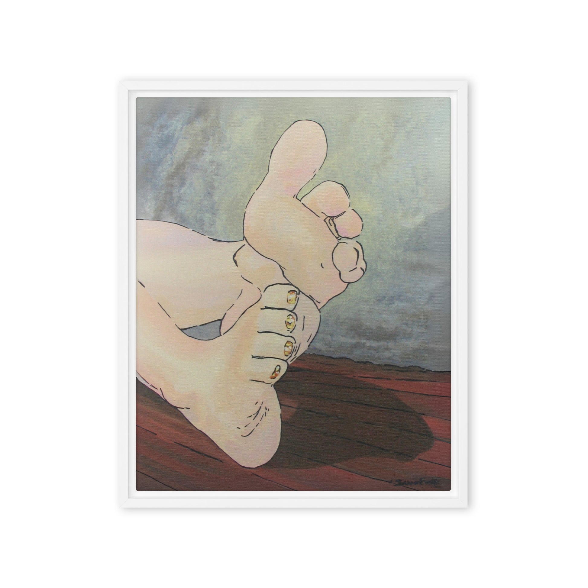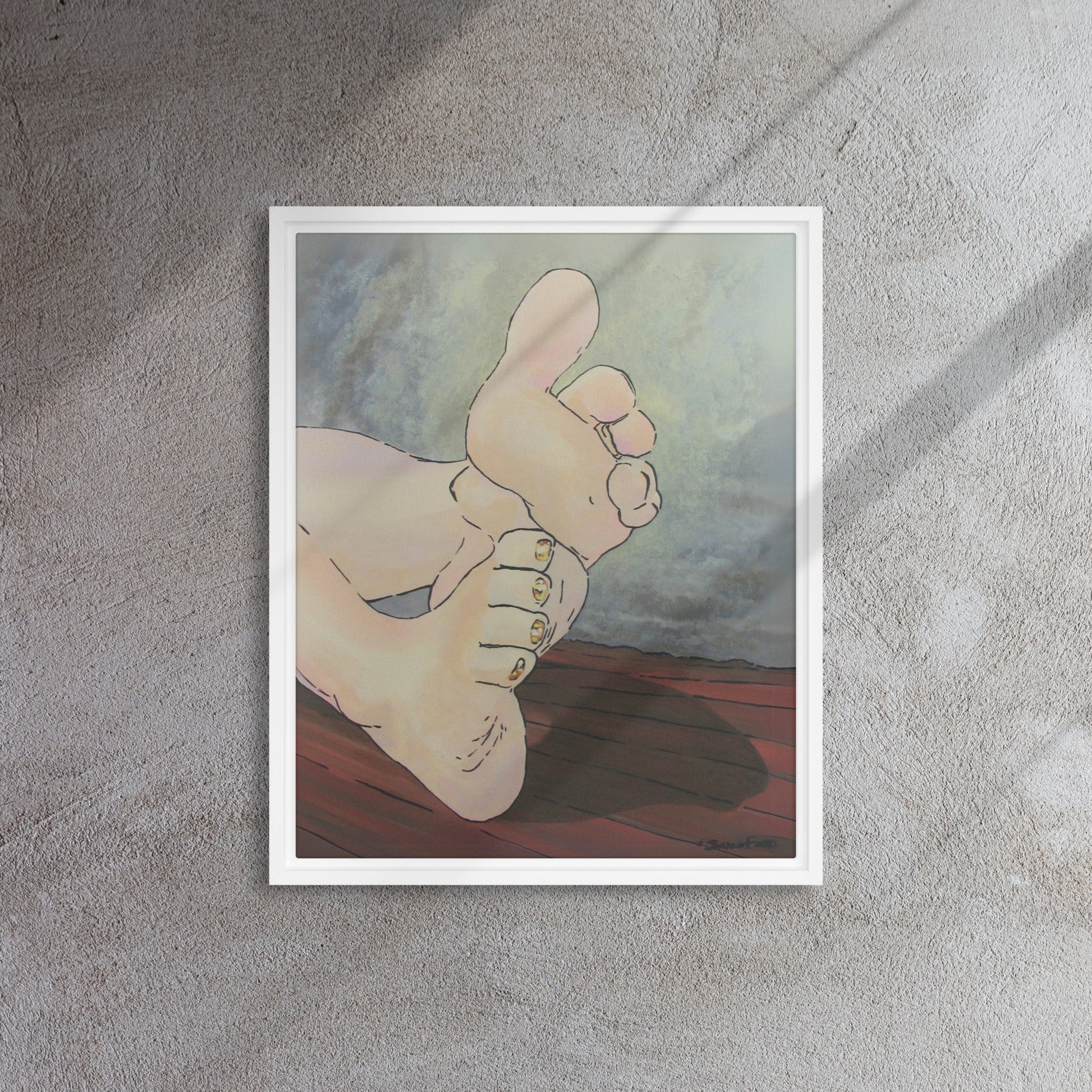 Unveil a hint of sweetness with Golden Confection, a charming artwork that displays the soft soles and plump toes of a pair of feminine feet, adorned with her gold, sparkly pedicure. With every glance, the golden shimmer of her toenail polish reflects an enchanting play of light as each pink toe bends into a treat.