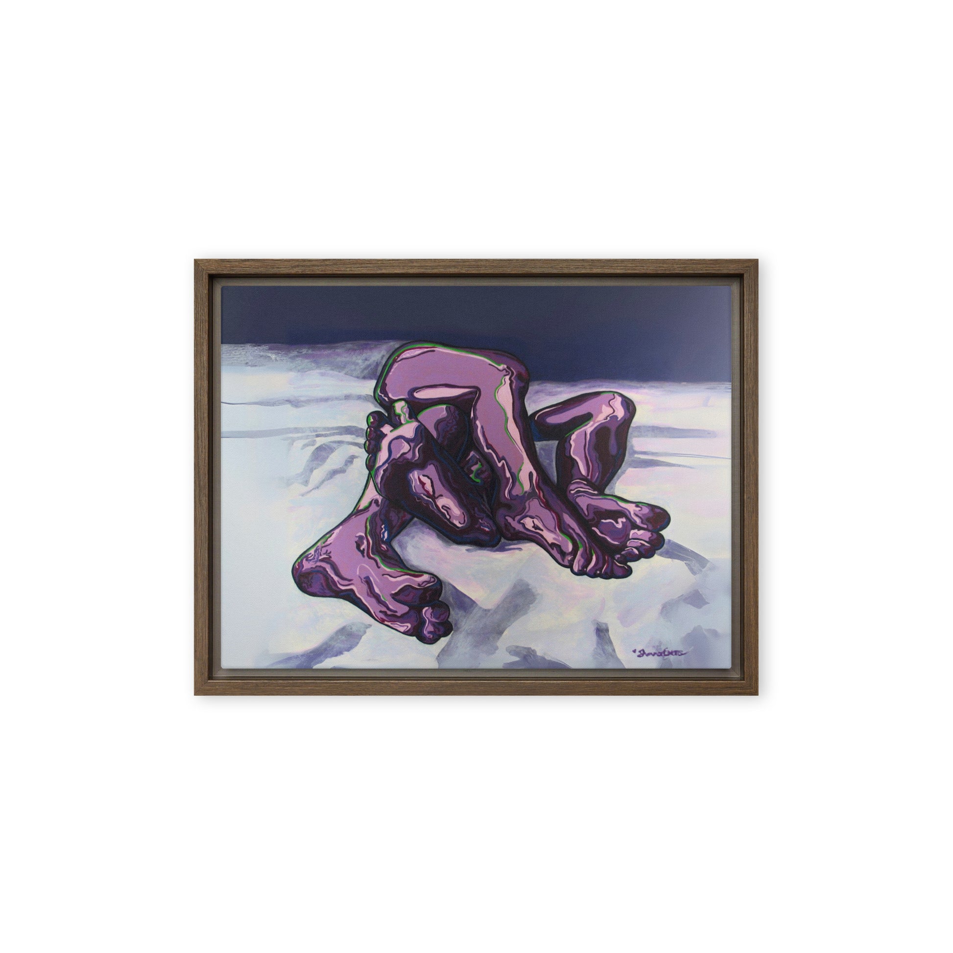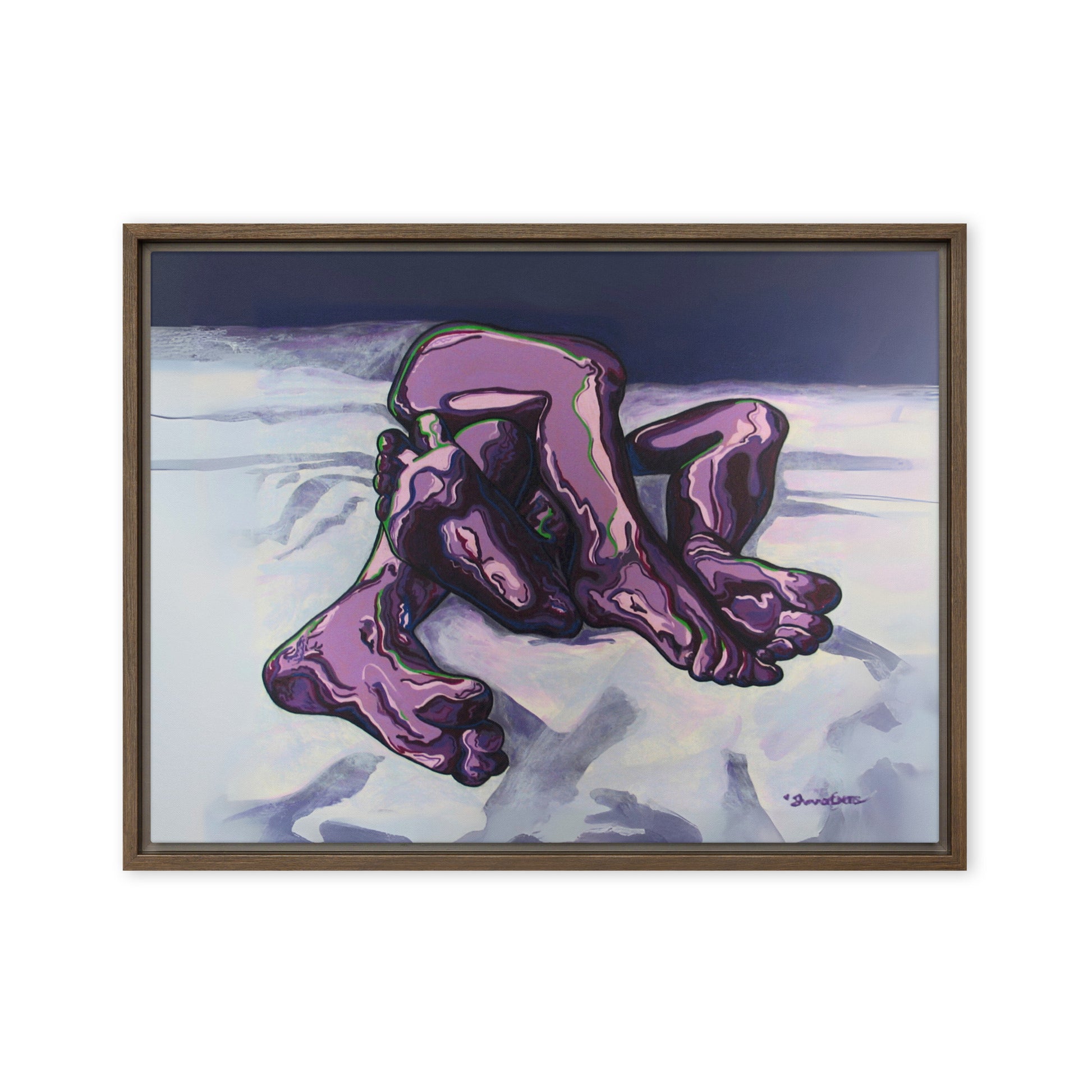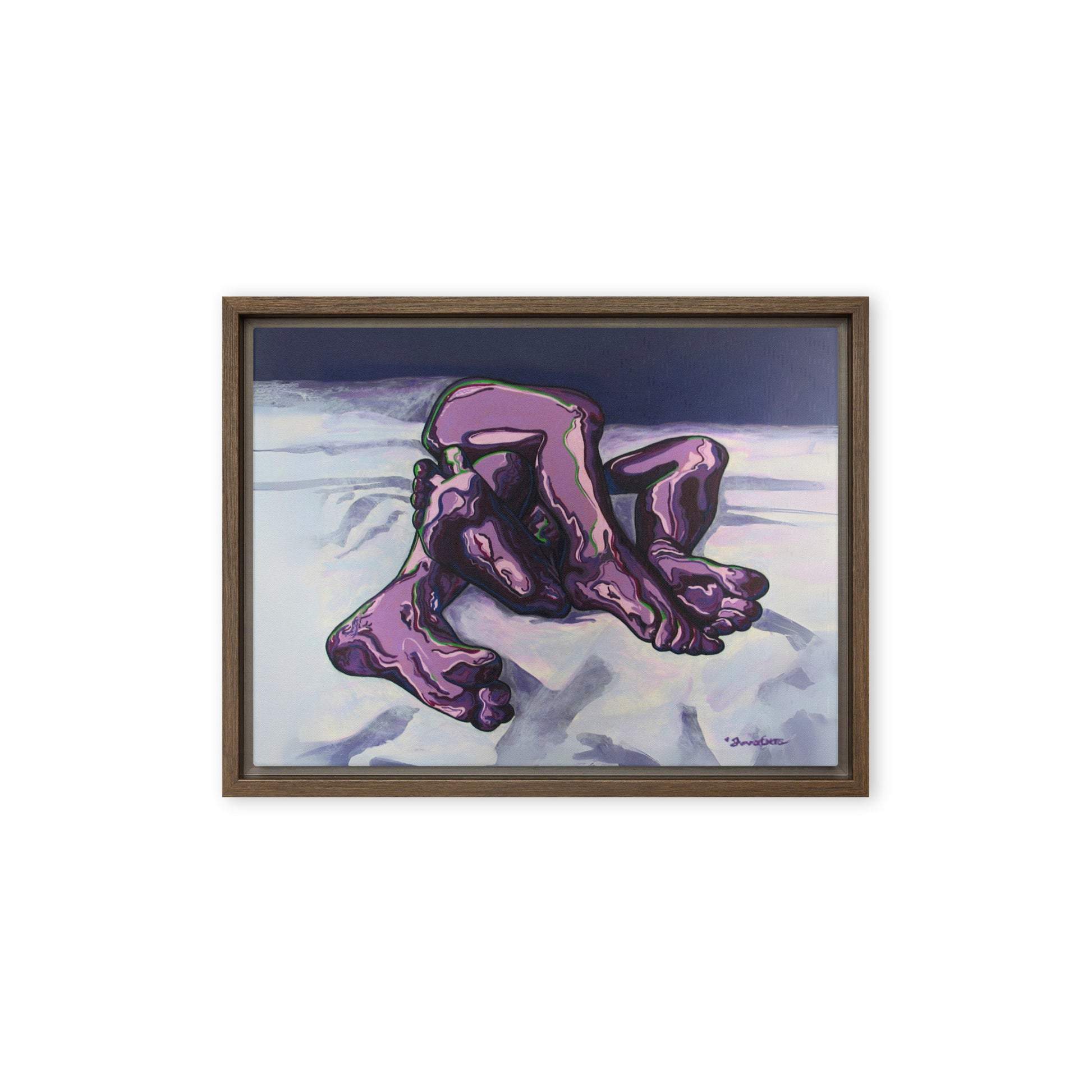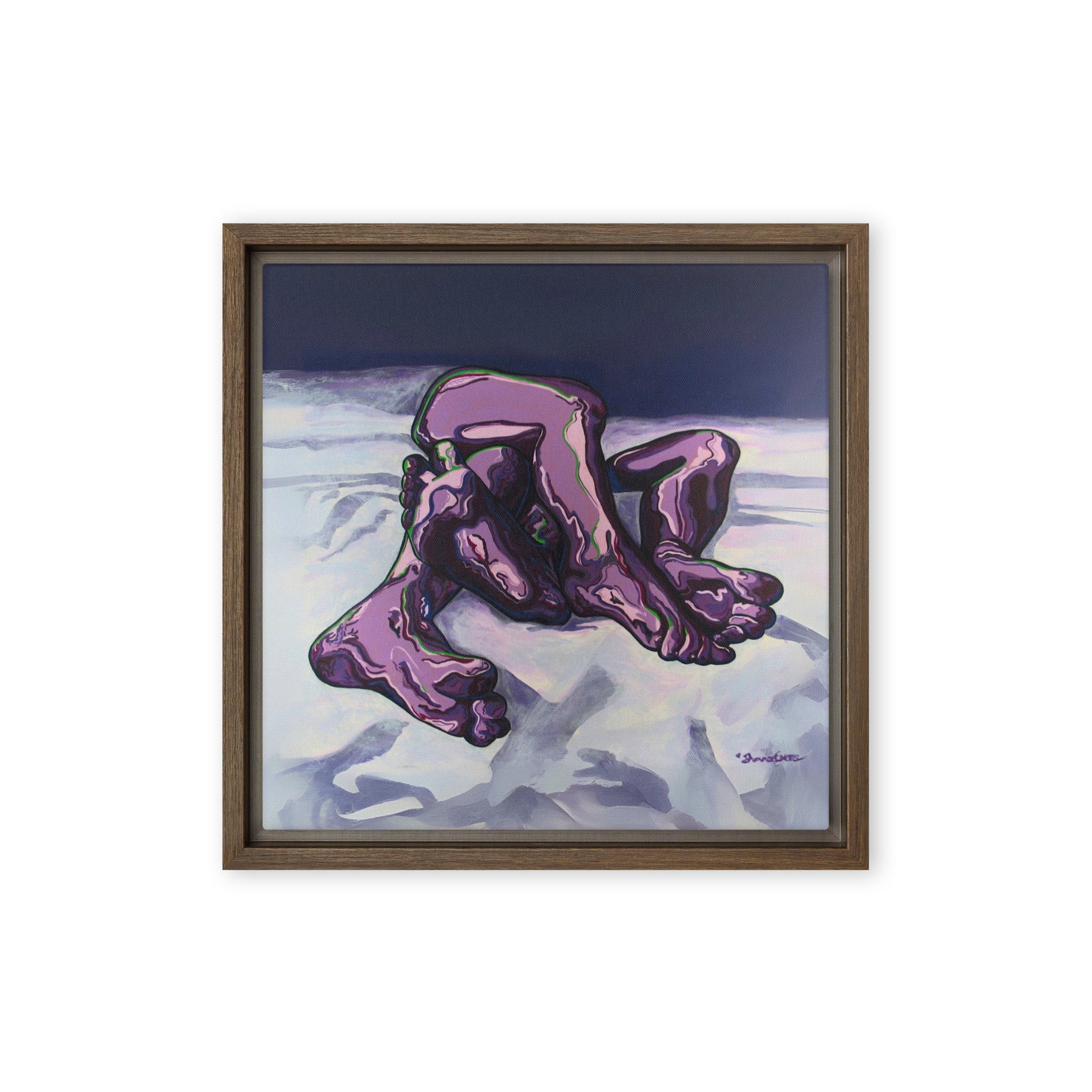 Join in the spark of this passionate moment ignited through the compelling imagery of I Know by Shannon Evans. Dominated by velvety shades of purple, this sensual painting is punctuated with vibrant accents that bring out its charismatic charge. We find ourselves drawn into an intimate scene exploring the entwined feet and legs of two lovers lazily piled together as they embrace in bed.