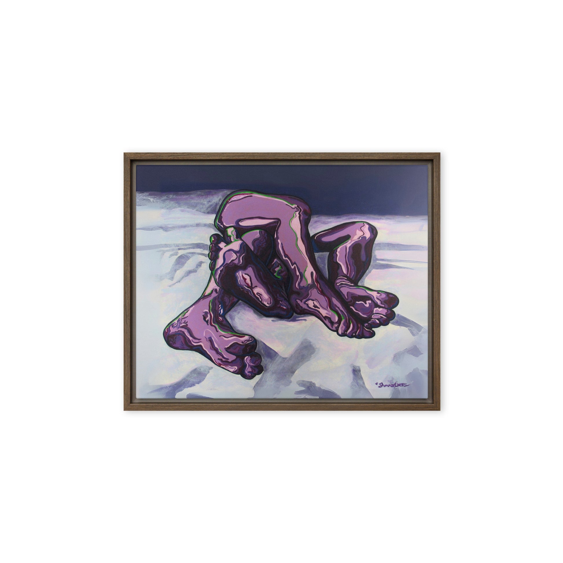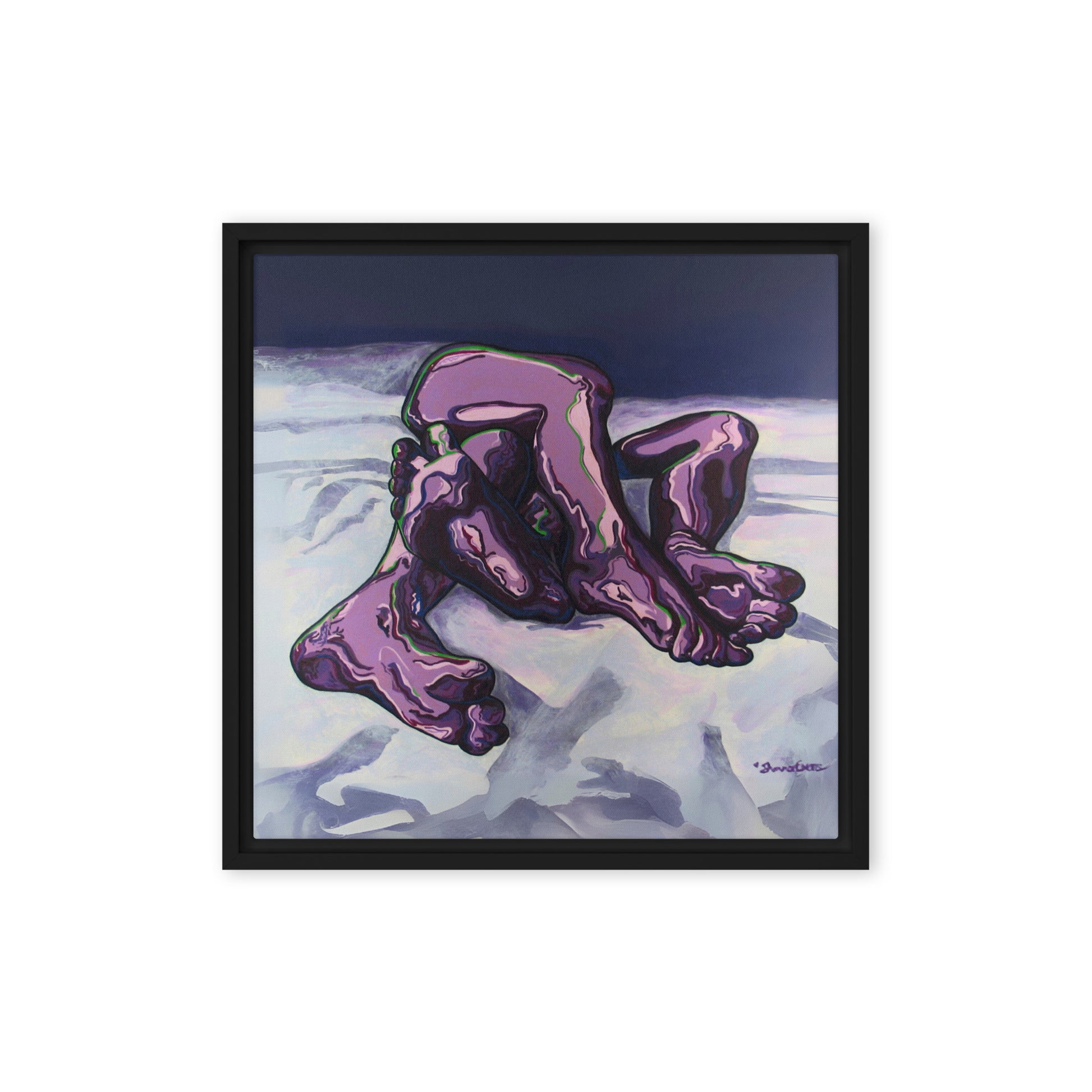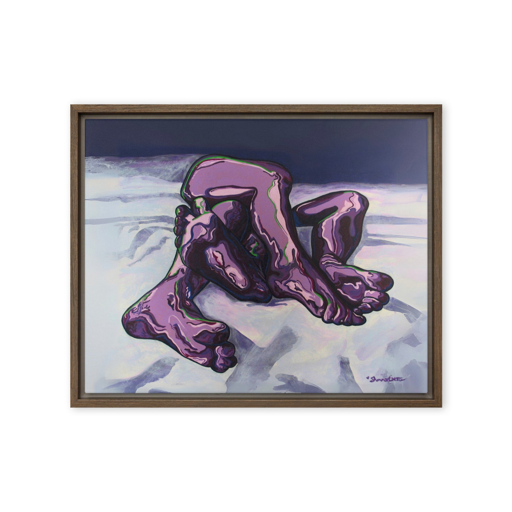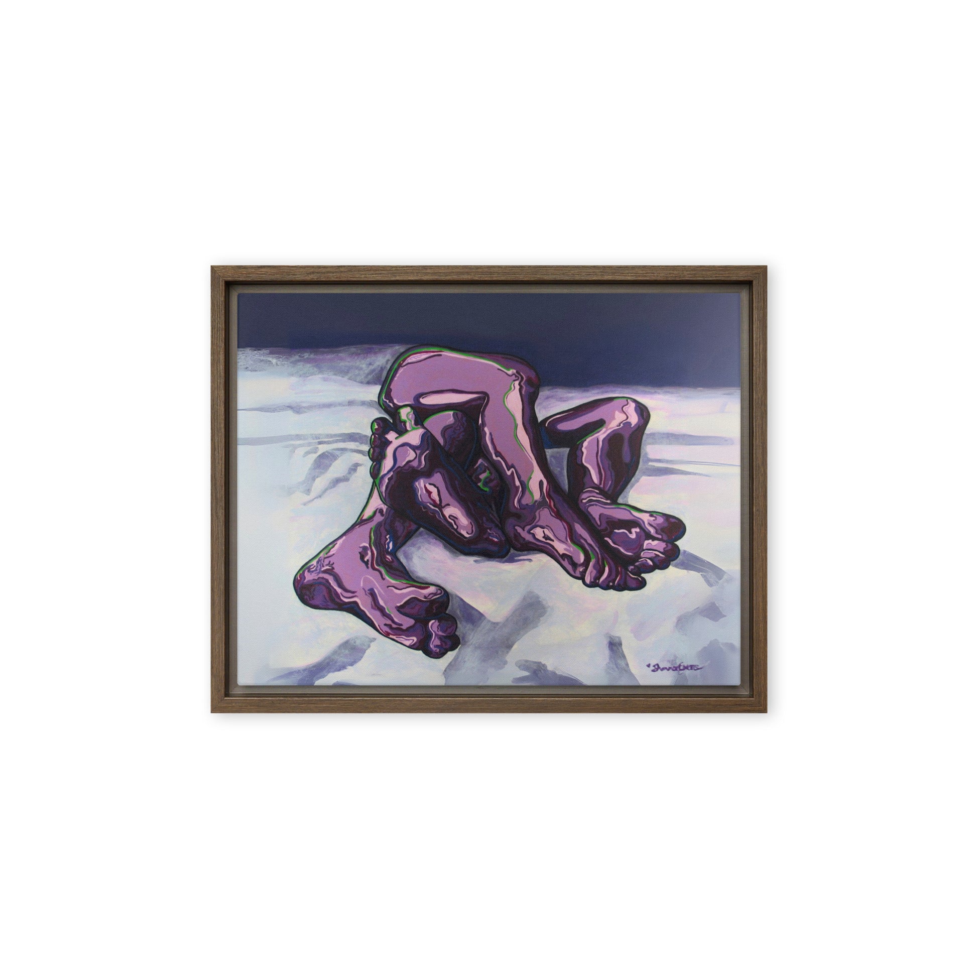 Join in the spark of this passionate moment ignited through the compelling imagery of I Know by Shannon Evans. Dominated by velvety shades of purple, this sensual painting is punctuated with vibrant accents that bring out its charismatic charge. We find ourselves drawn into an intimate scene exploring the entwined feet and legs of two lovers lazily piled together as they embrace in bed.