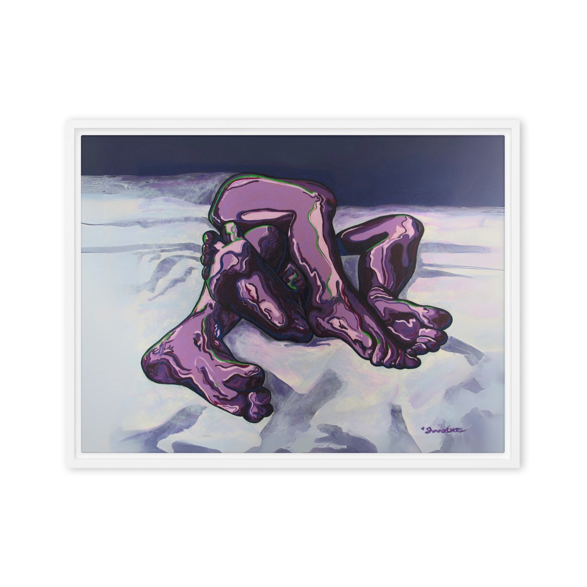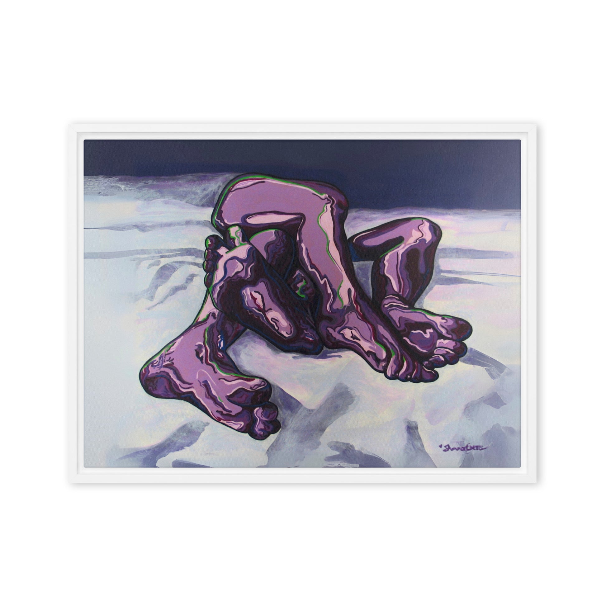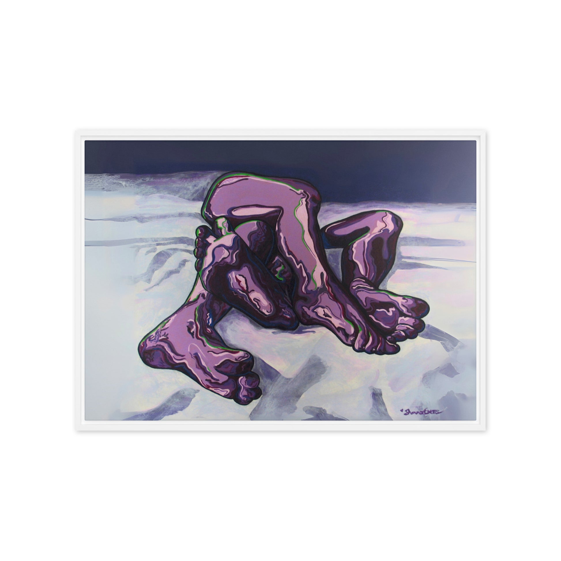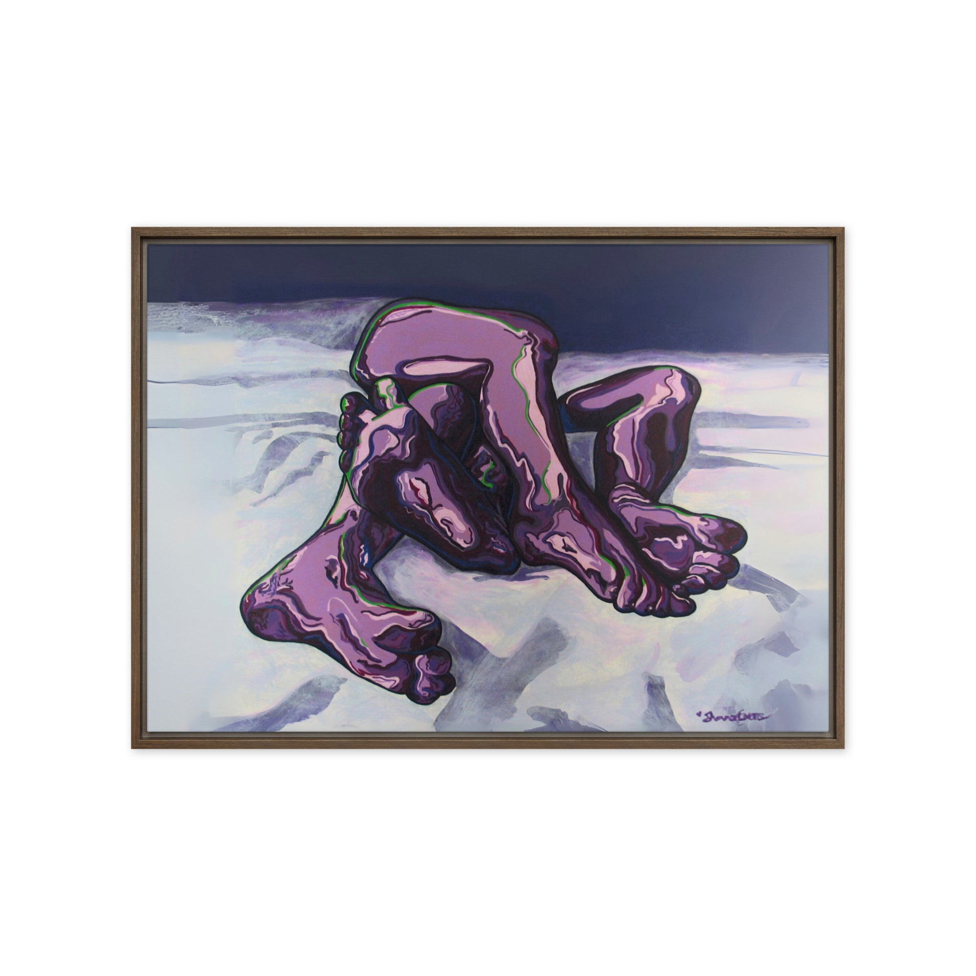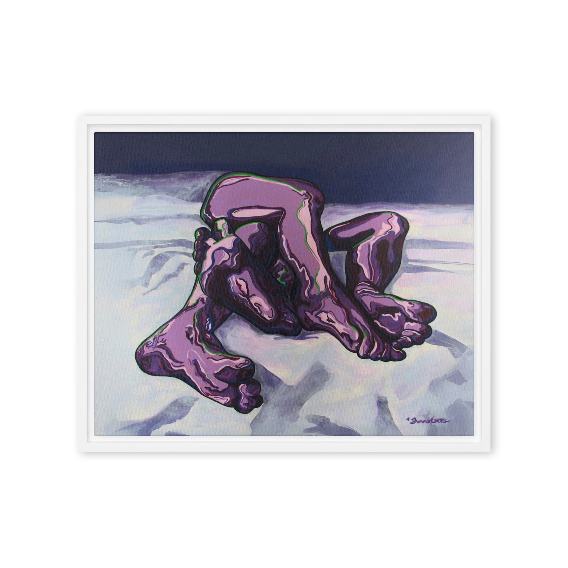Join in the spark of this passionate moment ignited through the compelling imagery of I Know by Shannon Evans. Dominated by velvety shades of purple, this sensual painting is punctuated with vibrant accents that bring out its charismatic charge. We find ourselves drawn into an intimate scene exploring the entwined feet and legs of two lovers lazily piled together as they embrace in bed.