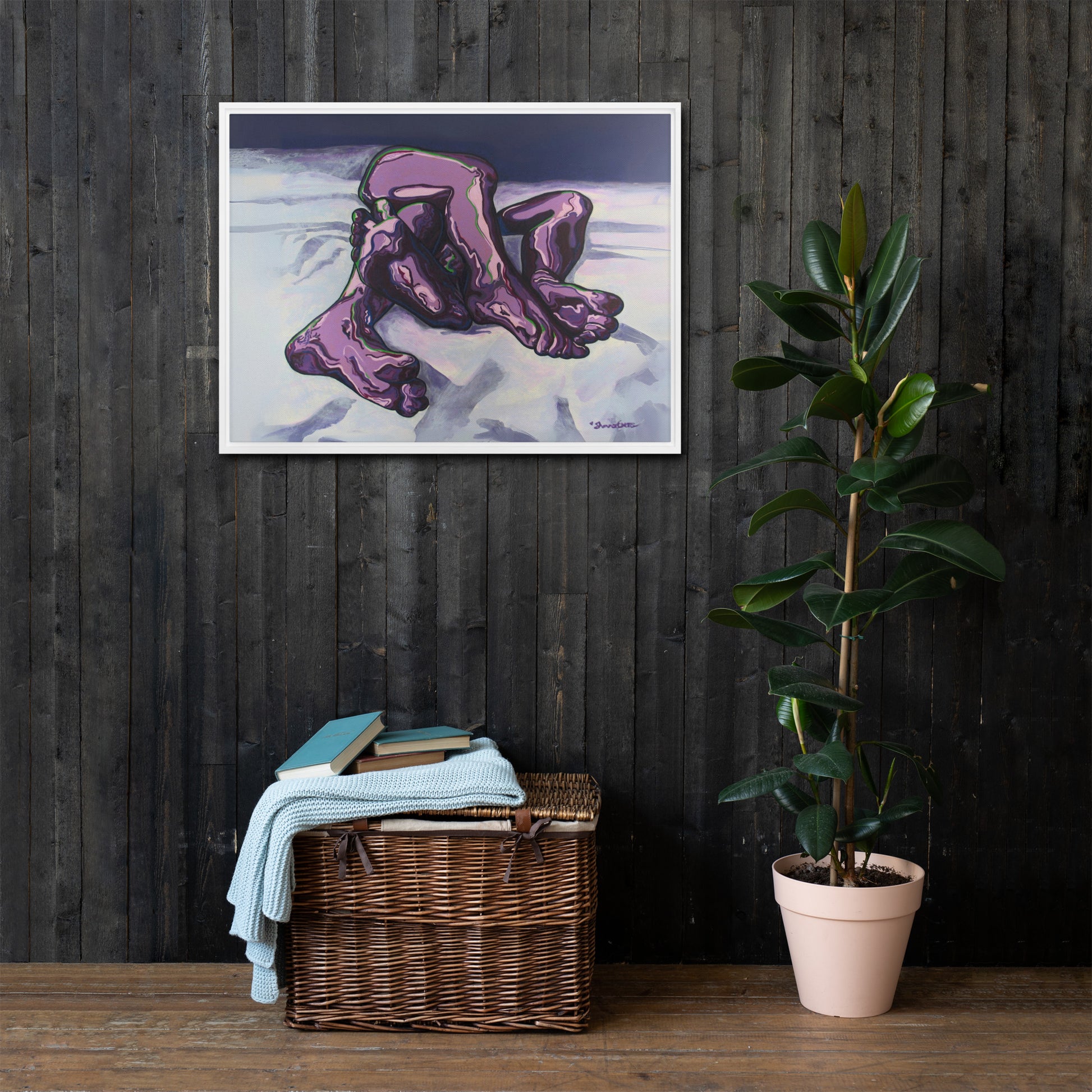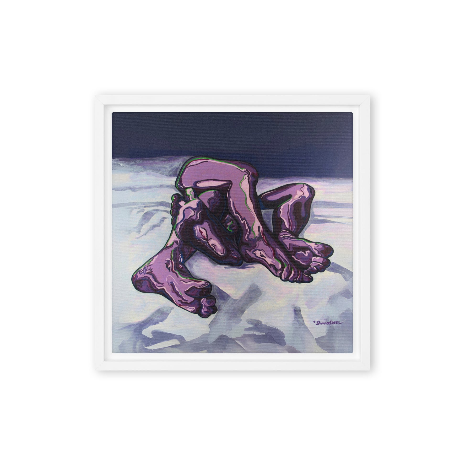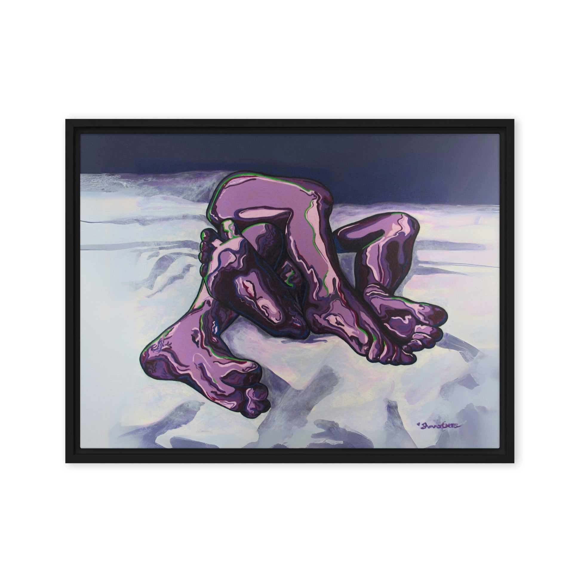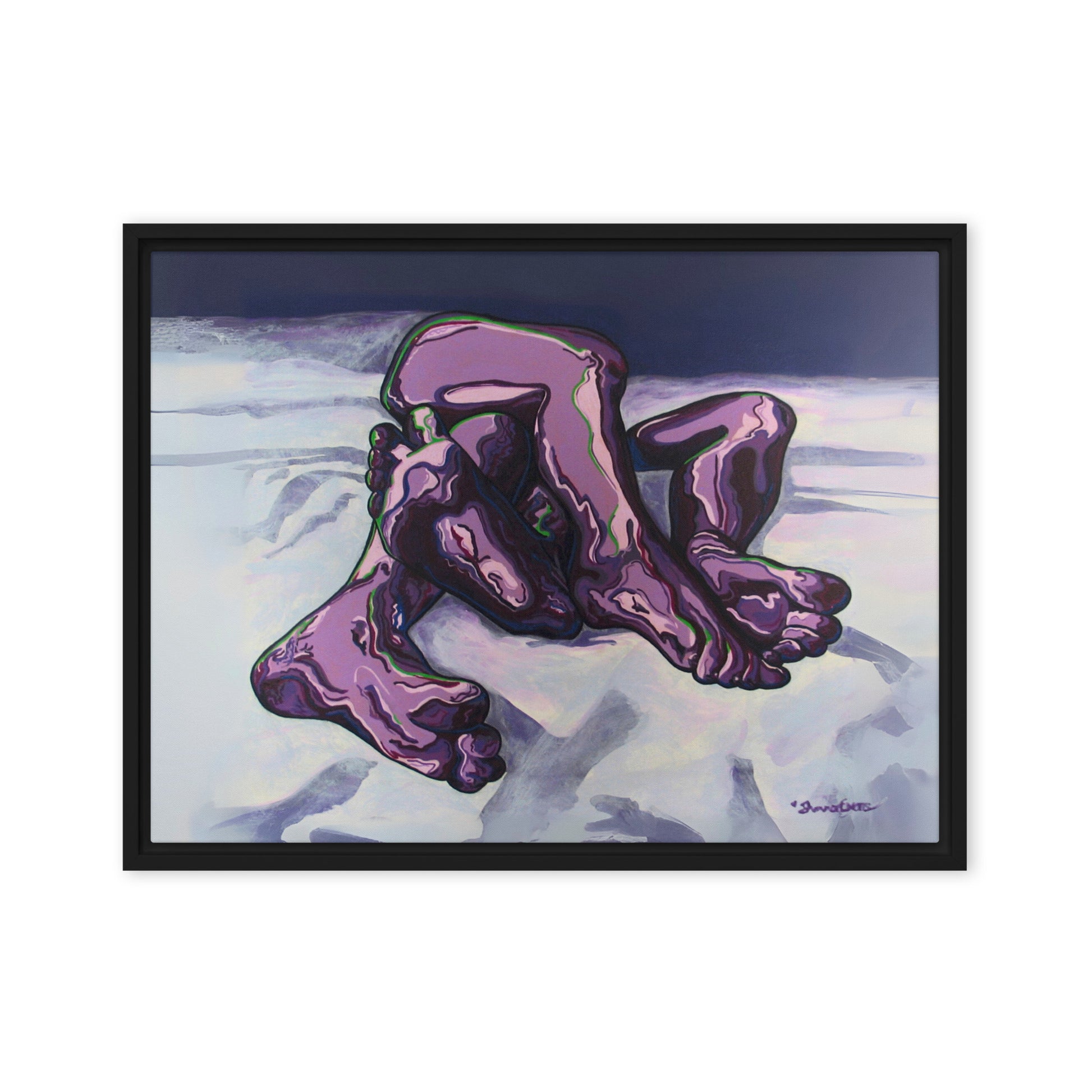 Join in the spark of this passionate moment ignited through the compelling imagery of I Know by Shannon Evans. Dominated by velvety shades of purple, this sensual painting is punctuated with vibrant accents that bring out its charismatic charge. We find ourselves drawn into an intimate scene exploring the entwined feet and legs of two lovers lazily piled together as they embrace in bed.
