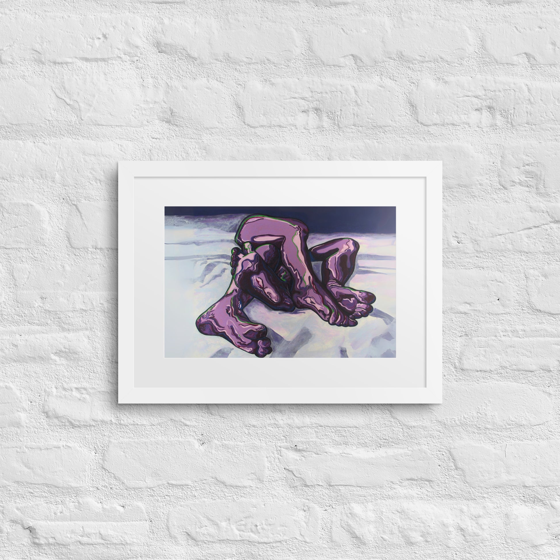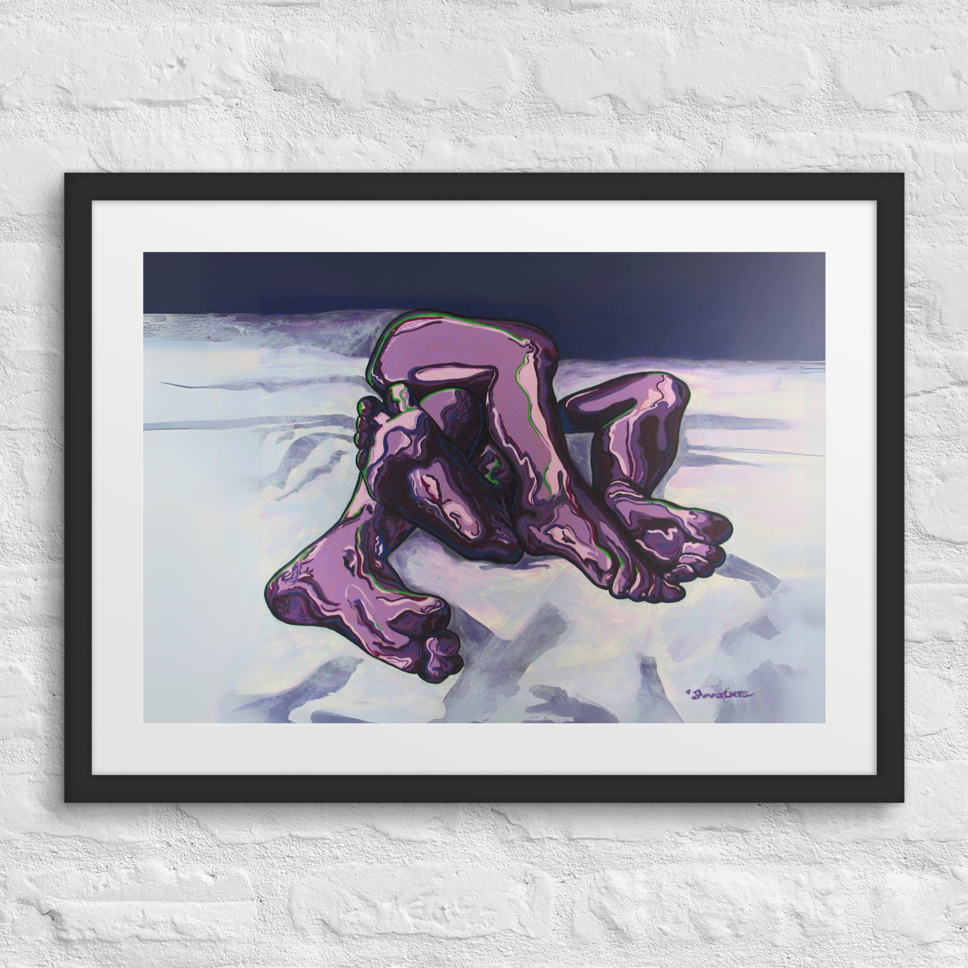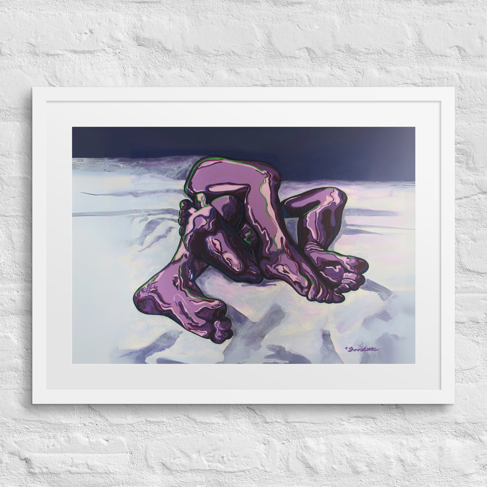 Join in the spark of this passionate moment ignited through the compelling imagery of I Know by Shannon Evans. Dominated by velvety shades of purple, this sensual painting is punctuated with vibrant accents that bring out its charismatic charge. We find ourselves drawn into an intimate scene exploring the entwined feet and legs of two lovers lazily piled together as they embrace in bed.