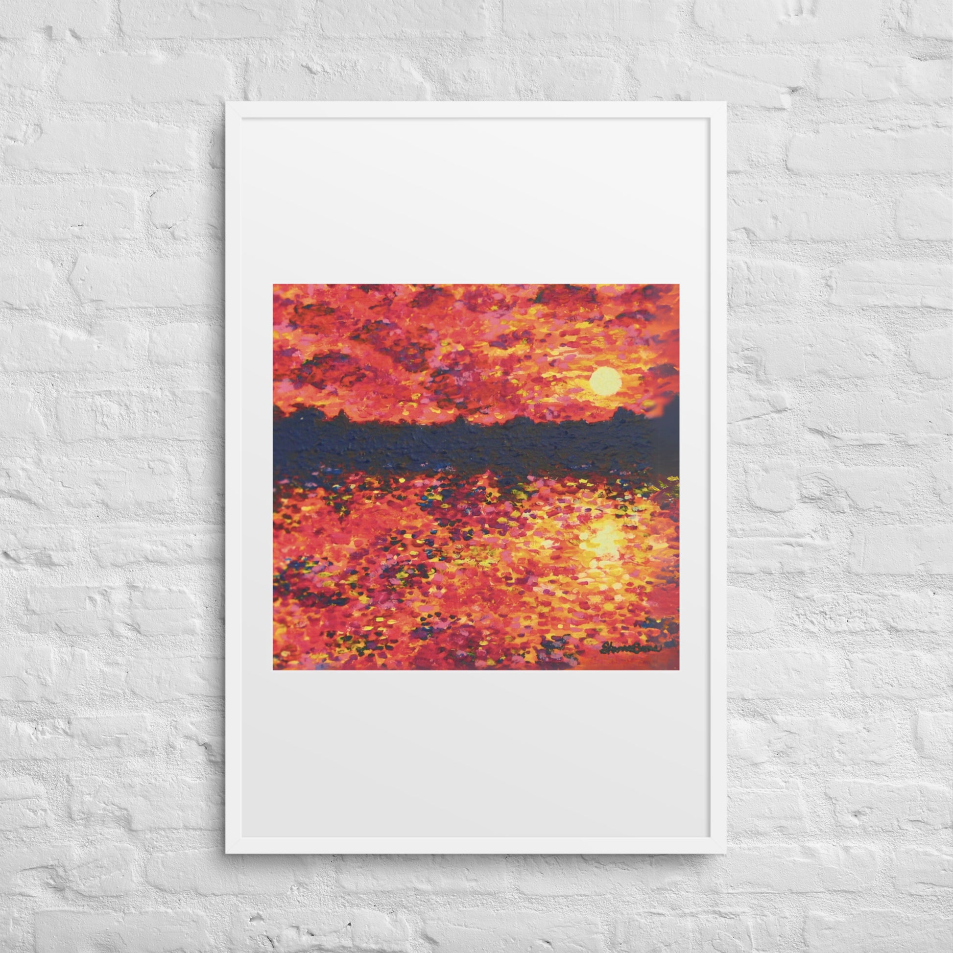Awaken your senses with Just Think About It, an energizing contemporary painting that captures the spirit of nature's daily renewal. This stunning piece features a fiery orange-hued sunrise that bathes the landscape in warmth and vitality. As the sun rises over the silhouette of trees, light cascades across the serene lake below with tickling reflections as it forms a breathtaking scene that both demands notice and instills gratitude.