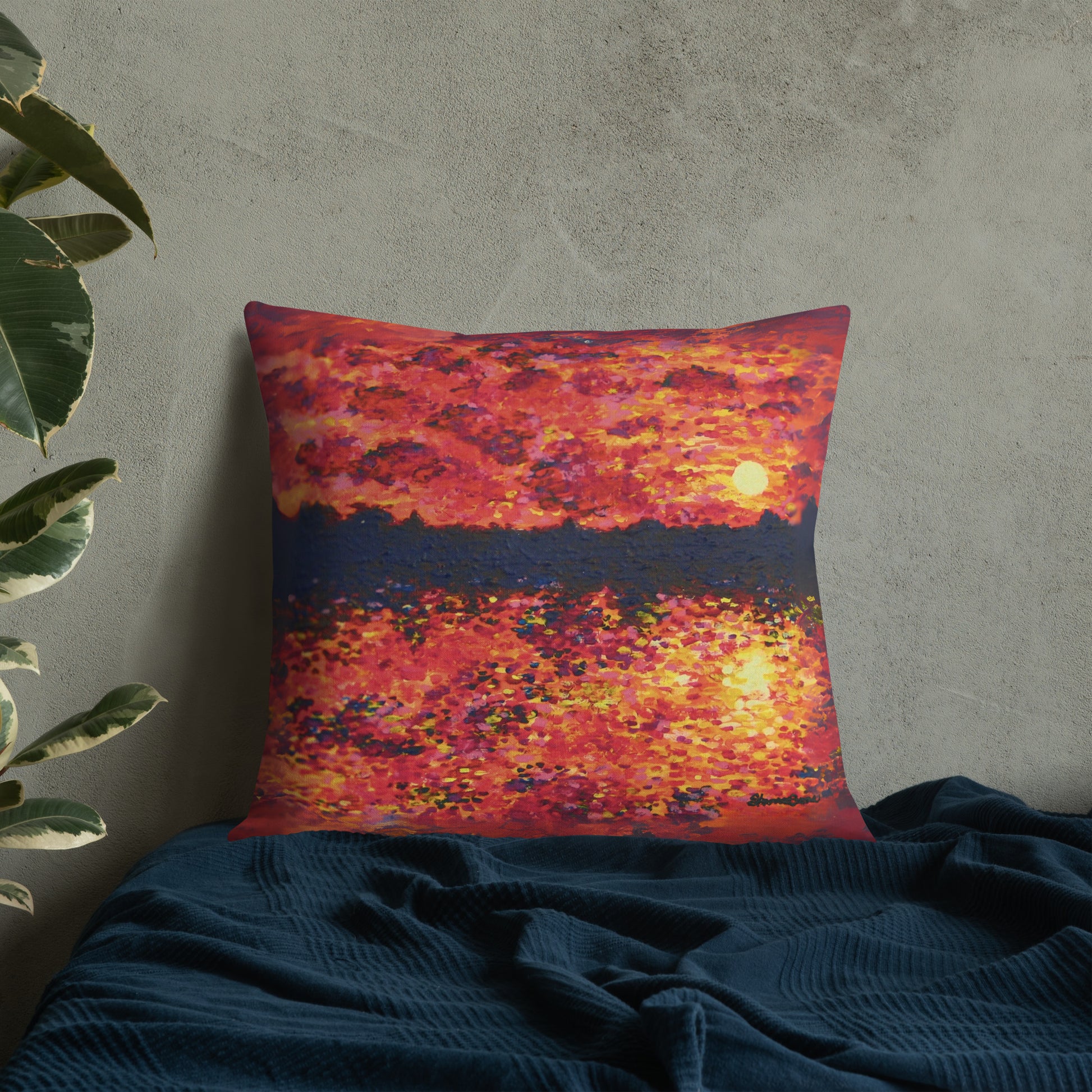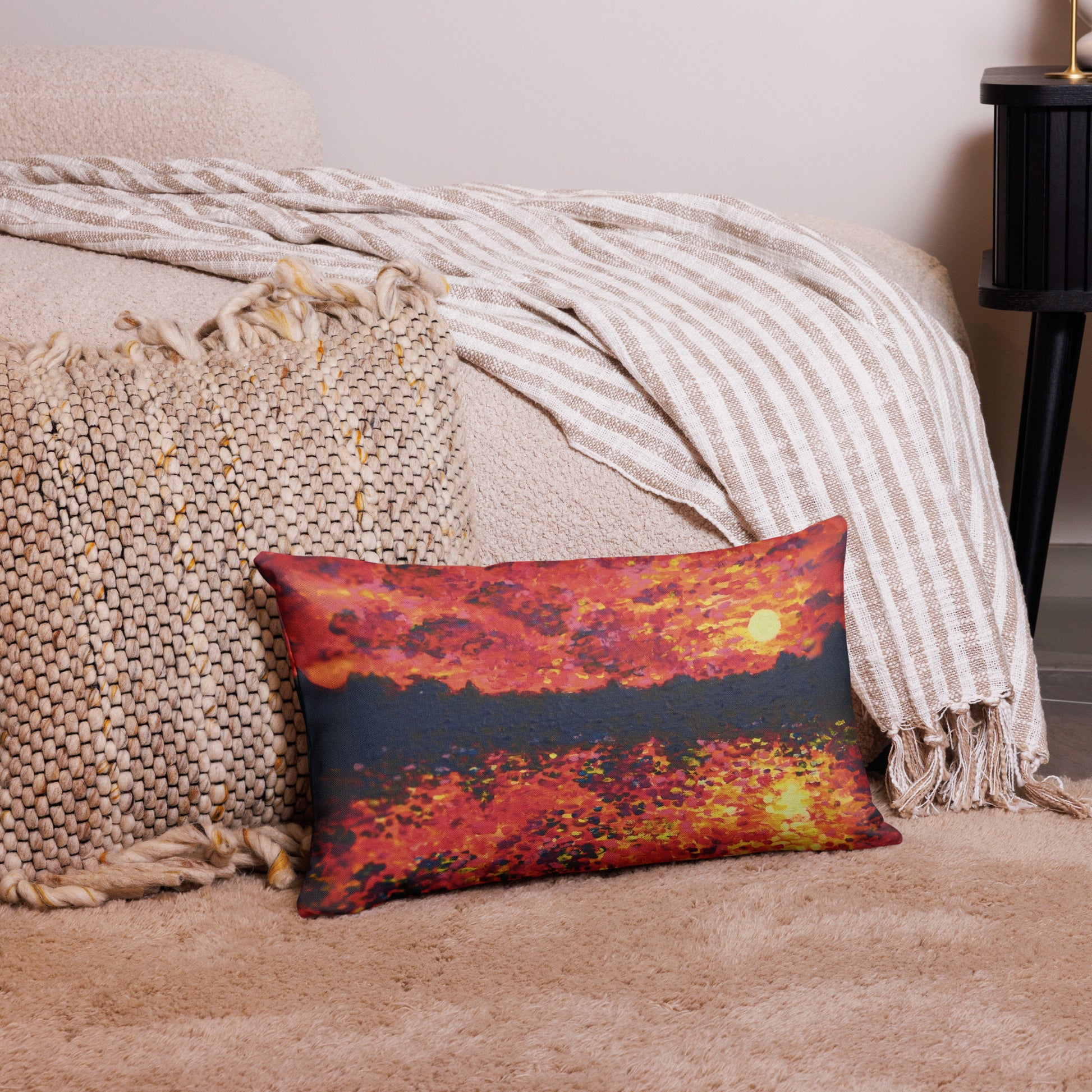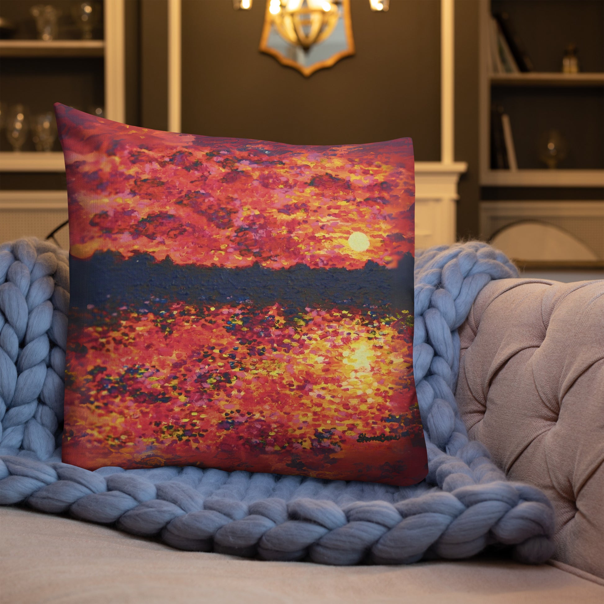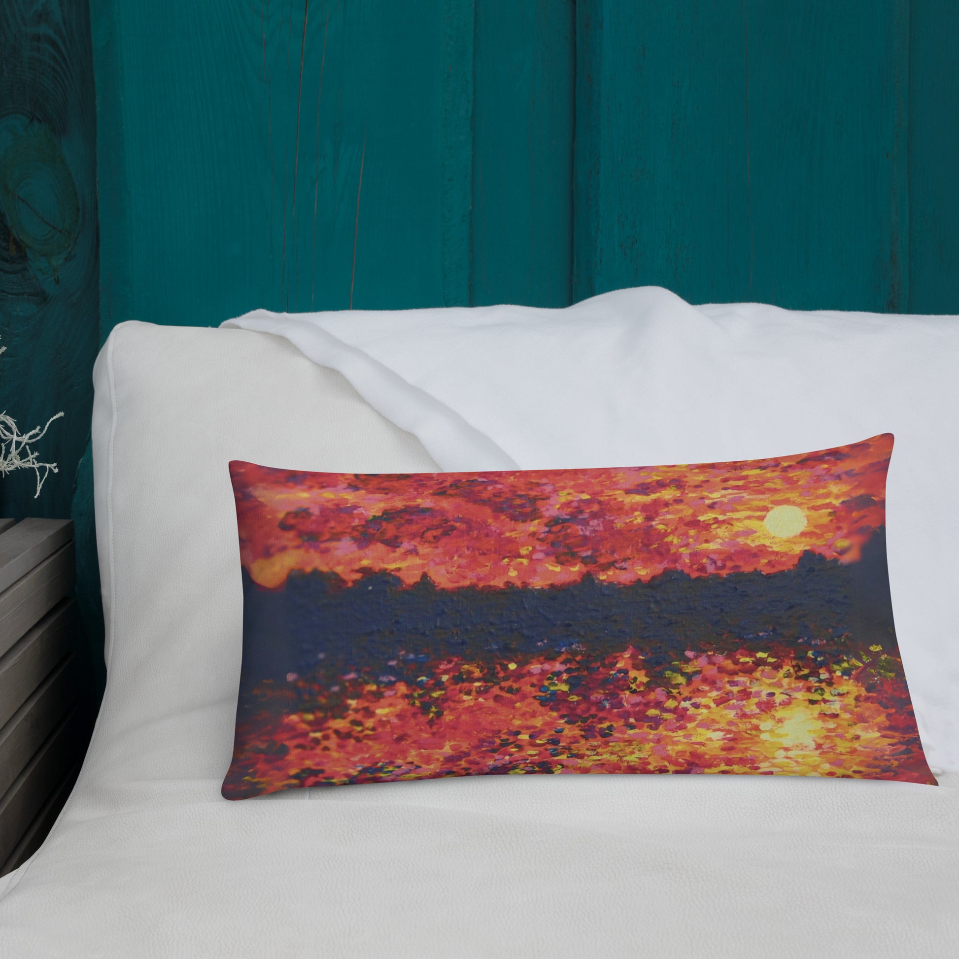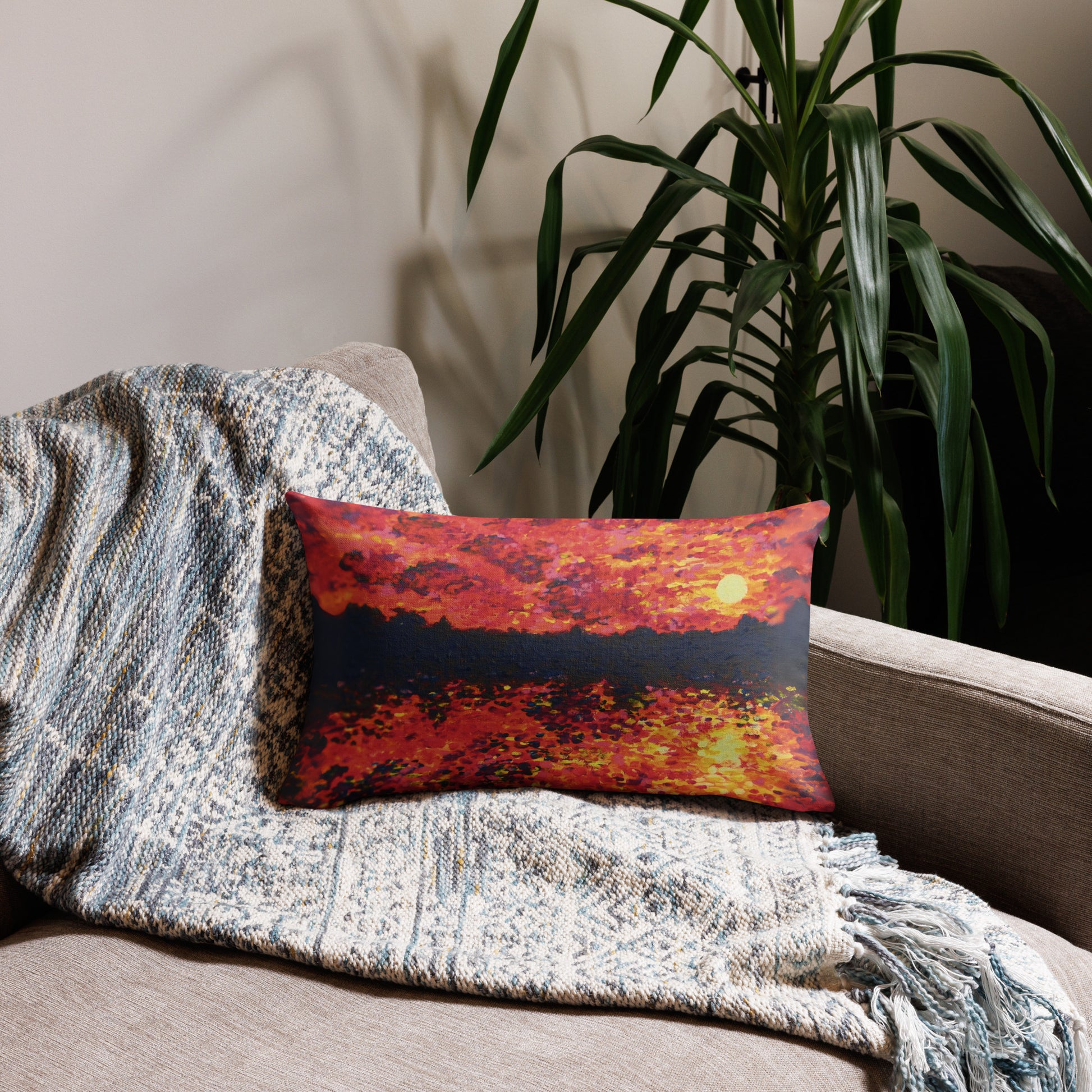 Awaken your senses with Just Think About It, an energizing contemporary painting that captures the spirit of nature's daily renewal. This stunning piece features a fiery orange-hued sunrise that bathes the landscape in warmth and vitality. As the sun rises over the silhouette of trees, light cascades across the serene lake below with tickling reflections as it forms a breathtaking scene that both demands notice and instills gratitude.