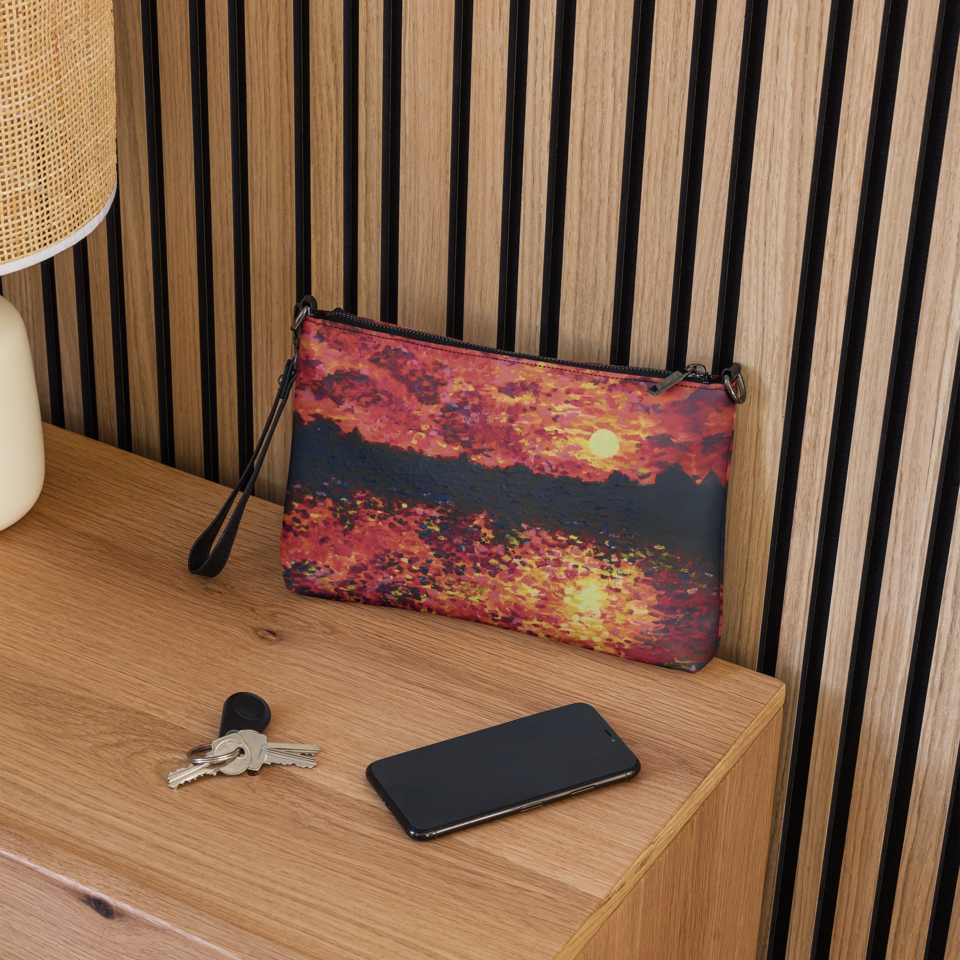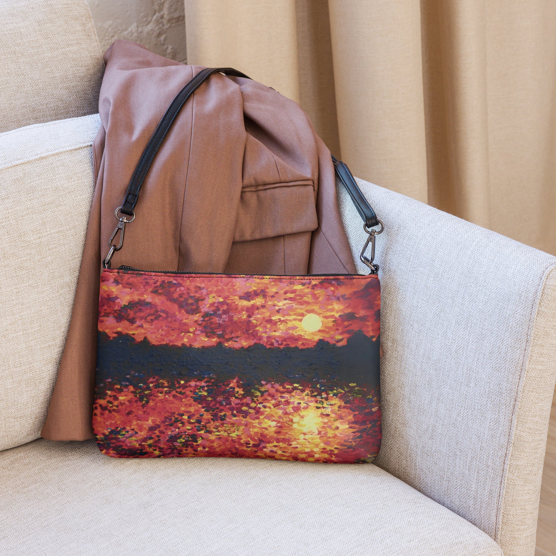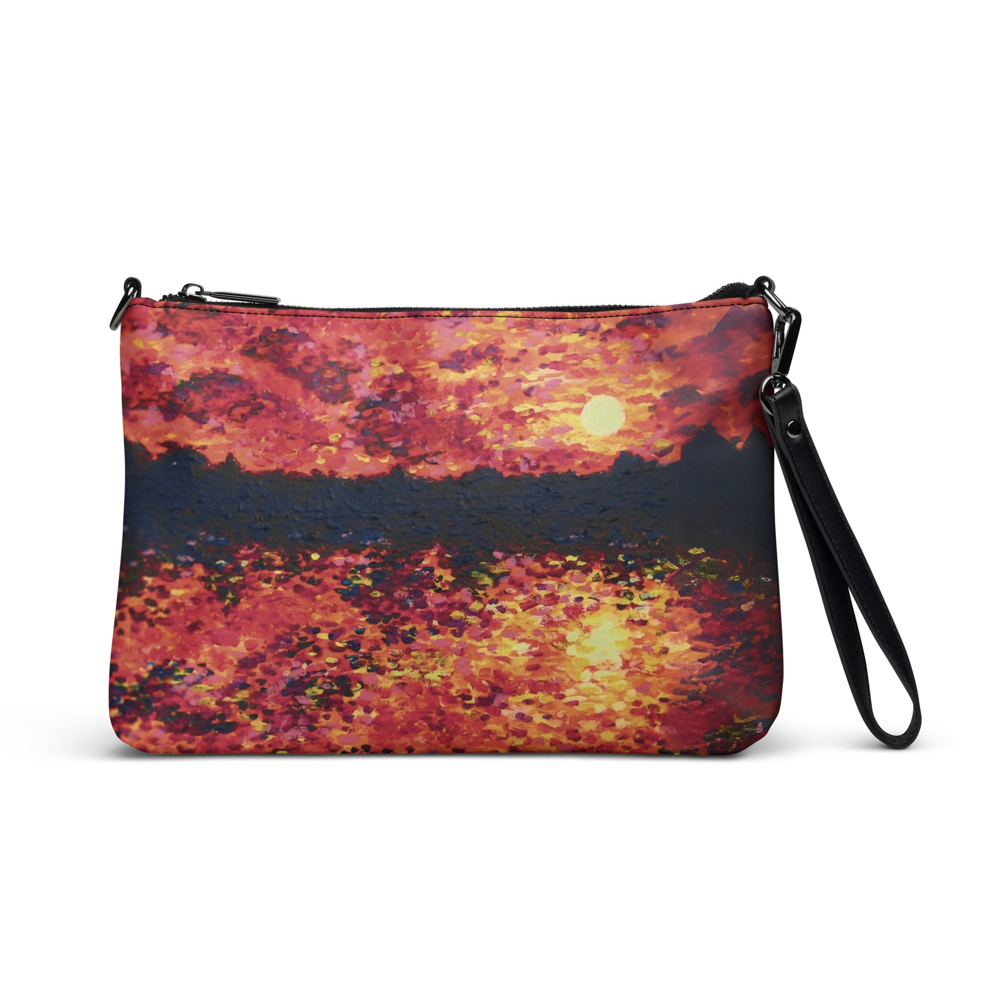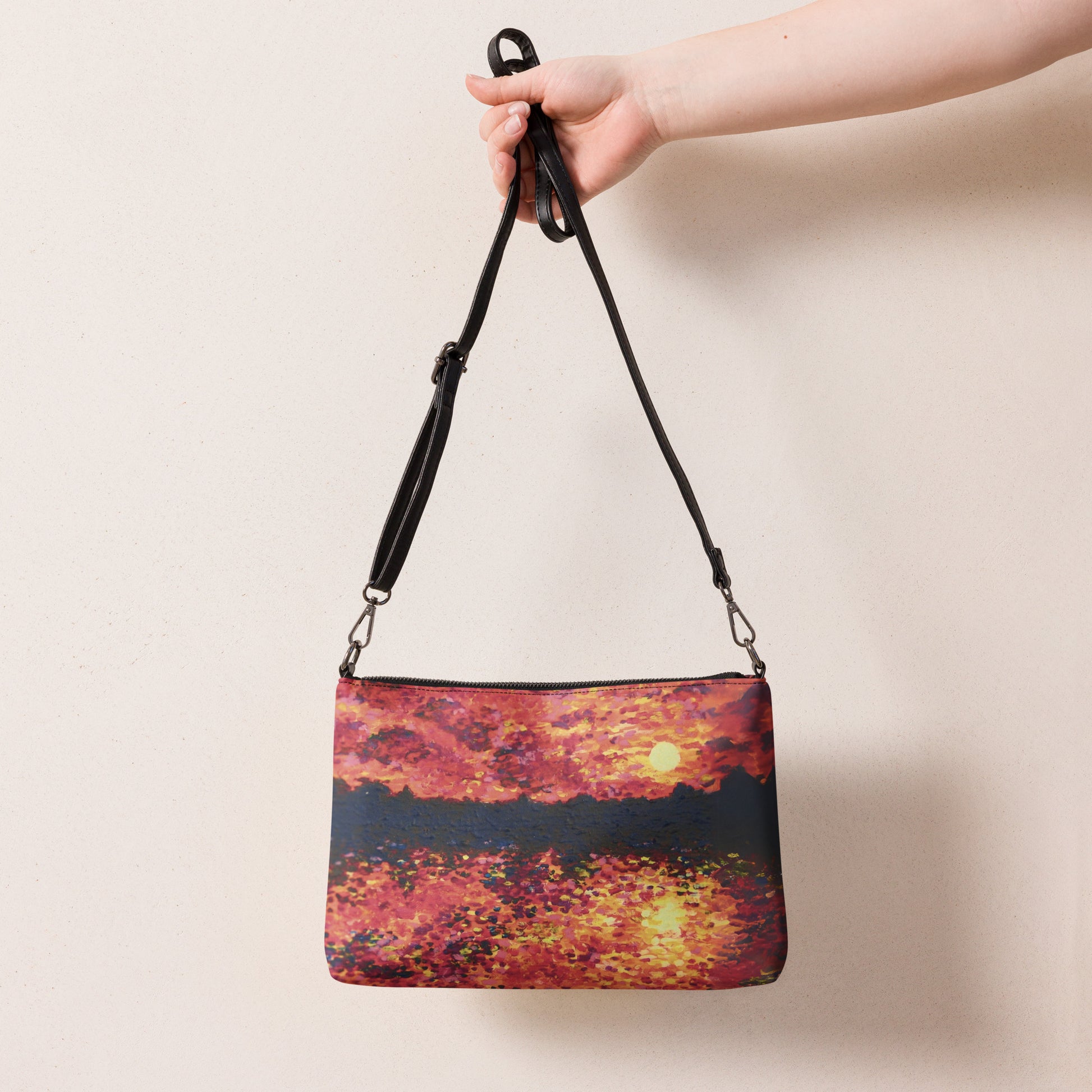 Keep your style hot and your hands free with this versatile crossbody bag! Made with premium faux leather and featuring dark gray hardware, this perfect-sized bag has a zip-top closure and multiple inside pockets to keep your essentials secure and organized. Transform this crossbody bag with removable wrist and shoulder straps to style it for day-to-night looks. Printed with care from Shannon Evans' Chicago Symphony painting!