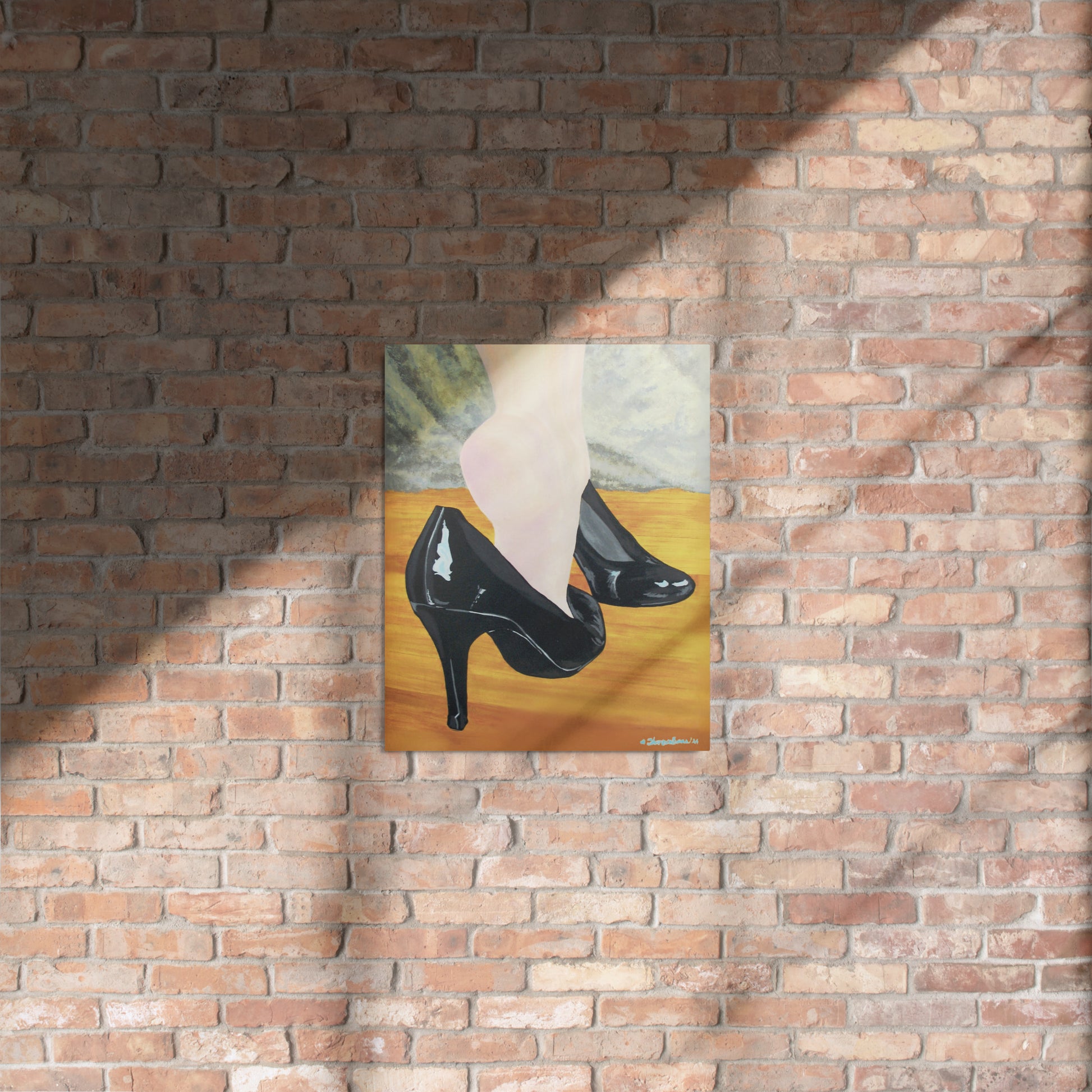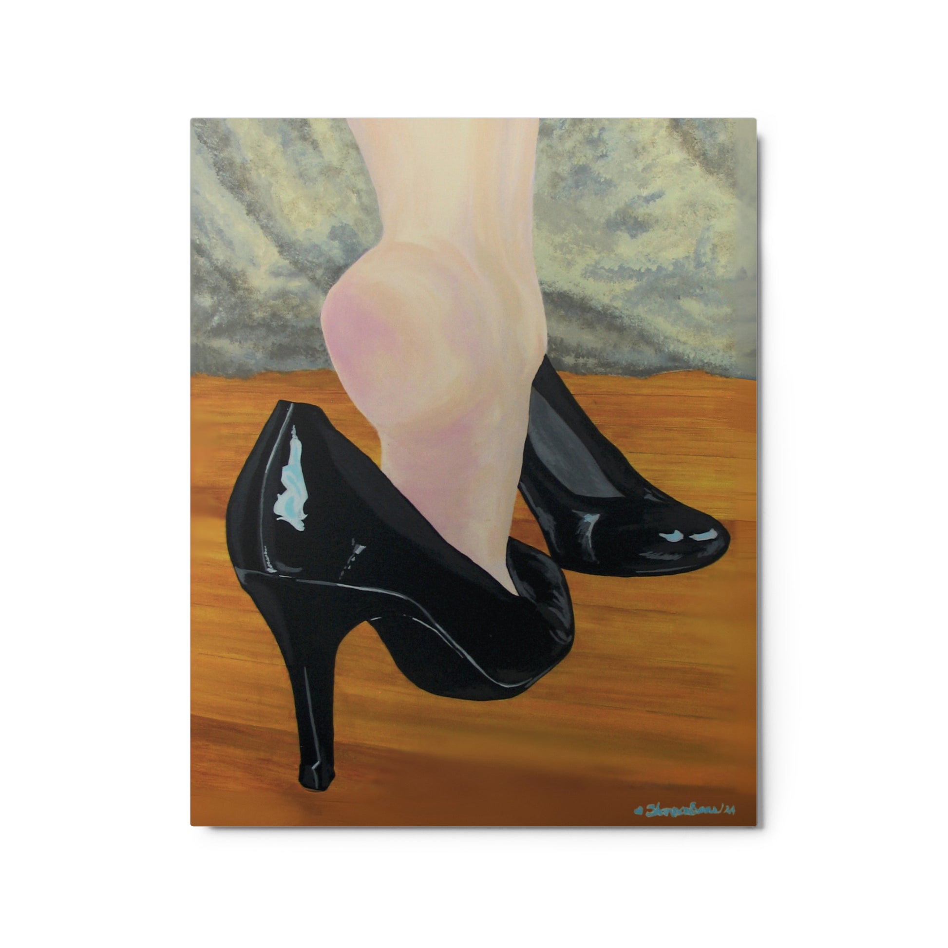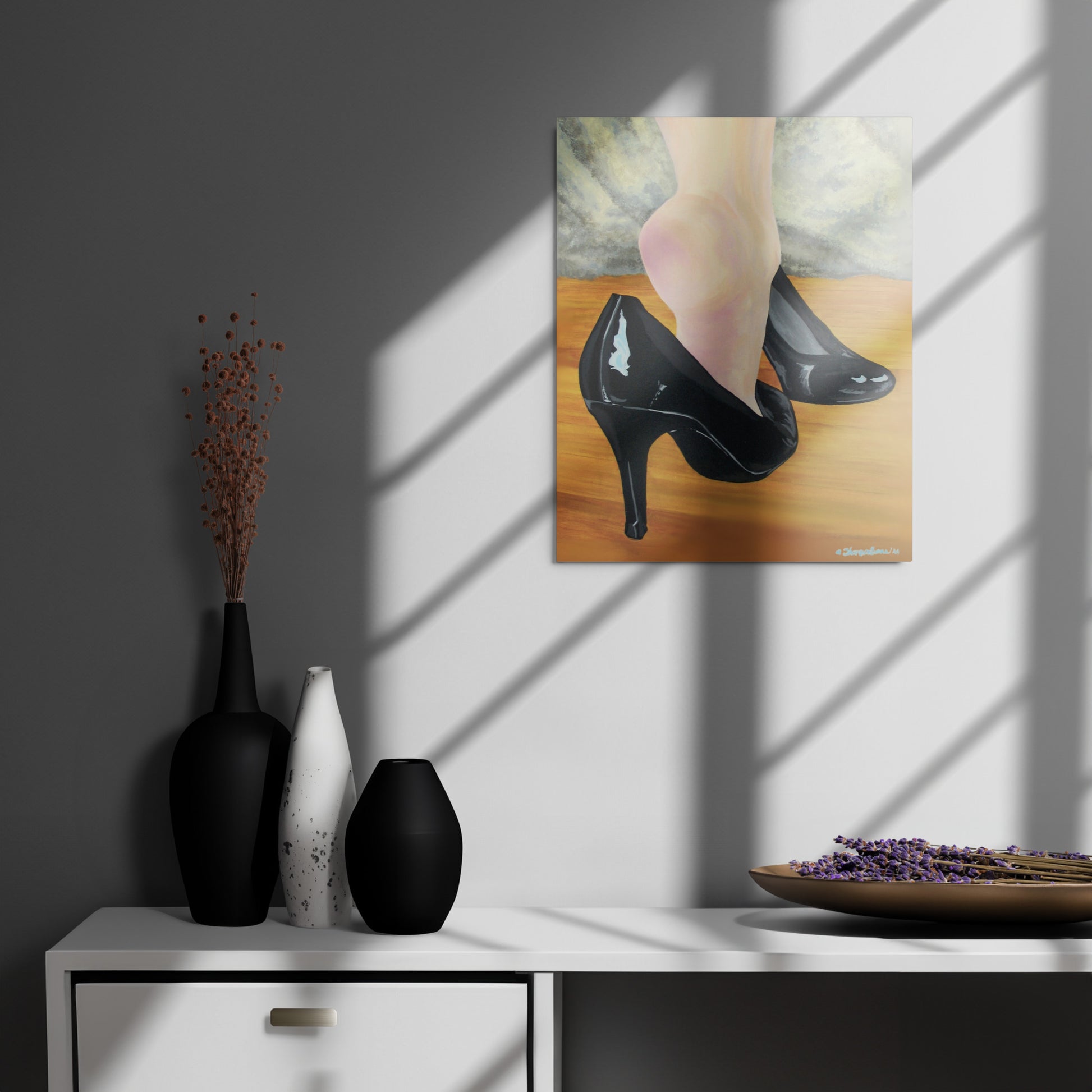 Elevate your mood with our enticing Stepping Into You, a contemporary work that embodies elegance and seduction. This striking painting portrays the graceful moment of a soft-soled, feminine foot slipping seamlessly into a sleek, black patent leather stiletto heel. The artist captures the interplay of light and texture, accentuating the shoe's glossy finish and her foot's delicate arch.