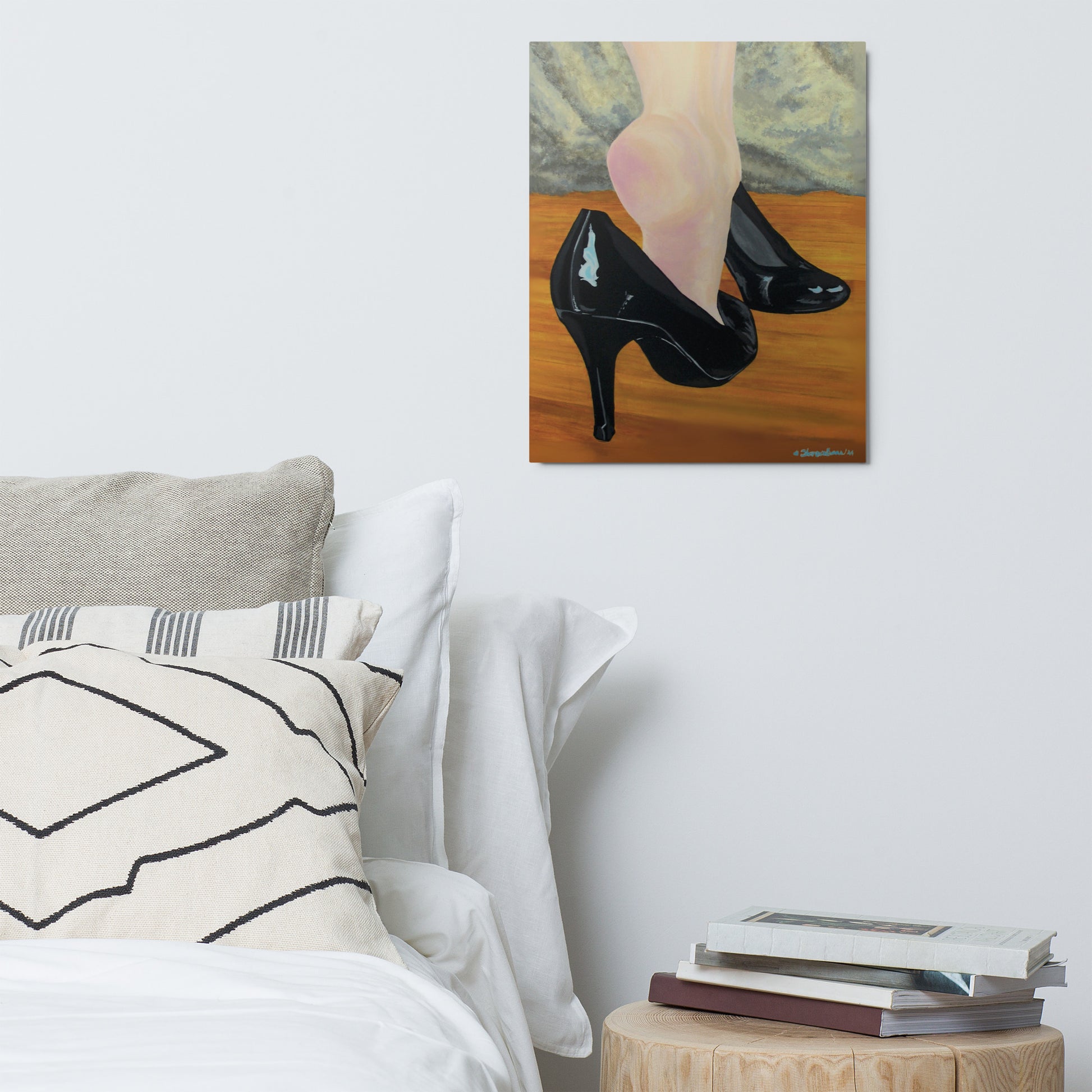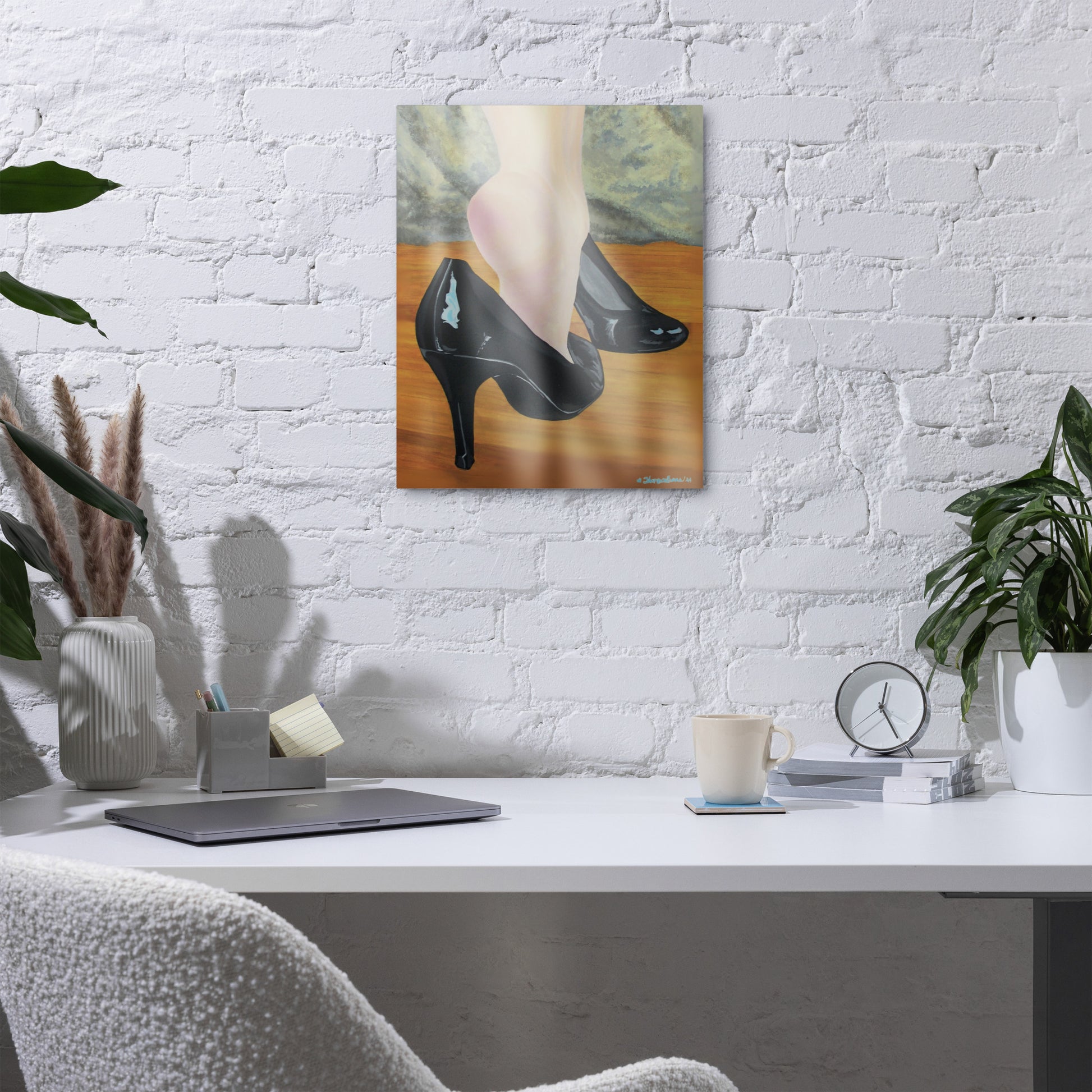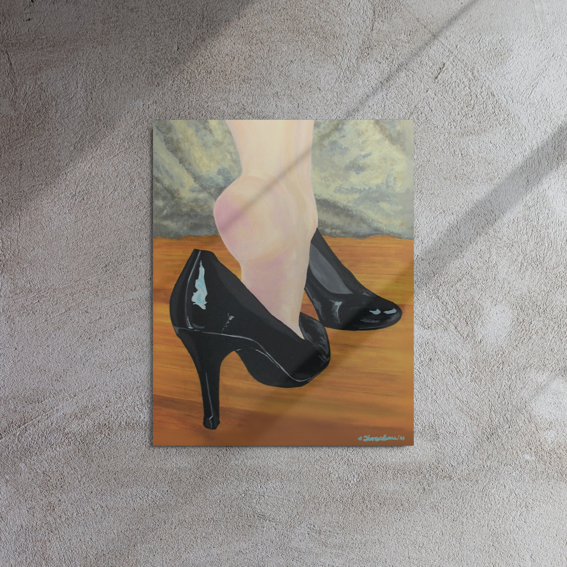 Elevate your mood with our enticing Stepping Into You, a contemporary work that embodies elegance and seduction. This striking painting portrays the graceful moment of a soft-soled, feminine foot slipping seamlessly into a sleek, black patent leather stiletto heel. The artist captures the interplay of light and texture, accentuating the shoe's glossy finish and her foot's delicate arch.