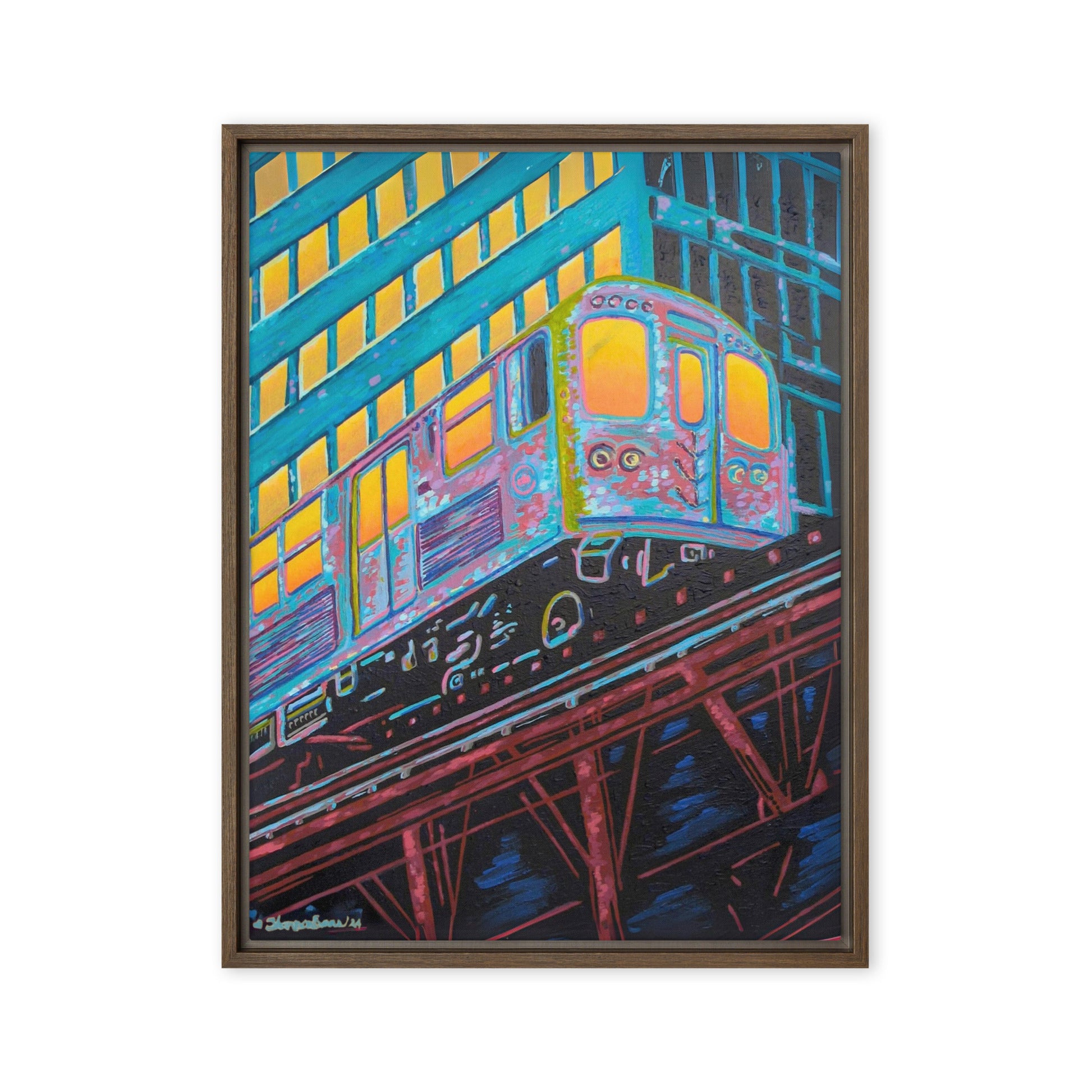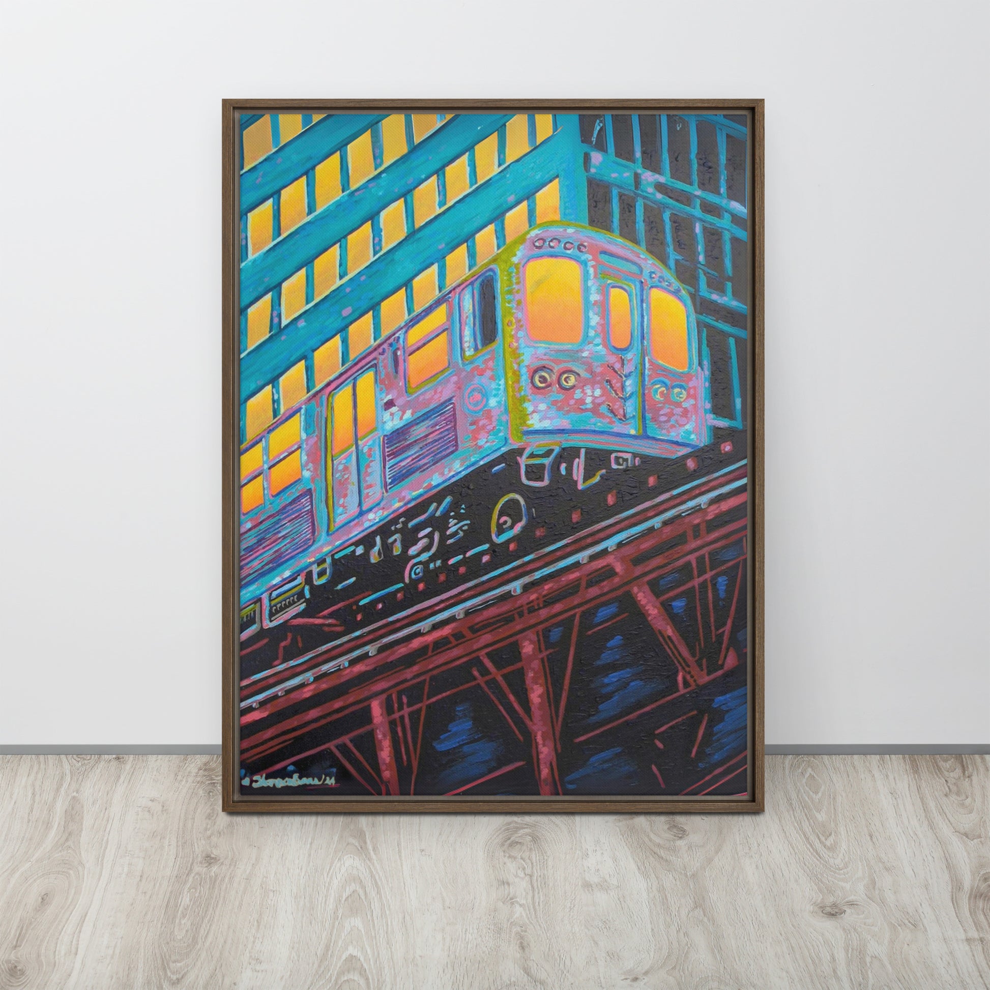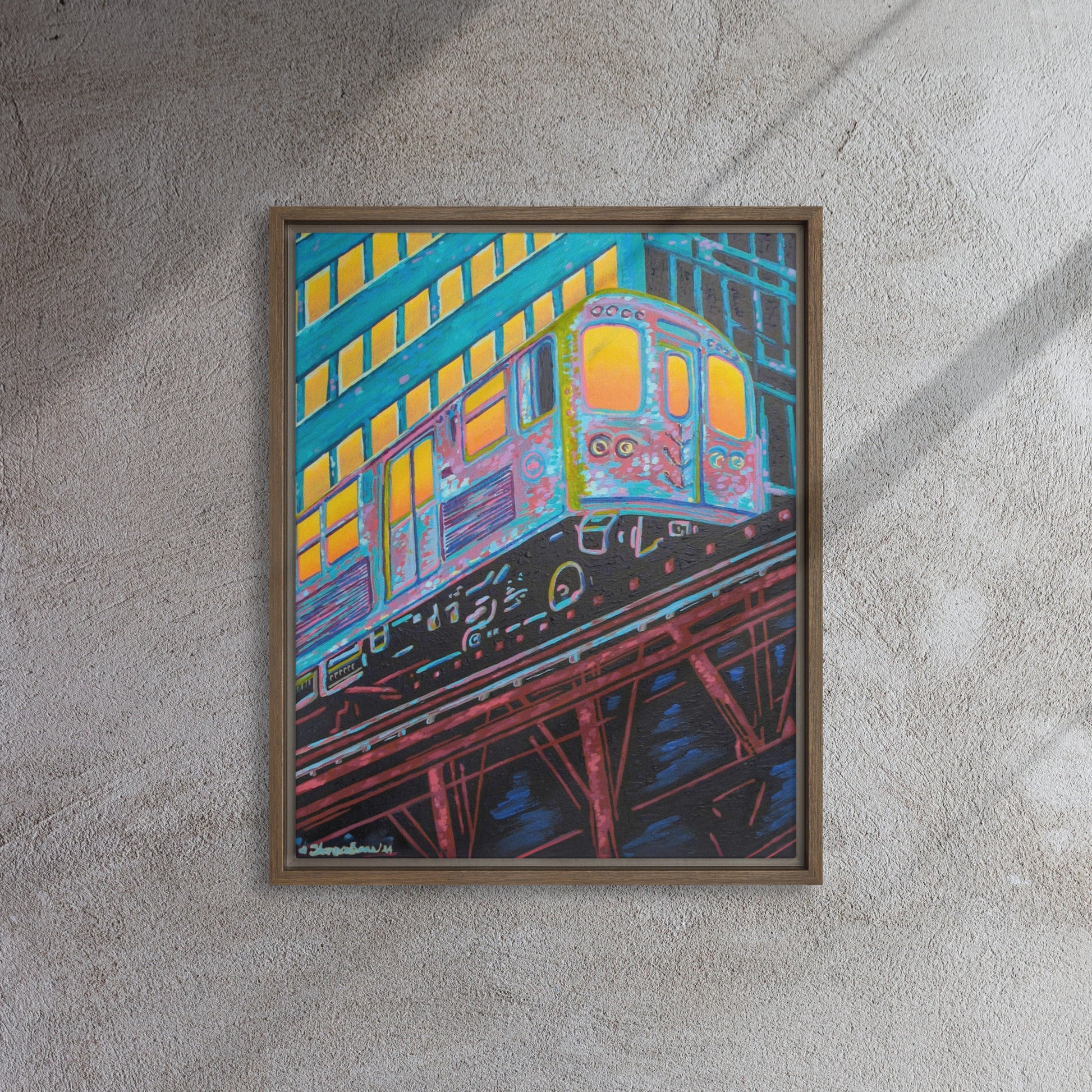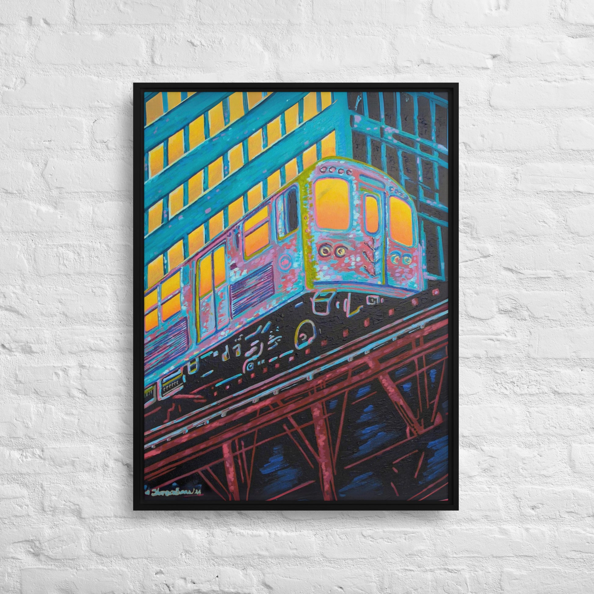 The artist's skillful use of color expressionism breathes life into the cheerful scene, with hues of orange, pink, purple, and steely blue bathing the canvas, reflecting the first light of dawn. The interplay of colors and the sense of speeding motion born from the composition evoke a sense of optimism and anticipation. This distinctive work inspired by the people of Chicago is a fitting addition to any room in need of an energy fix or for those who glow in their hustle.