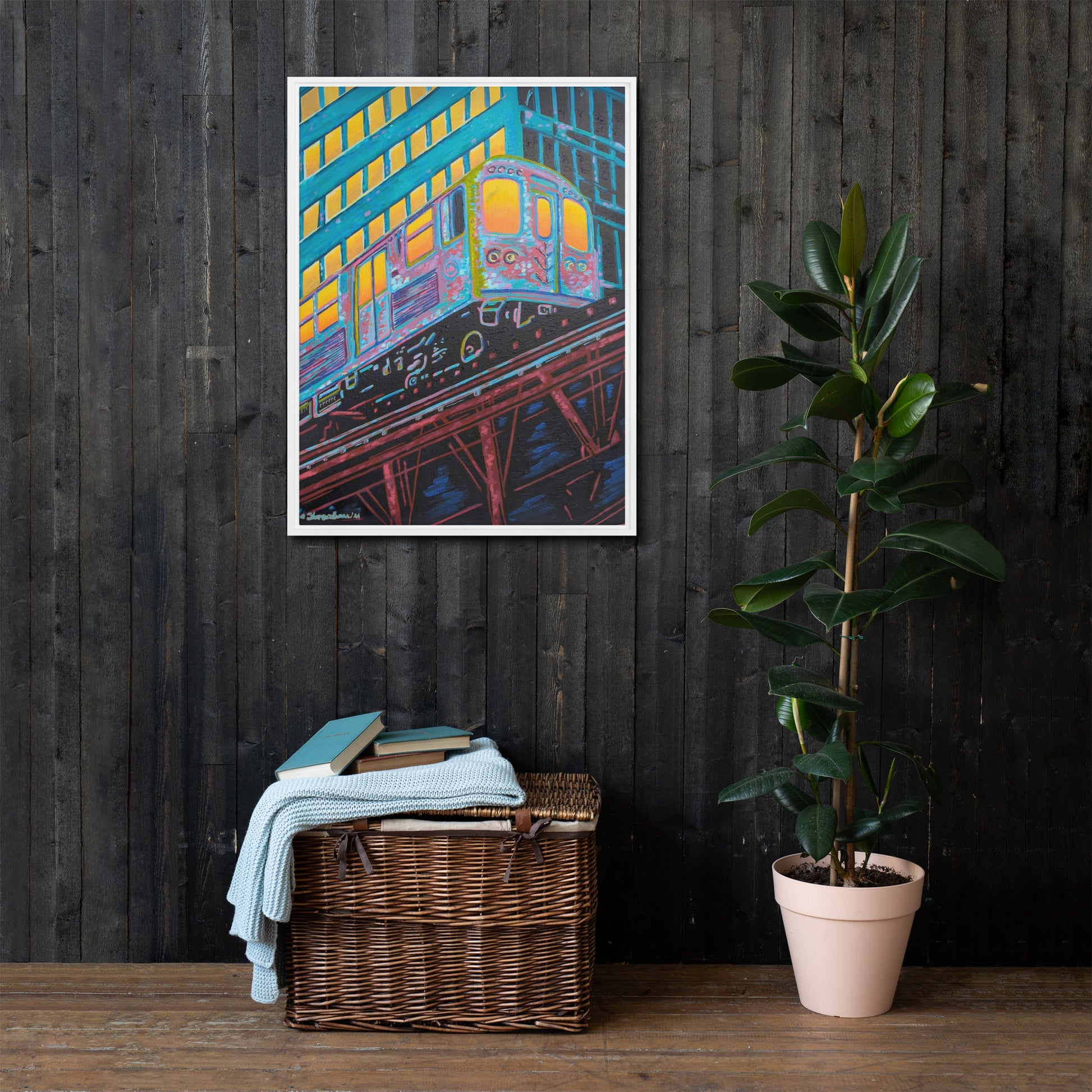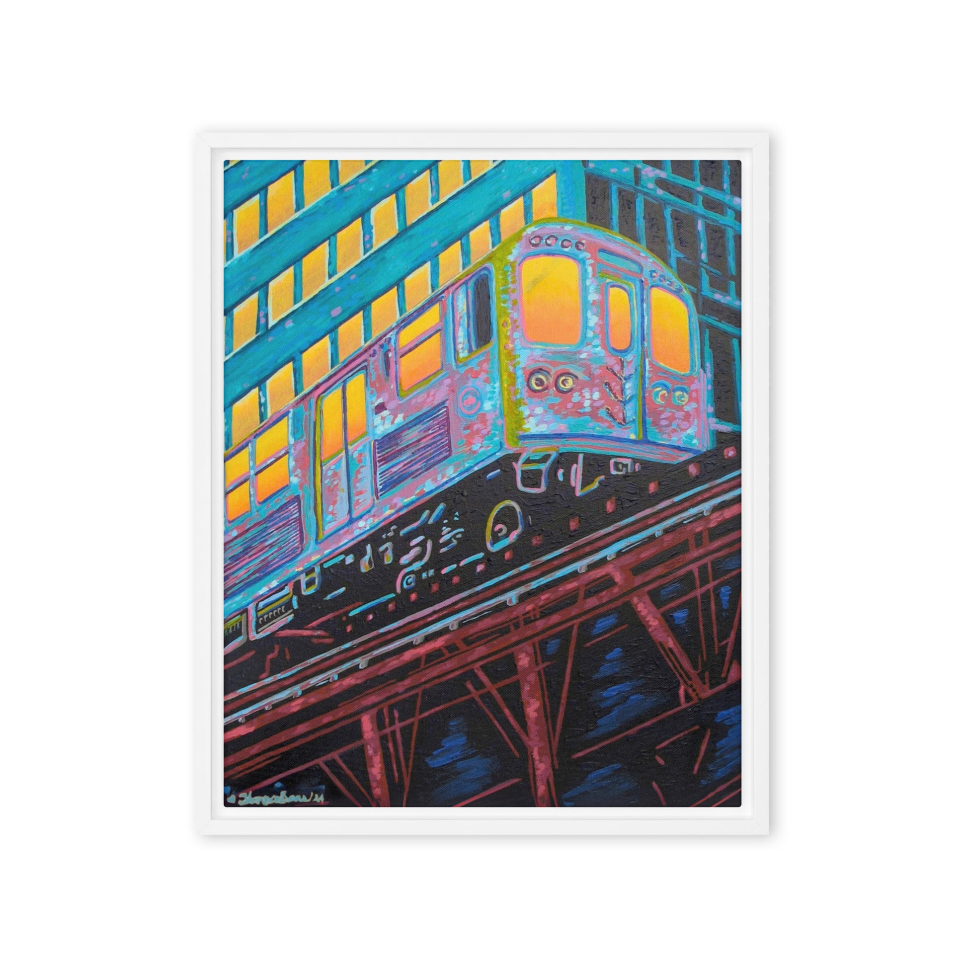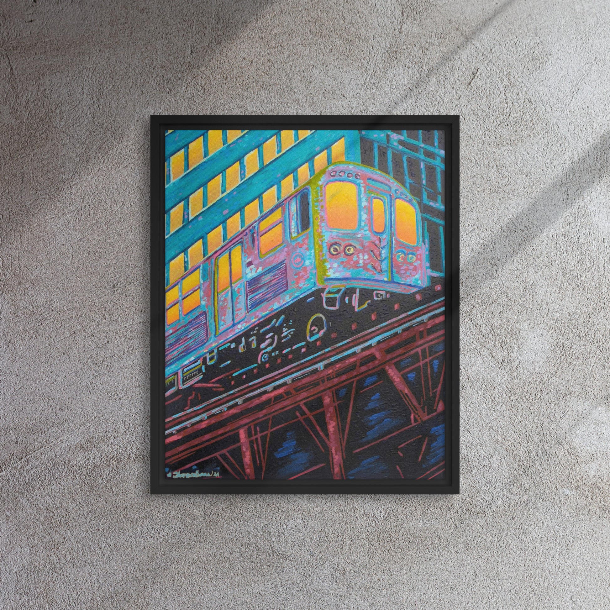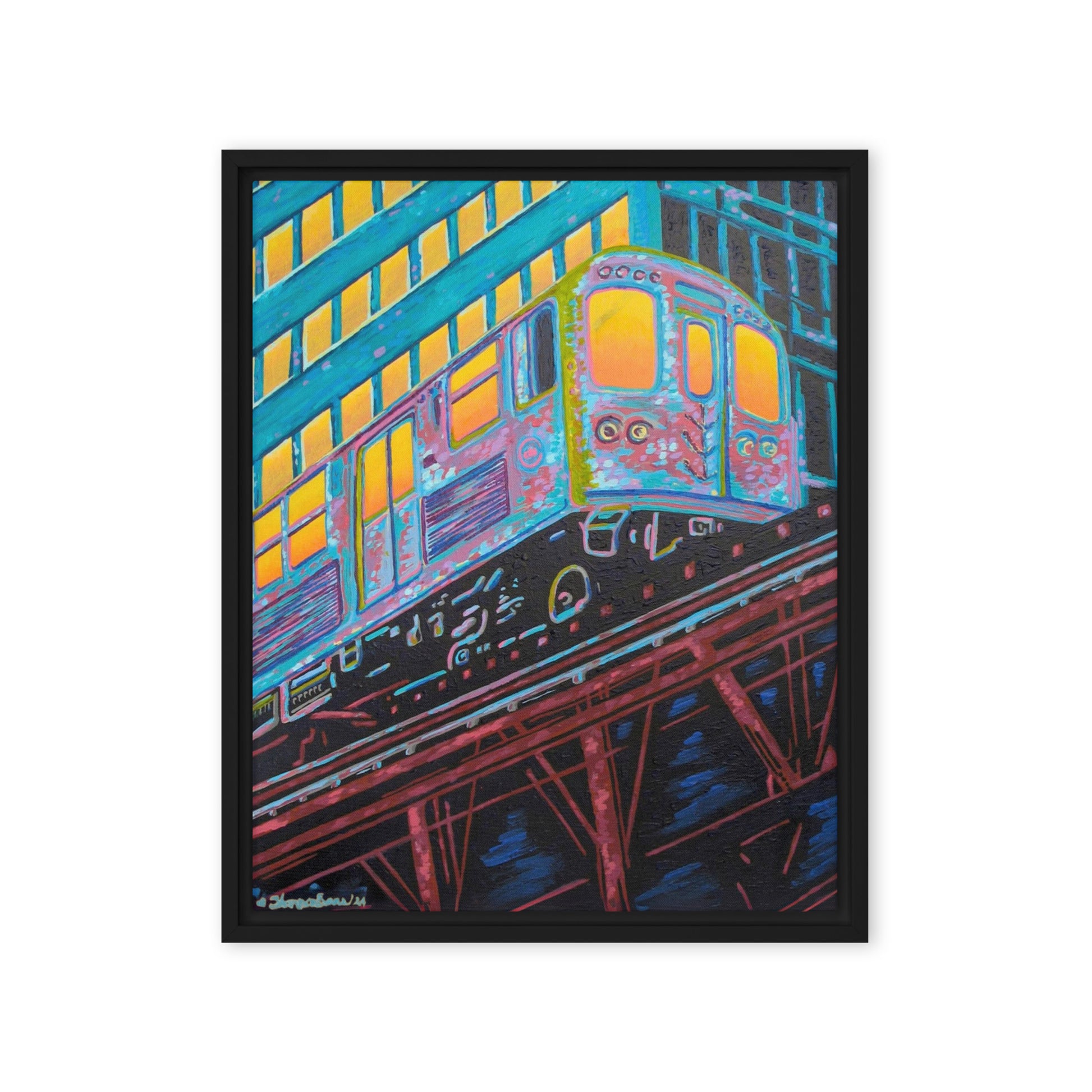 The artist's skillful use of color expressionism breathes life into the cheerful scene, with hues of orange, pink, purple, and steely blue bathing the canvas, reflecting the first light of dawn. The interplay of colors and the sense of speeding motion born from the composition evoke a sense of optimism and anticipation. This distinctive work inspired by the people of Chicago is a fitting addition to any room in need of an energy fix or for those who glow in their hustle.