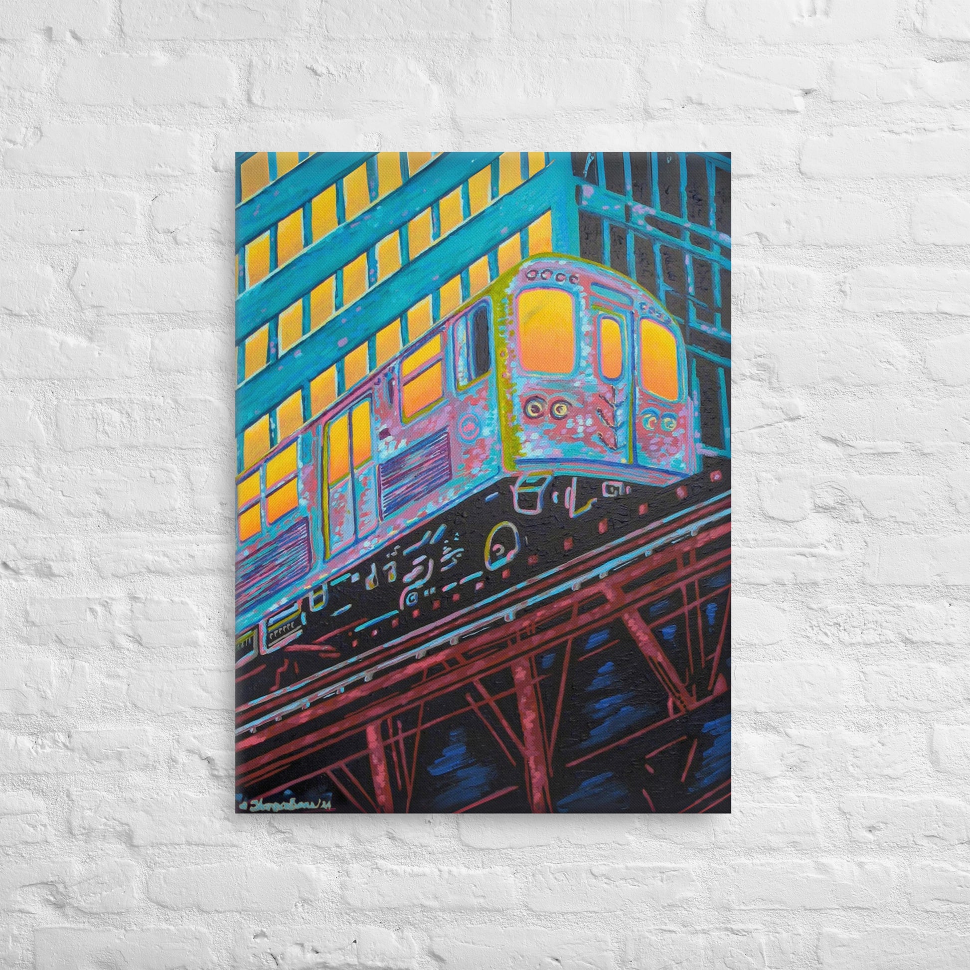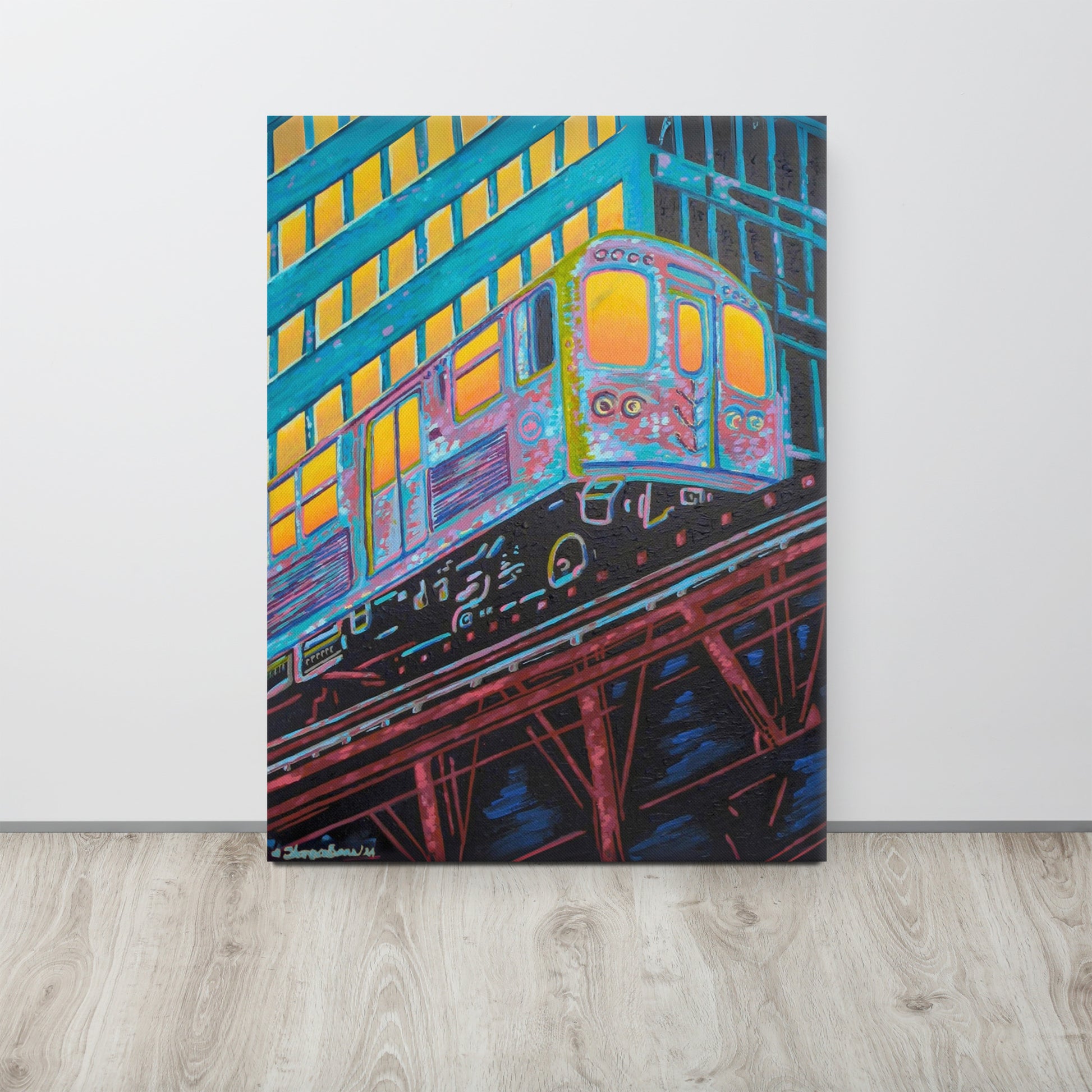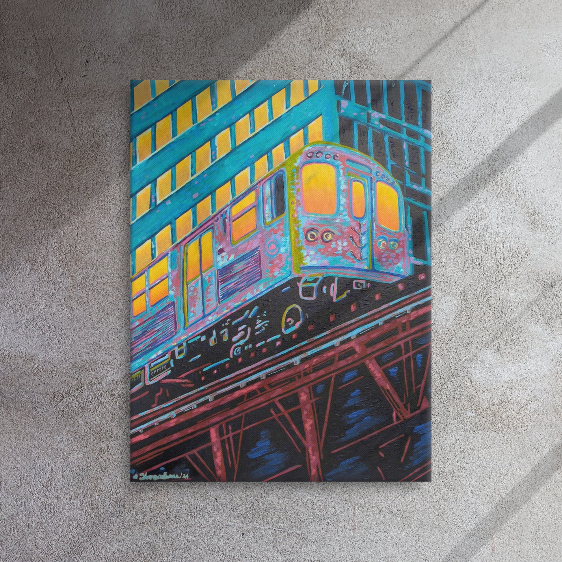 The artist's skillful use of color expressionism breathes life into the cheerful scene, with hues of orange, pink, purple, and steely blue bathing the canvas, reflecting the first light of dawn. The interplay of colors and the sense of speeding motion born from the composition evoke a sense of optimism and anticipation. This distinctive work inspired by the people of Chicago is a fitting addition to any room in need of an energy fix or for those who glow in their hustle.