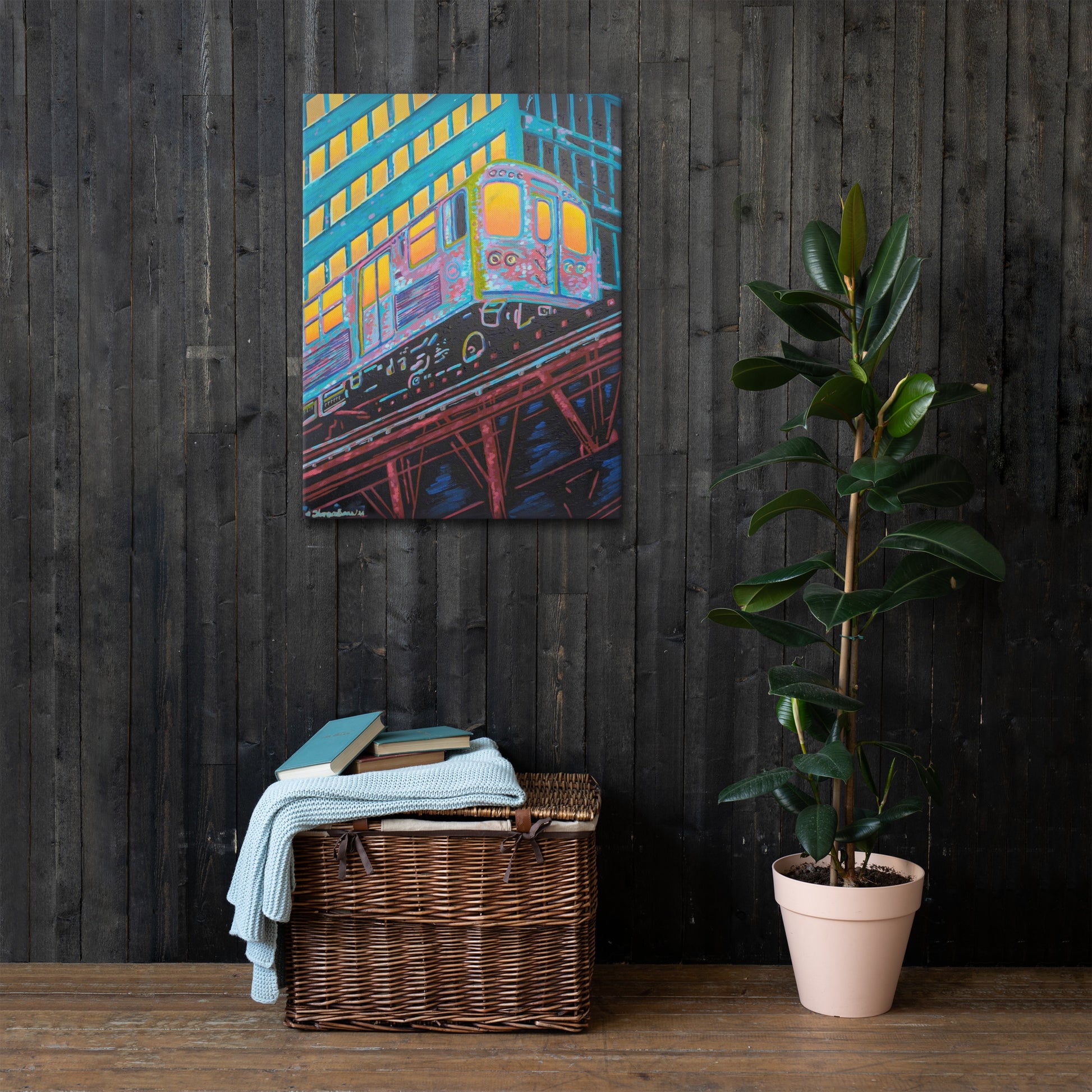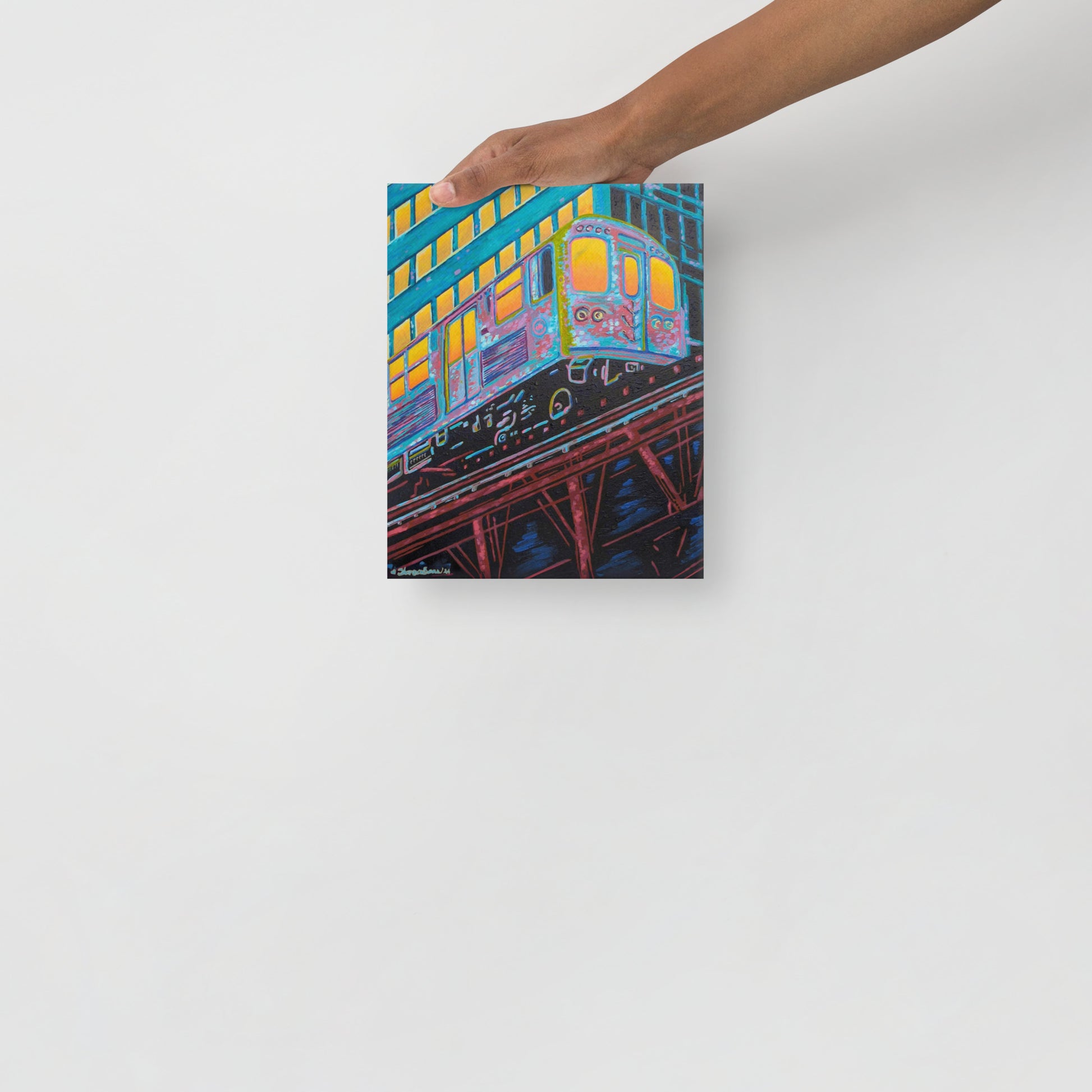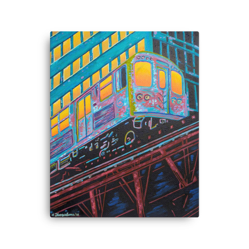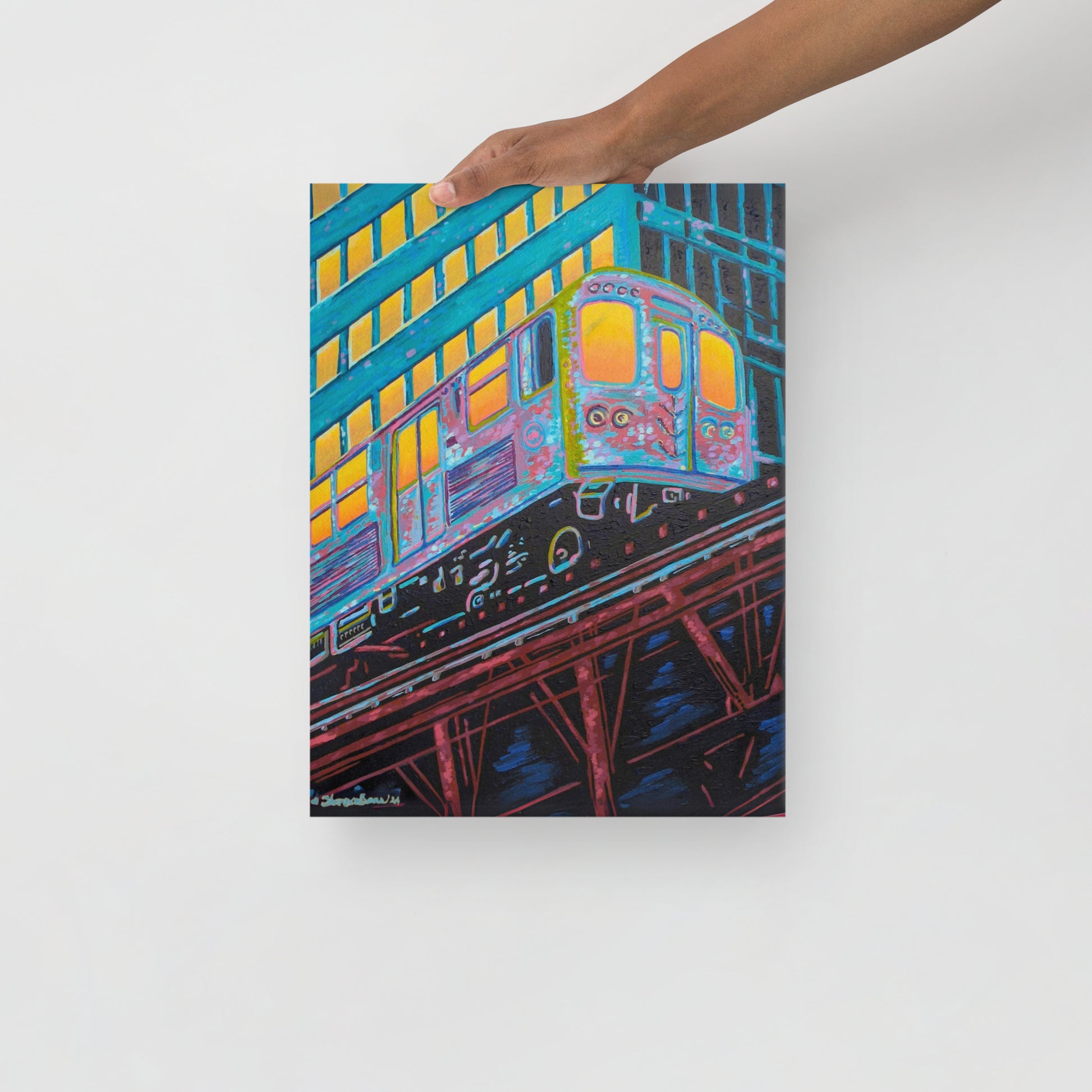 The artist's skillful use of color expressionism breathes life into the cheerful scene, with hues of orange, pink, purple, and steely blue bathing the canvas, reflecting the first light of dawn. The interplay of colors and the sense of speeding motion born from the composition evoke a sense of optimism and anticipation. This distinctive work inspired by the people of Chicago is a fitting addition to any room in need of an energy fix or for those who glow in their hustle.