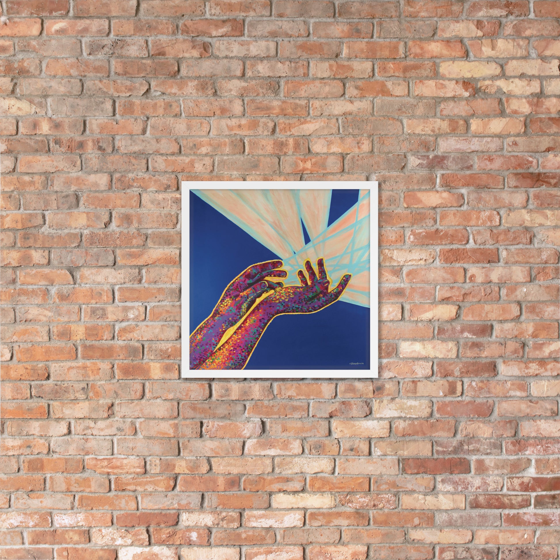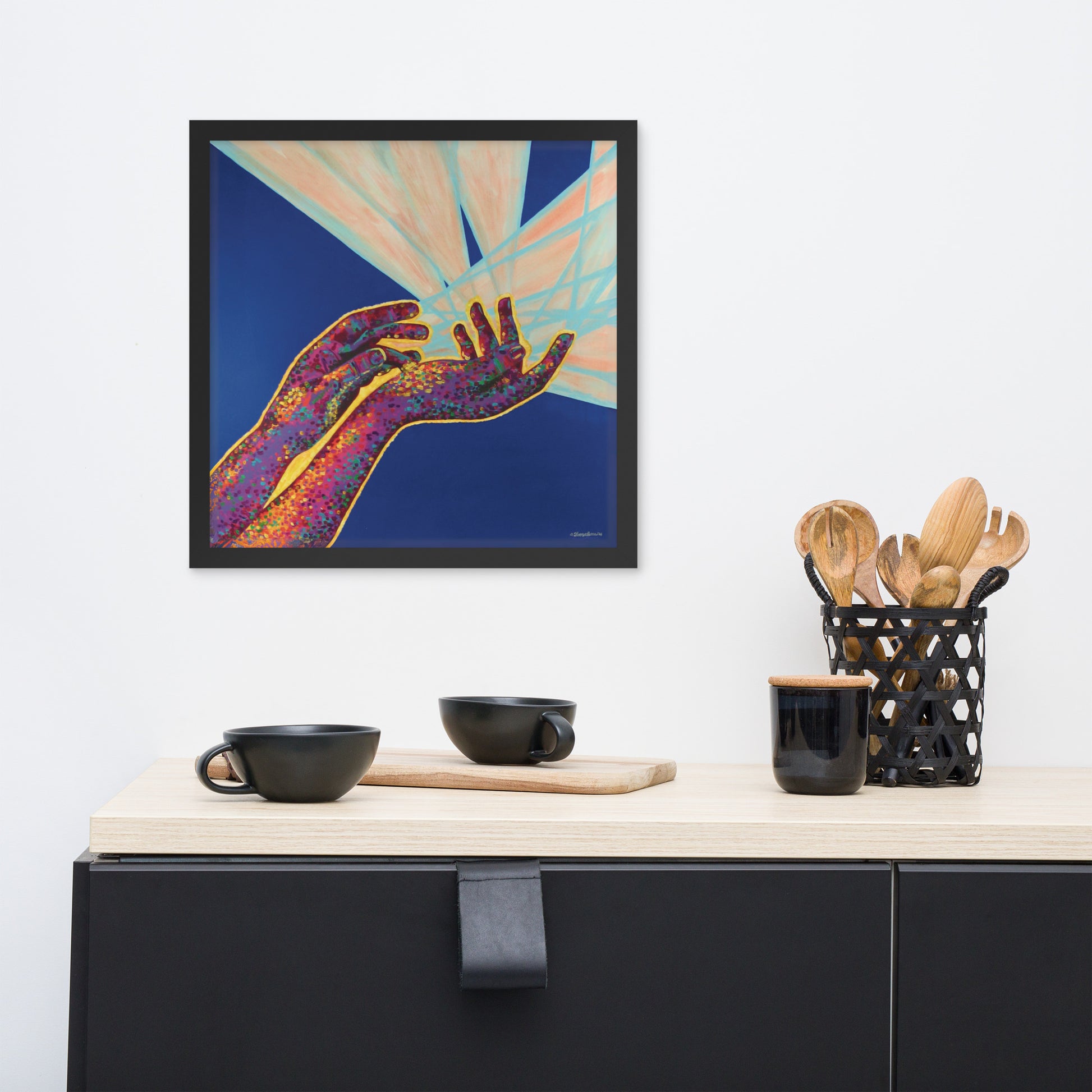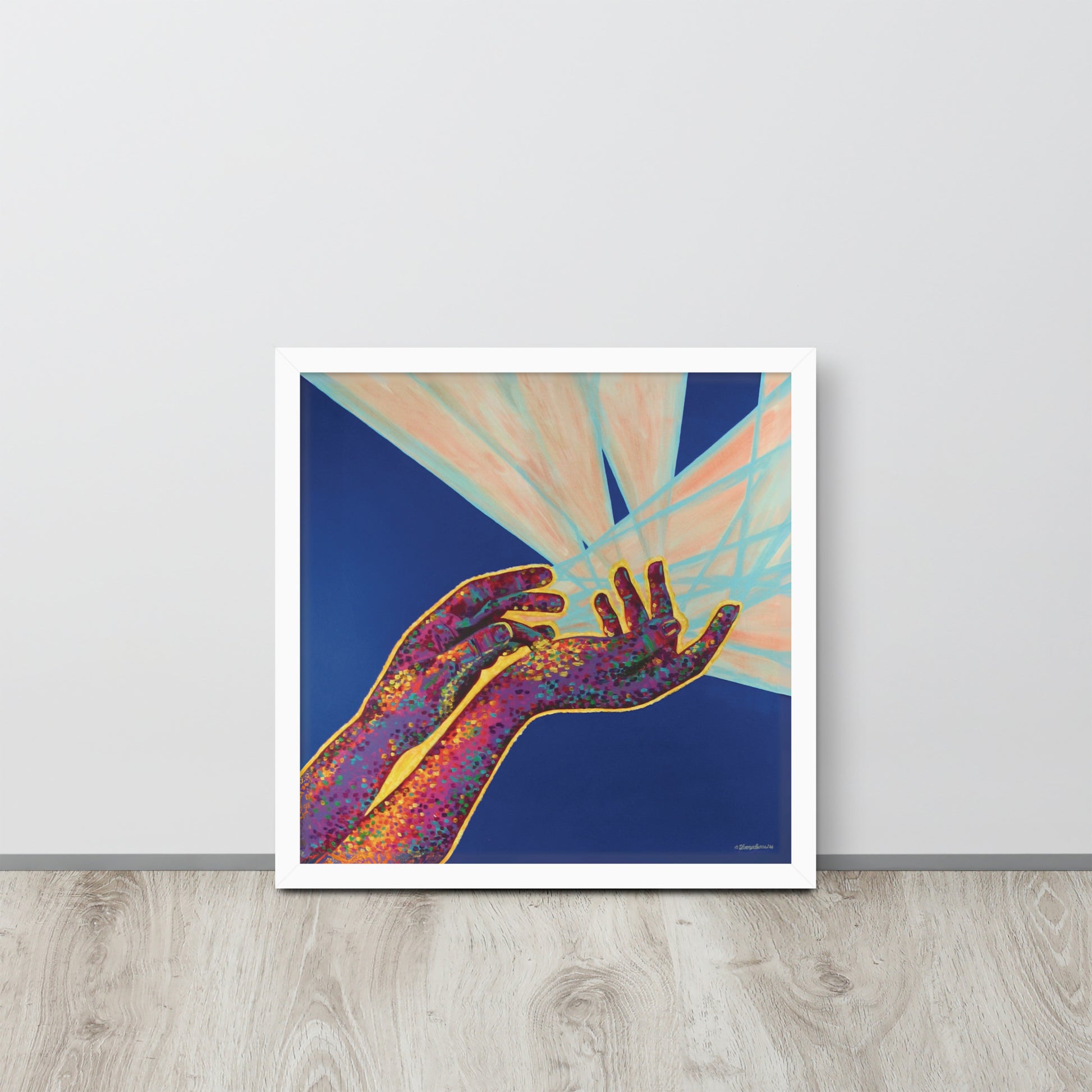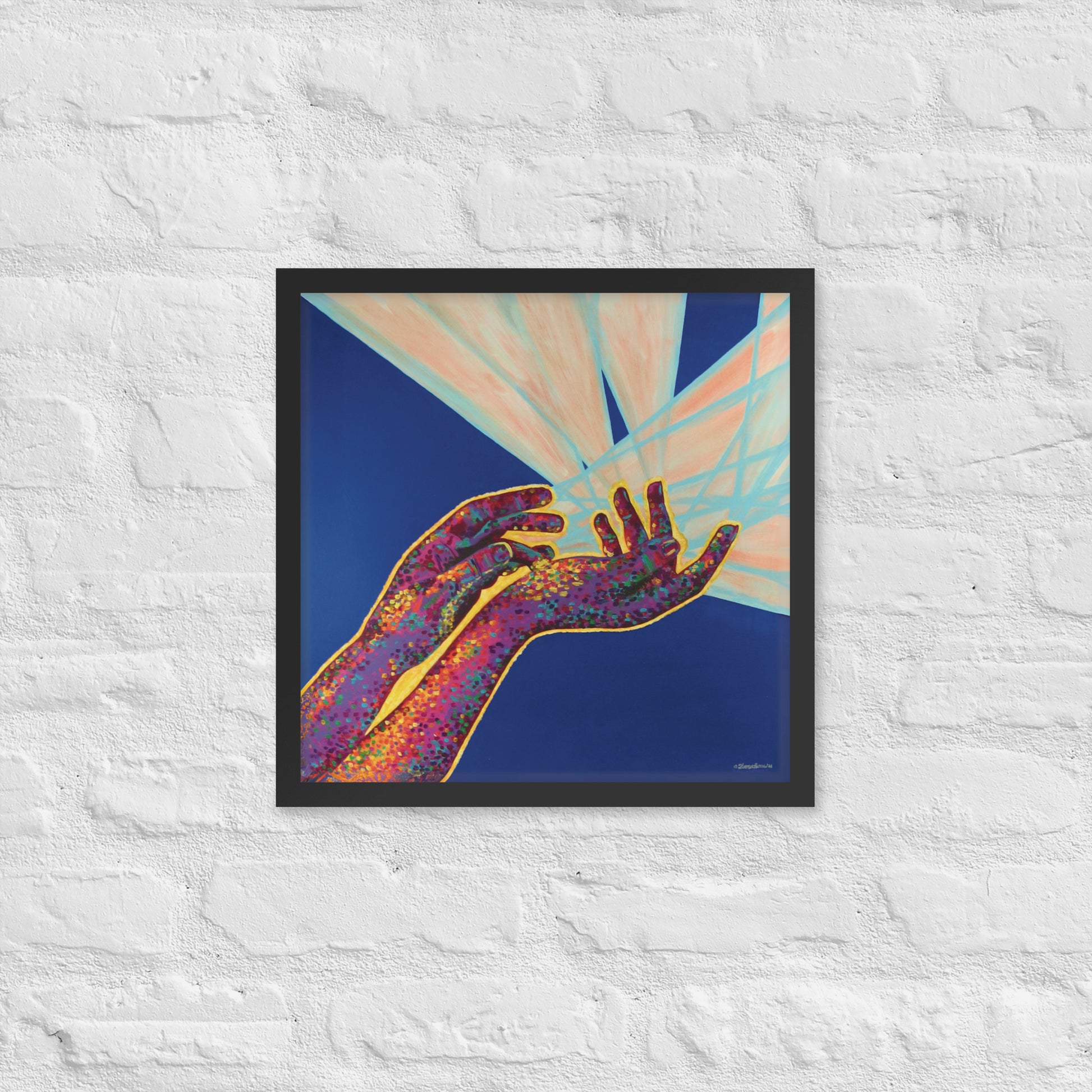 This arresting color expressionist painting captures the profound intimacy and magic of a first touch between lovers. Through an explosion of vivid jewel-toned colors, each brush stroke evokes the raw emotions of anticipation and connection. As they meet, an unearthly alchemy of light with hints of peach and sky blue streams from each of their fingertips and pierces the deep blue surrounding them, reminiscent of the radiant energy and passion ignited from the alchemy of the first touch of union. This moment was not expected. Nothing will ever be the same.