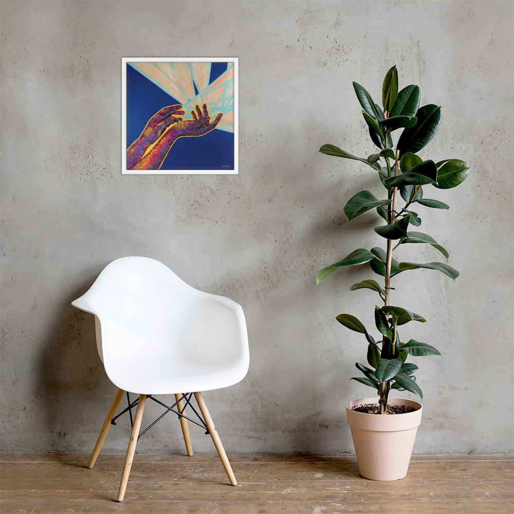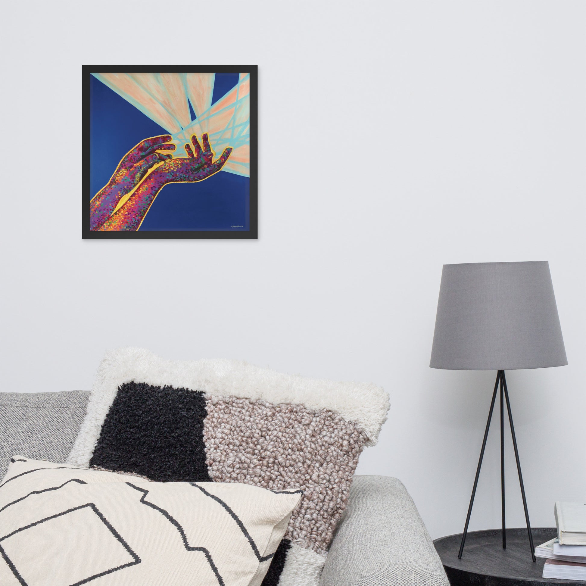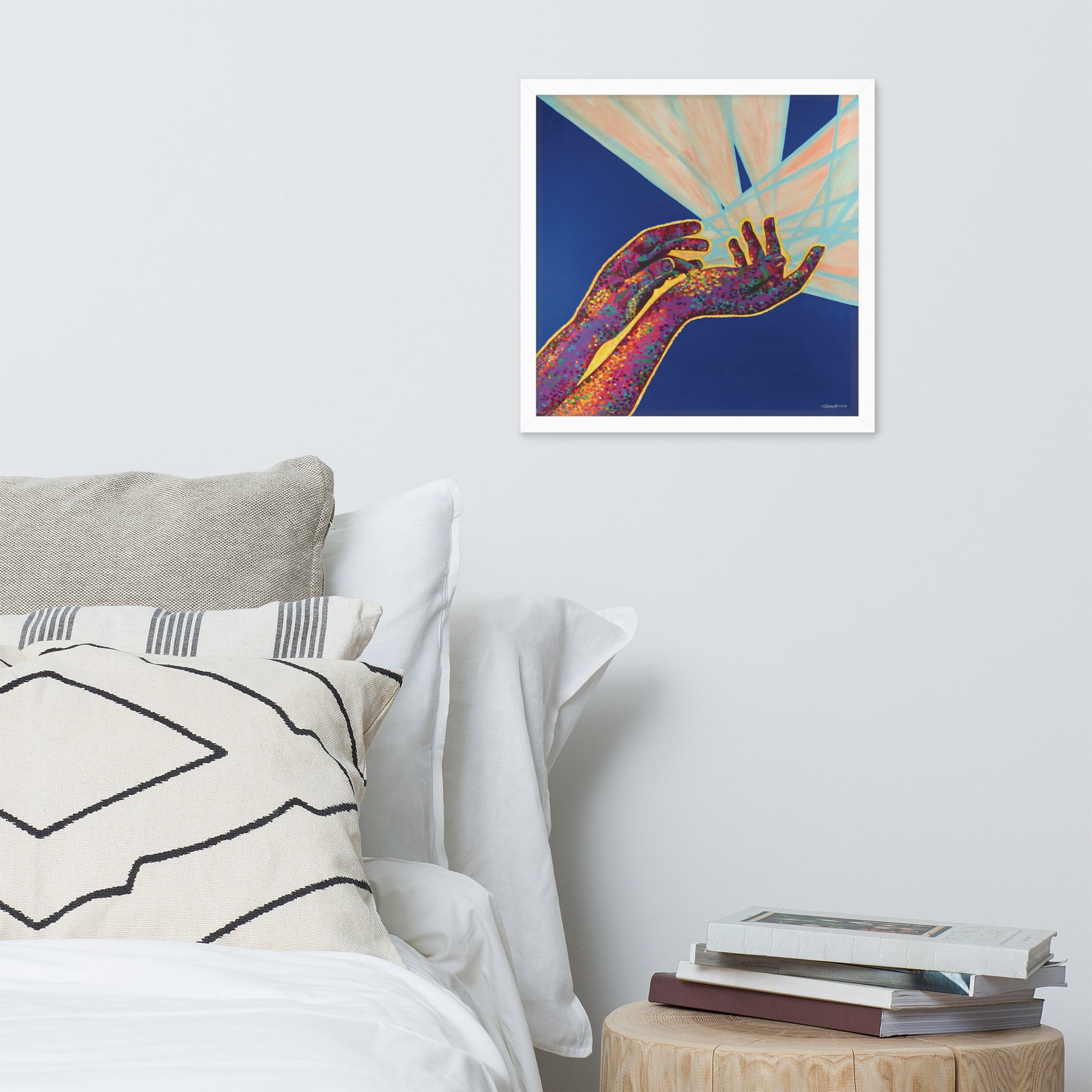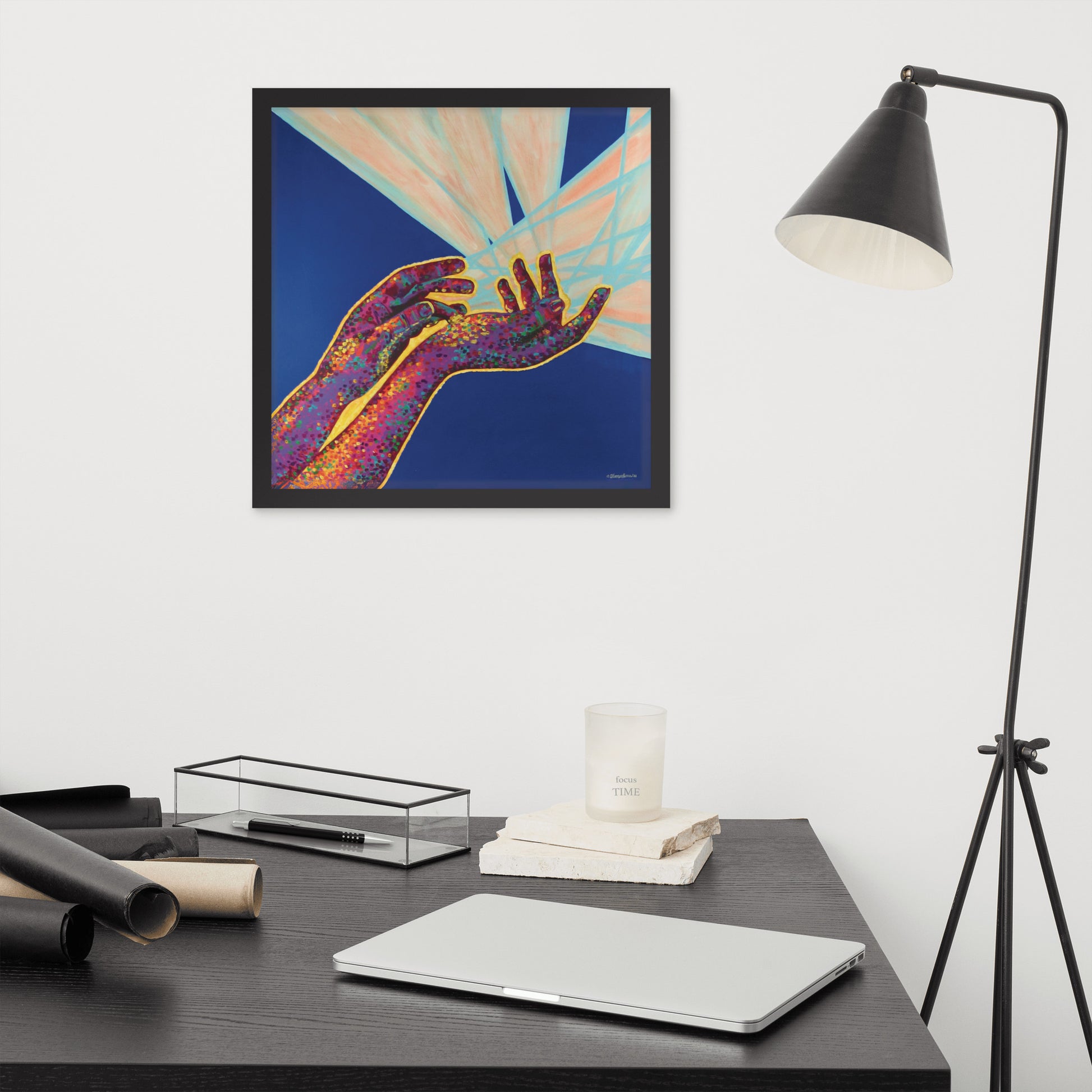 This arresting color expressionist painting captures the profound intimacy and magic of a first touch between lovers. Through an explosion of vivid jewel-toned colors, each brush stroke evokes the raw emotions of anticipation and connection. As they meet, an unearthly alchemy of light with hints of peach and sky blue streams from each of their fingertips and pierces the deep blue surrounding them, reminiscent of the radiant energy and passion ignited from the alchemy of the first touch of union. This moment was not expected. Nothing will ever be the same.