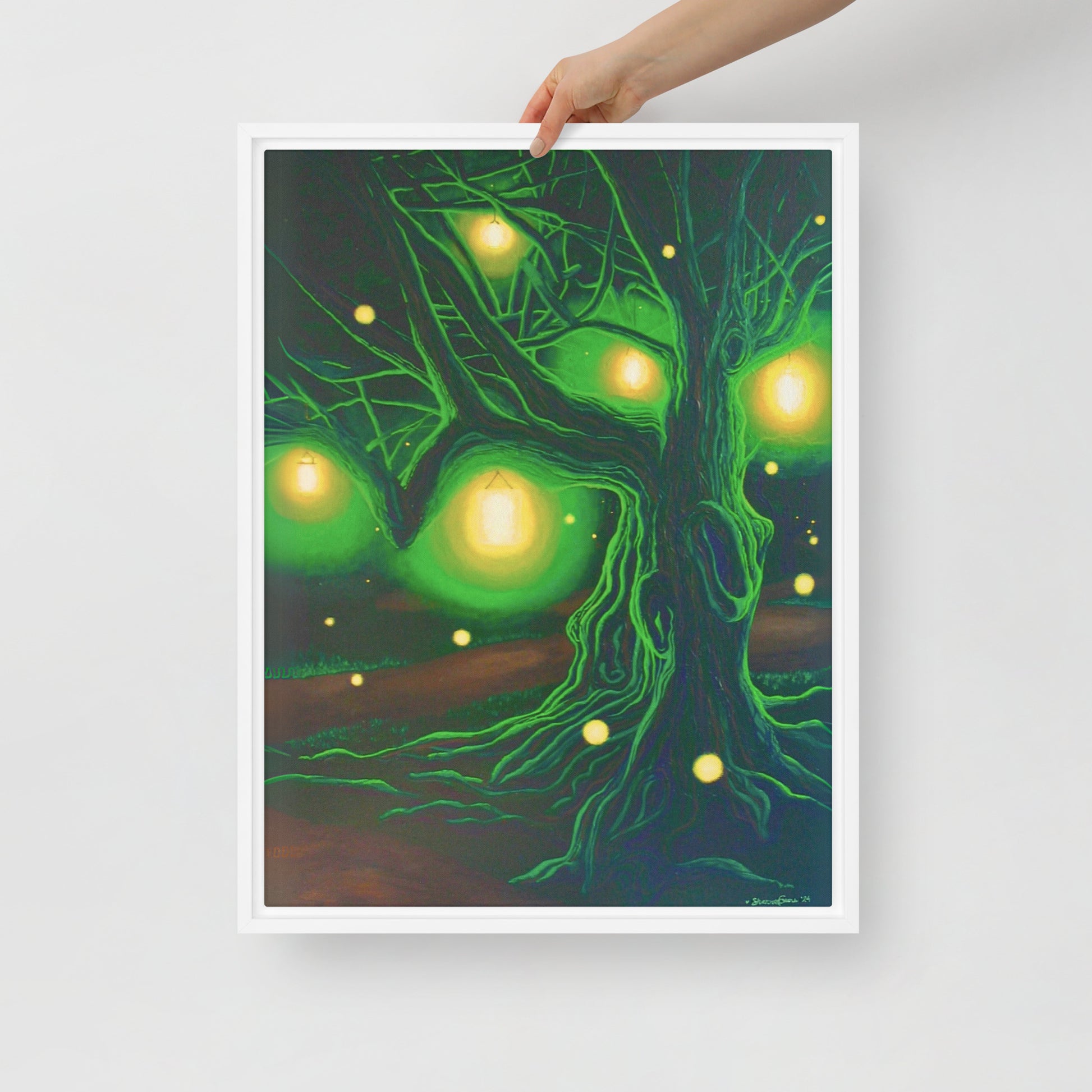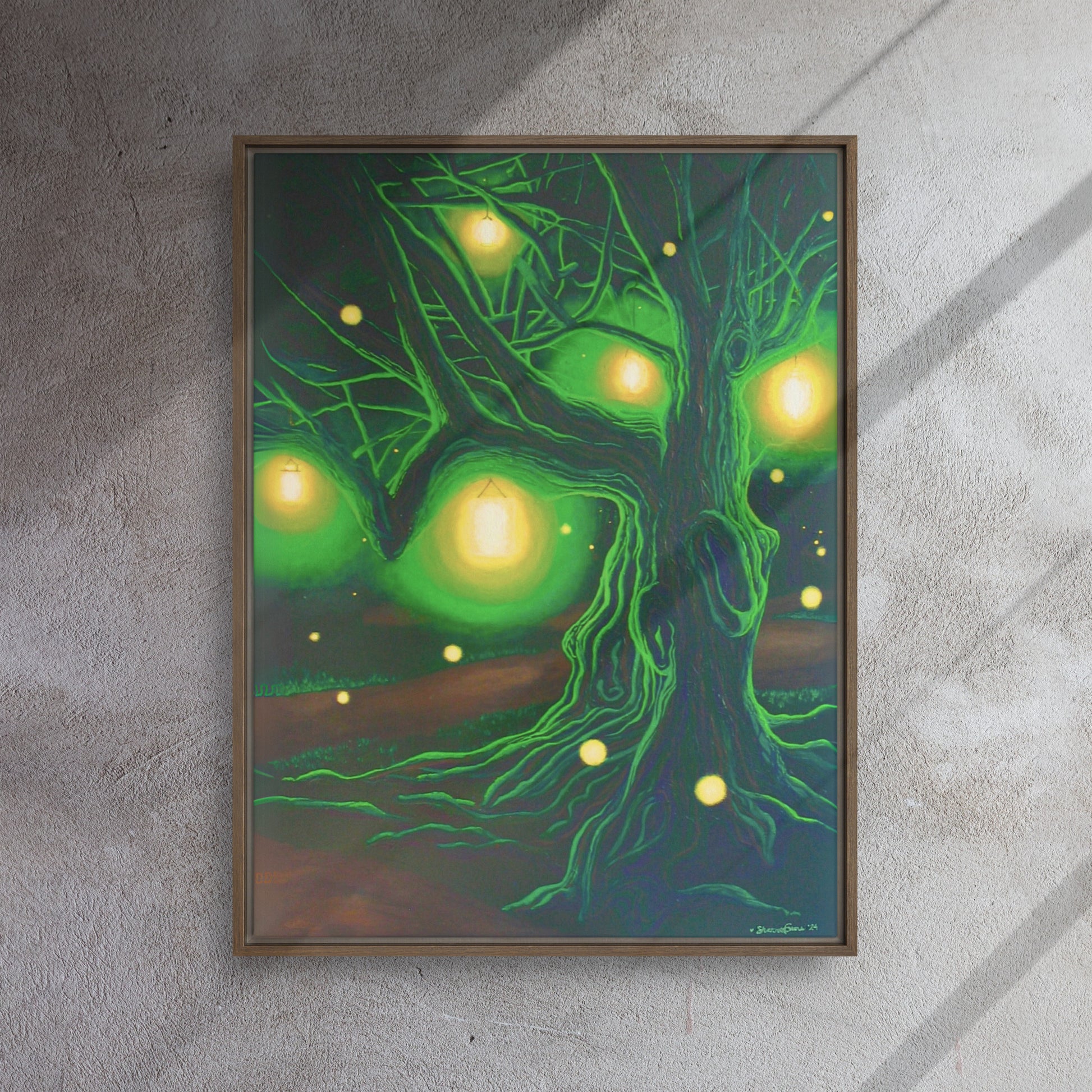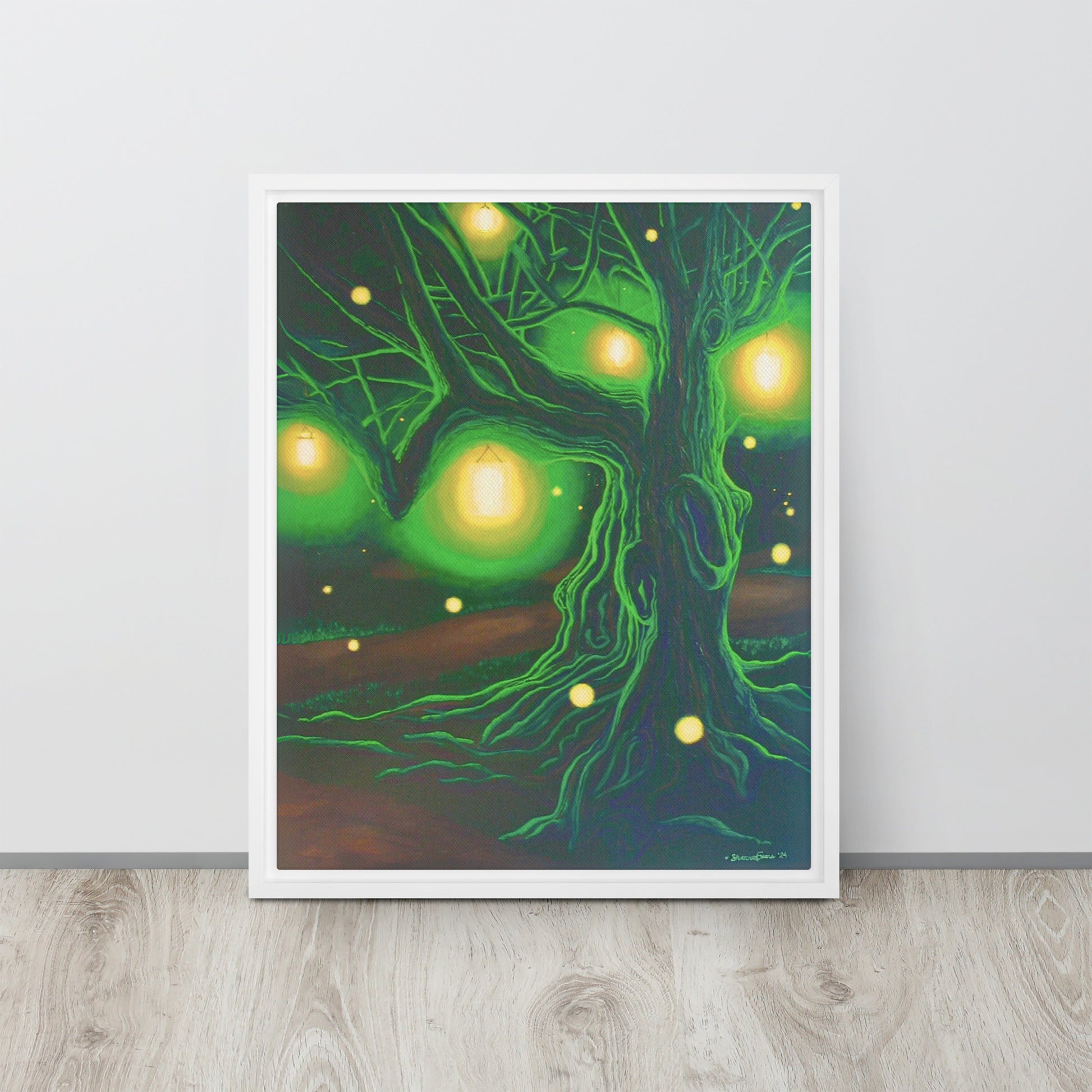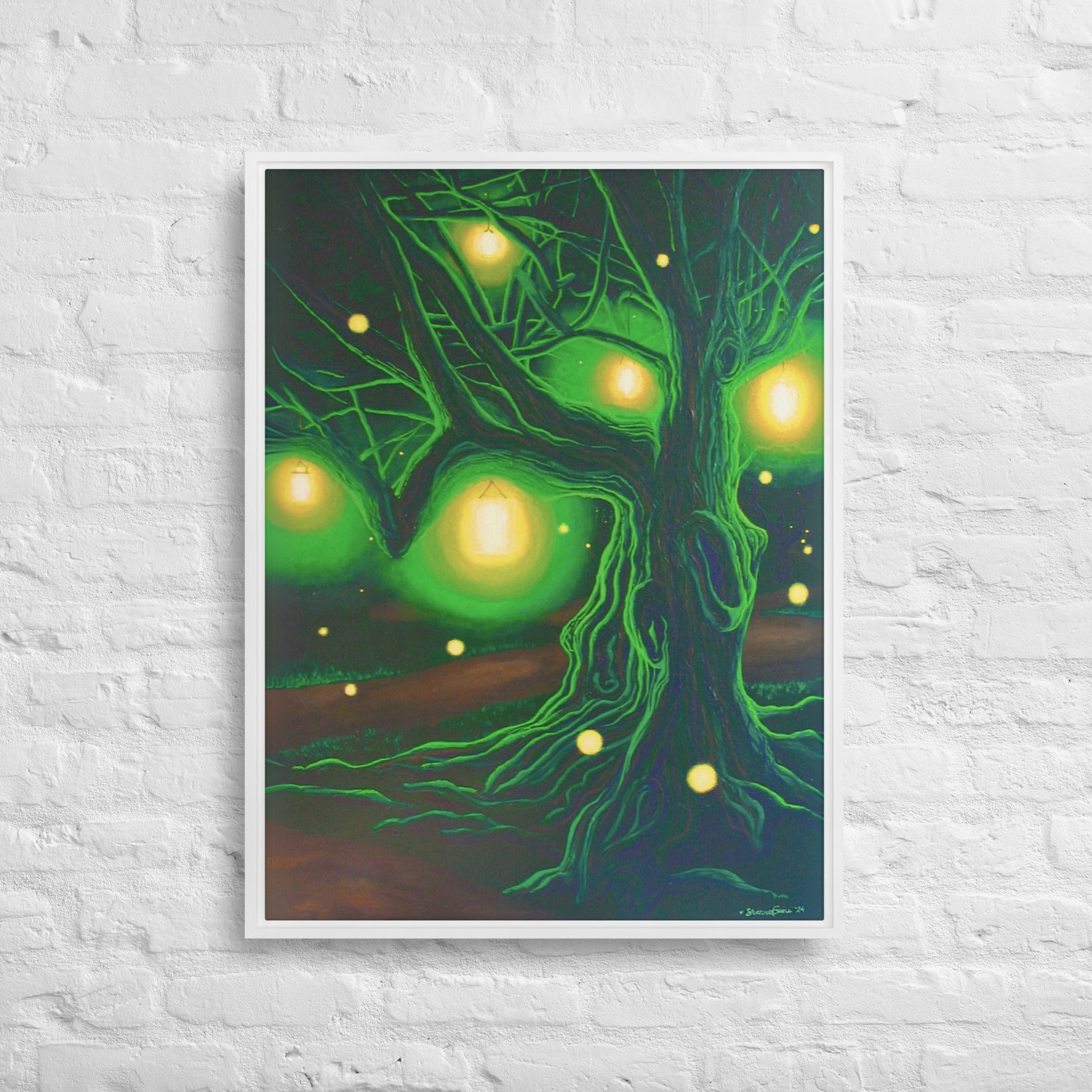 Step into a realm of enchantment with this mesmerizing fantasy painting capturing the ethereal beauty of an ancient tree nestled under the cloak of night and gracefully surrounded by a gentle dance of fireflies. Brightly shining lanterns hang cheerfully from the twisted branches as beacons of light casting a warm glow across the forest path unfolding into the distance. The symphony of fireflies flickers in the cool night air adding a touch of whimsy and invitation.