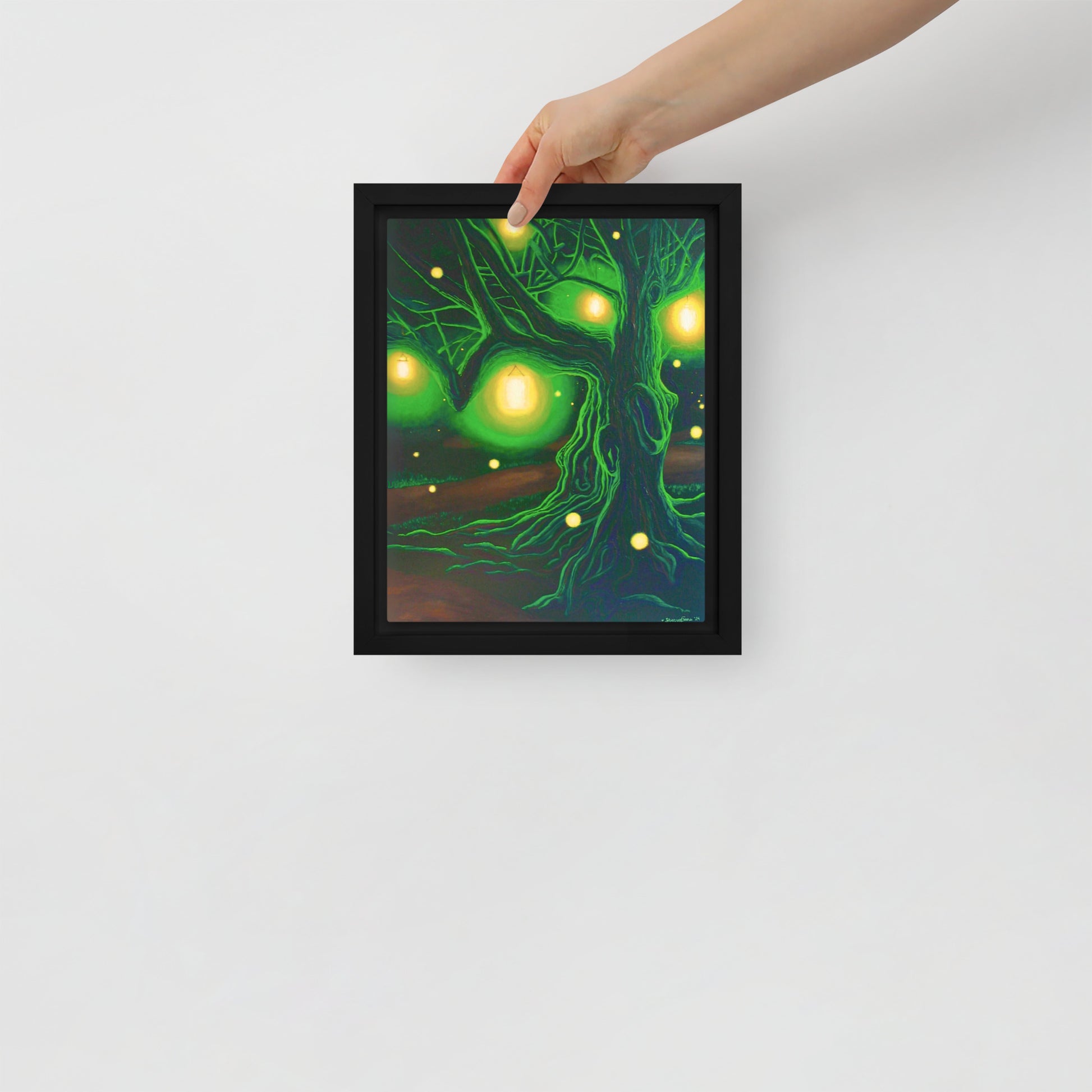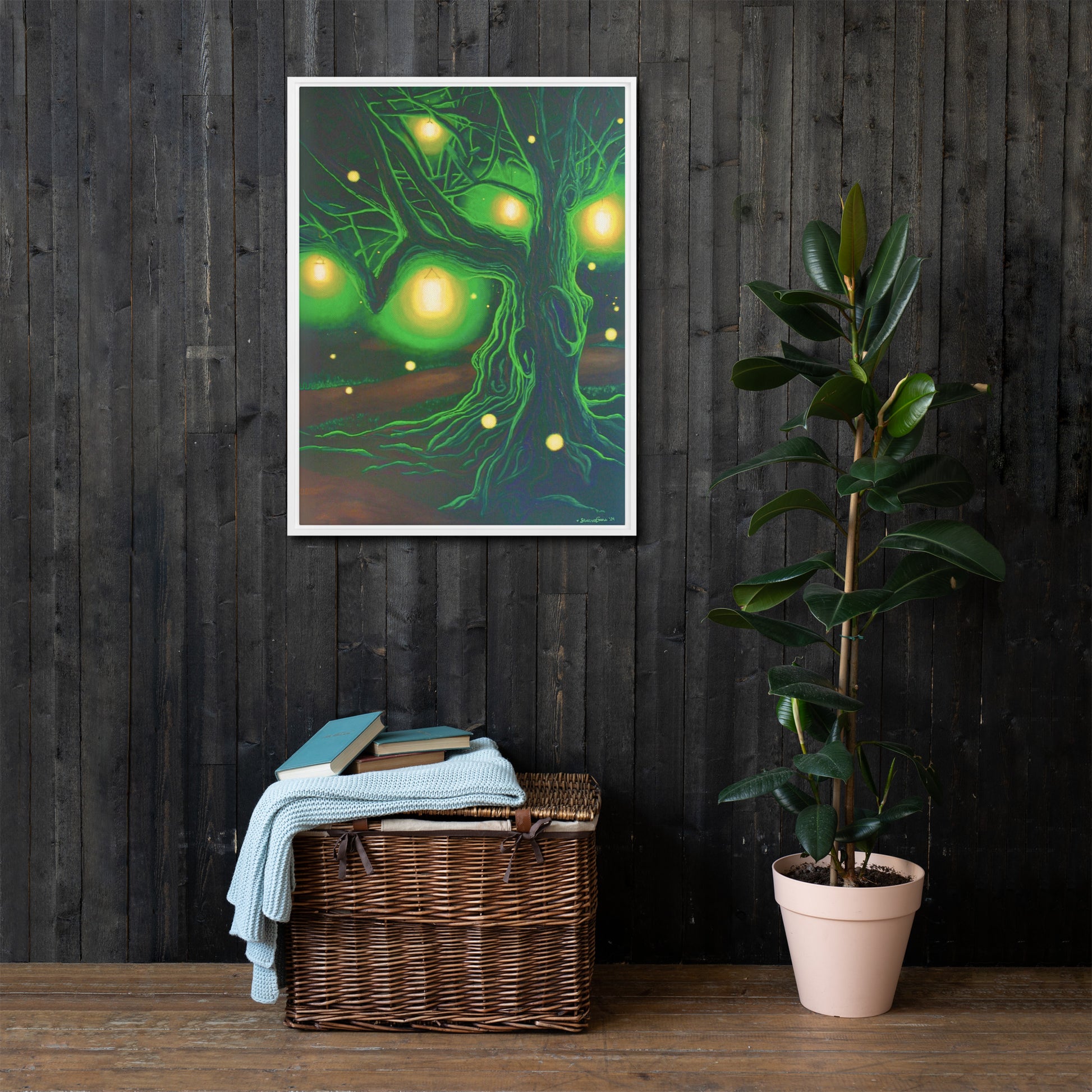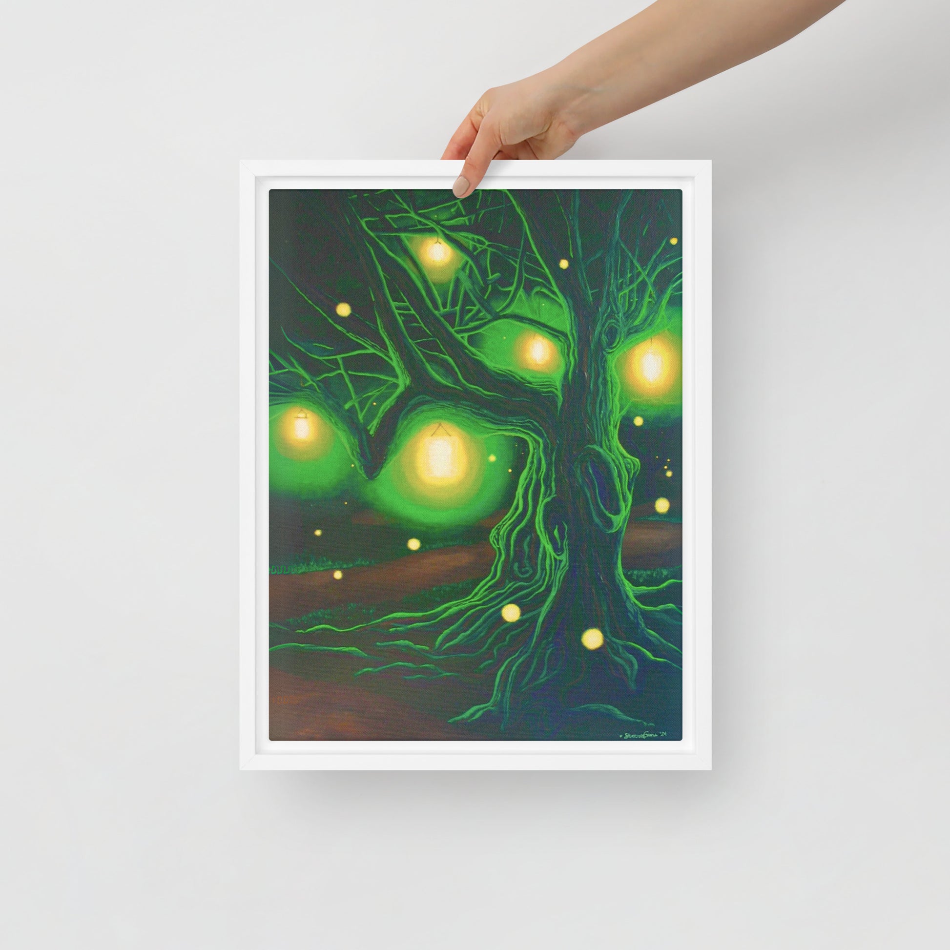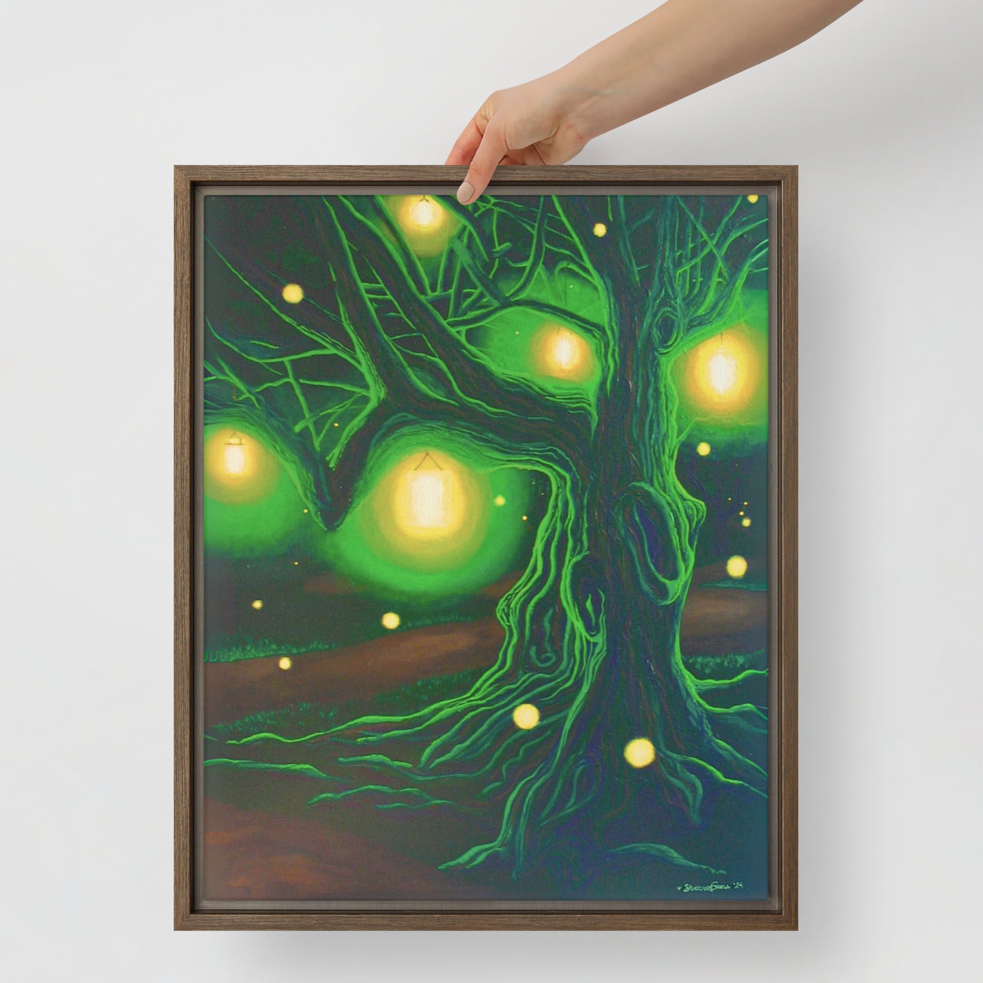 Step into a realm of enchantment with this mesmerizing fantasy painting capturing the ethereal beauty of an ancient tree nestled under the cloak of night and gracefully surrounded by a gentle dance of fireflies. Brightly shining lanterns hang cheerfully from the twisted branches as beacons of light casting a warm glow across the forest path unfolding into the distance. The symphony of fireflies flickers in the cool night air adding a touch of whimsy and invitation.