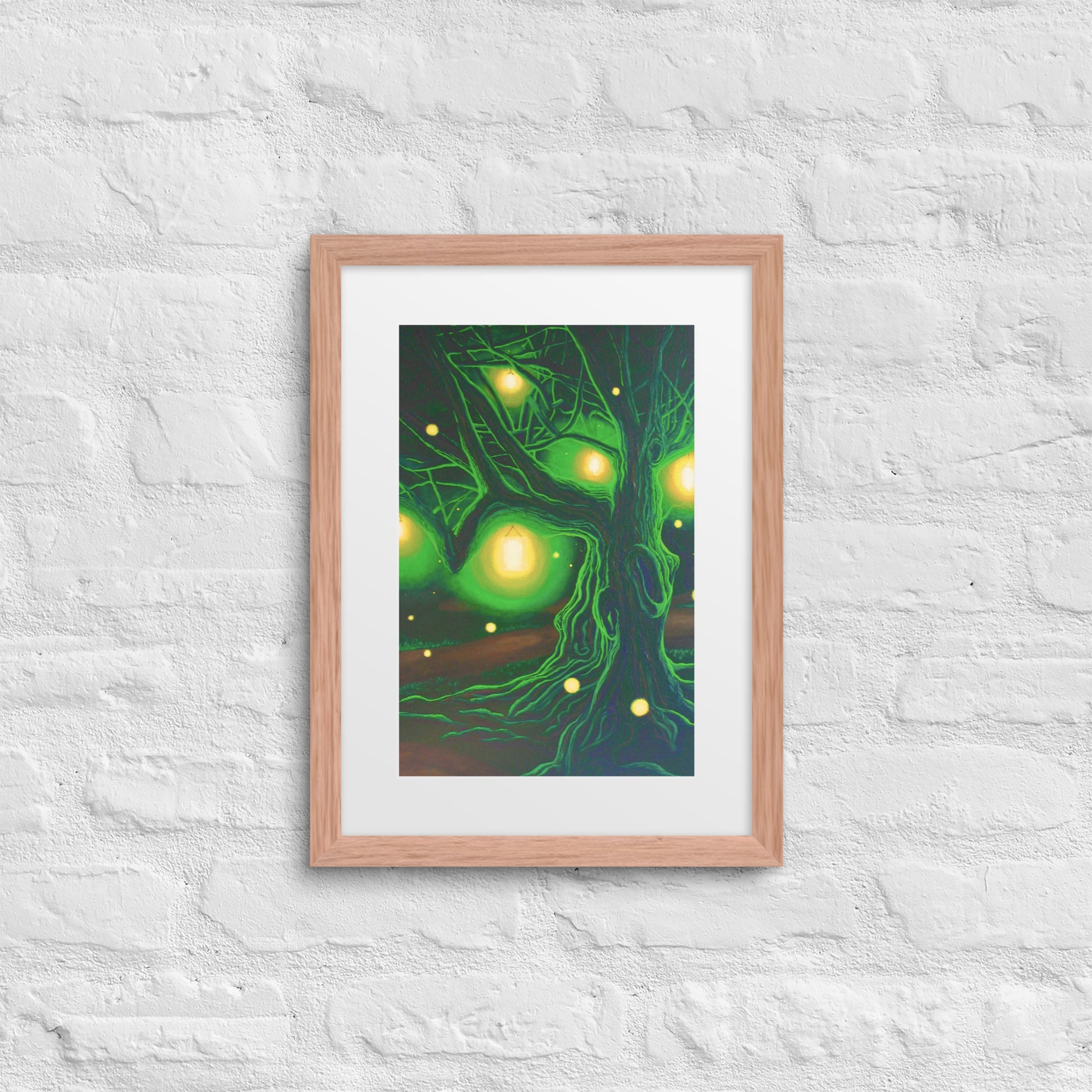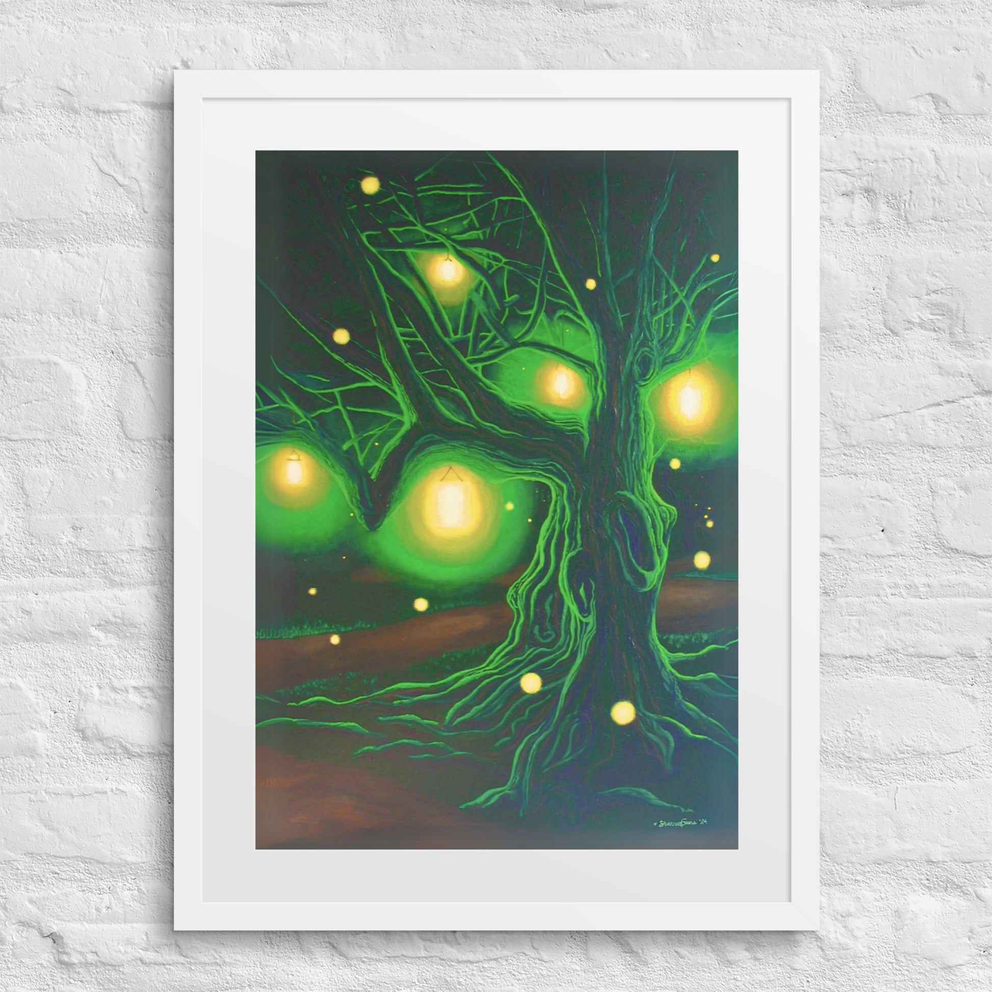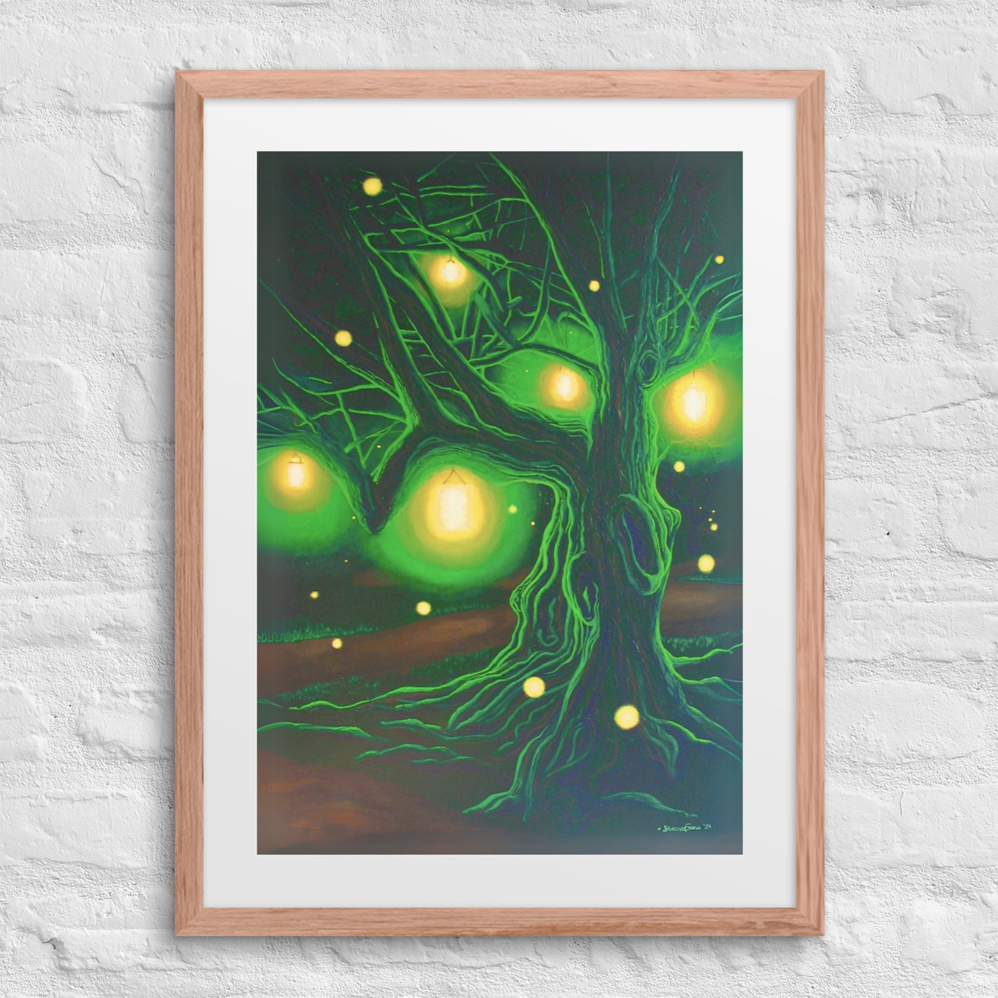 Step into a realm of enchantment with this mesmerizing fantasy painting capturing the ethereal beauty of an ancient tree nestled under the cloak of night and gracefully surrounded by a gentle dance of fireflies. Brightly shining lanterns hang cheerfully from the twisted branches as beacons of light casting a warm glow across the forest path unfolding into the distance. The symphony of fireflies flickers in the cool night air adding a touch of whimsy and invitation.