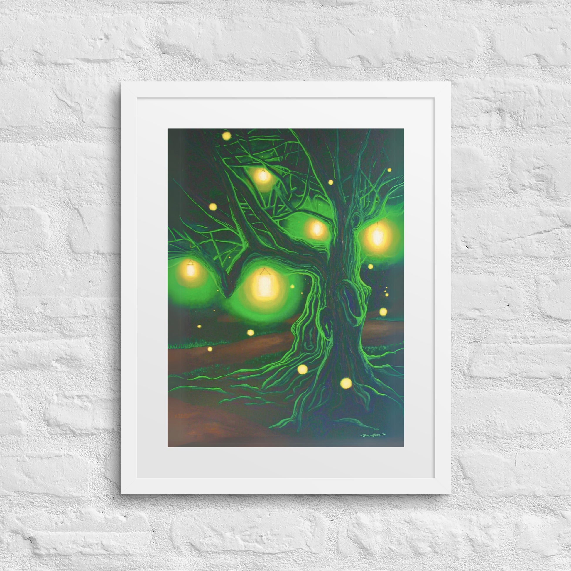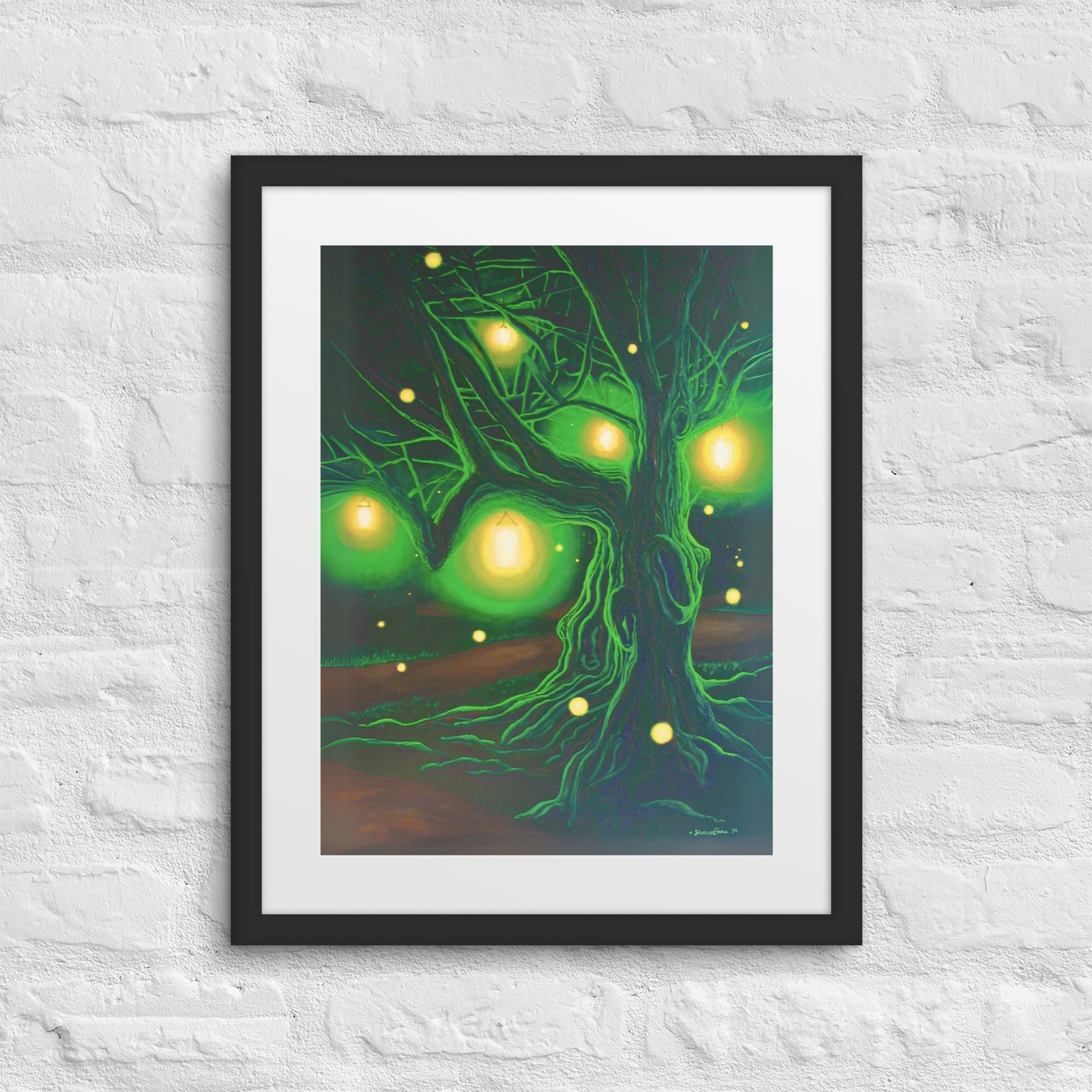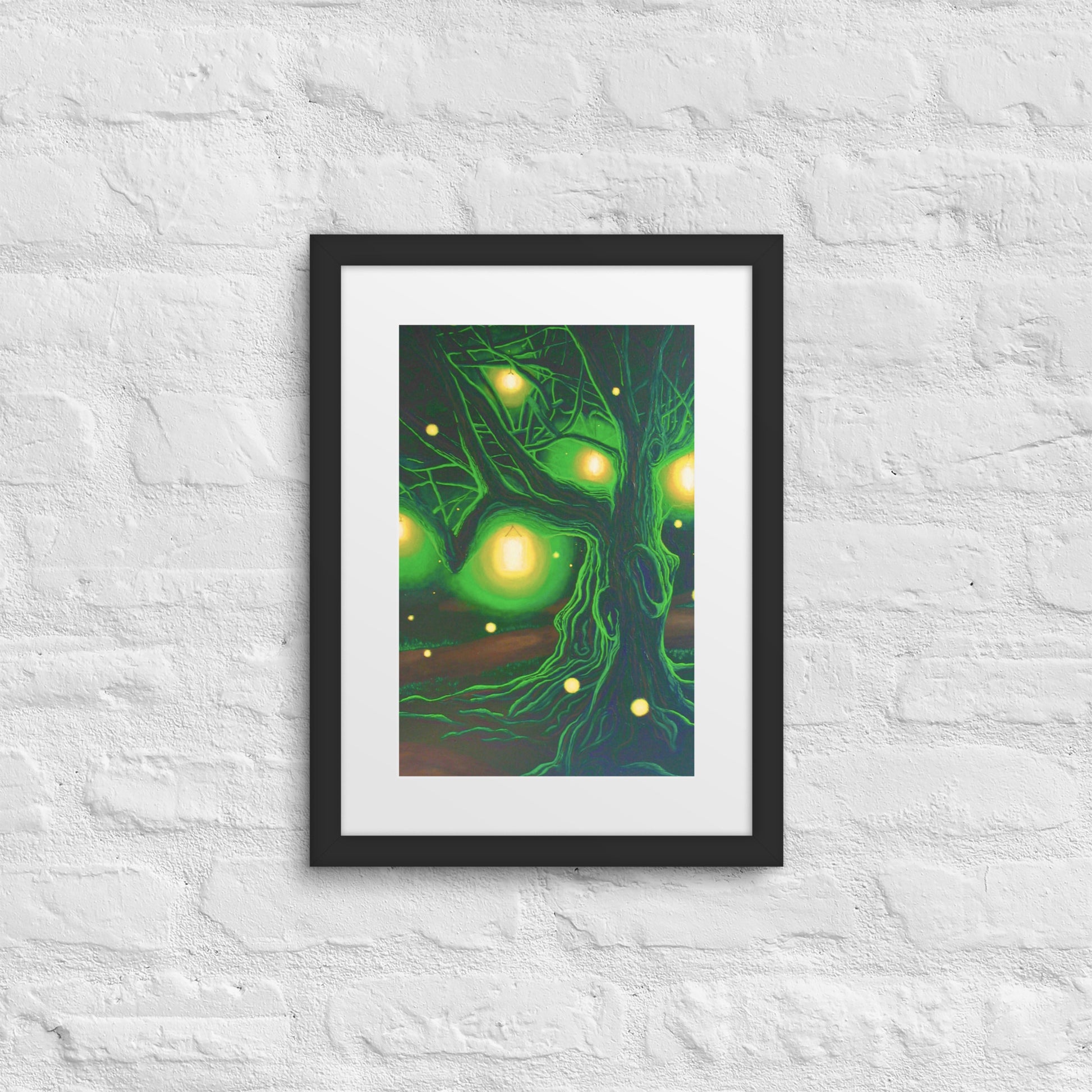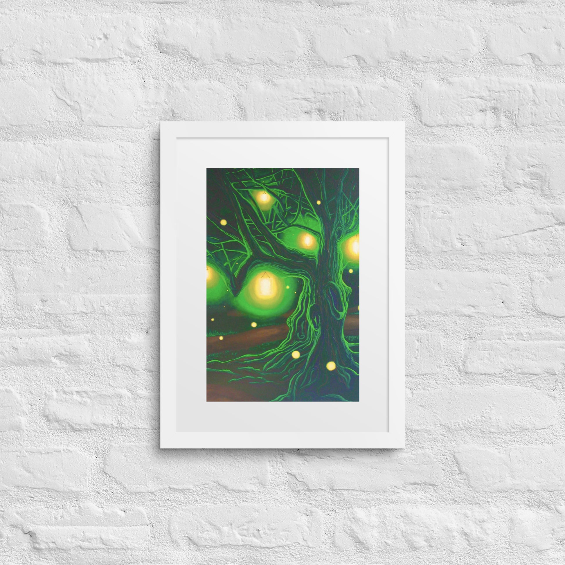 Step into a realm of enchantment with this mesmerizing fantasy painting capturing the ethereal beauty of an ancient tree nestled under the cloak of night and gracefully surrounded by a gentle dance of fireflies. Brightly shining lanterns hang cheerfully from the twisted branches as beacons of light casting a warm glow across the forest path unfolding into the distance. The symphony of fireflies flickers in the cool night air adding a touch of whimsy and invitation.