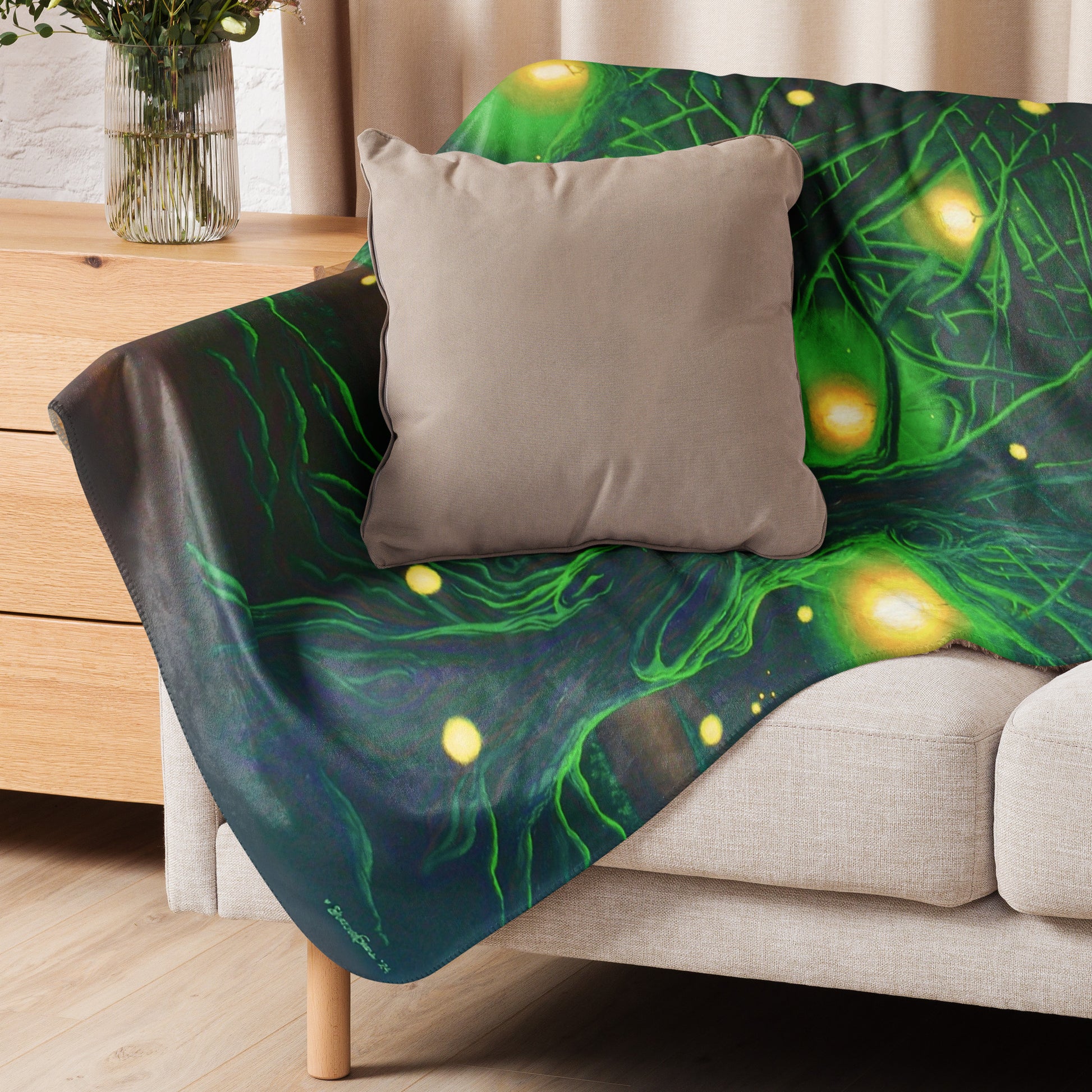 The lush, warm greens and deep earth tones of this piece bring an extra touch of nature into any home and are especially savory for city-dwellers and those living in cold-weather climates who crave a taste of green.