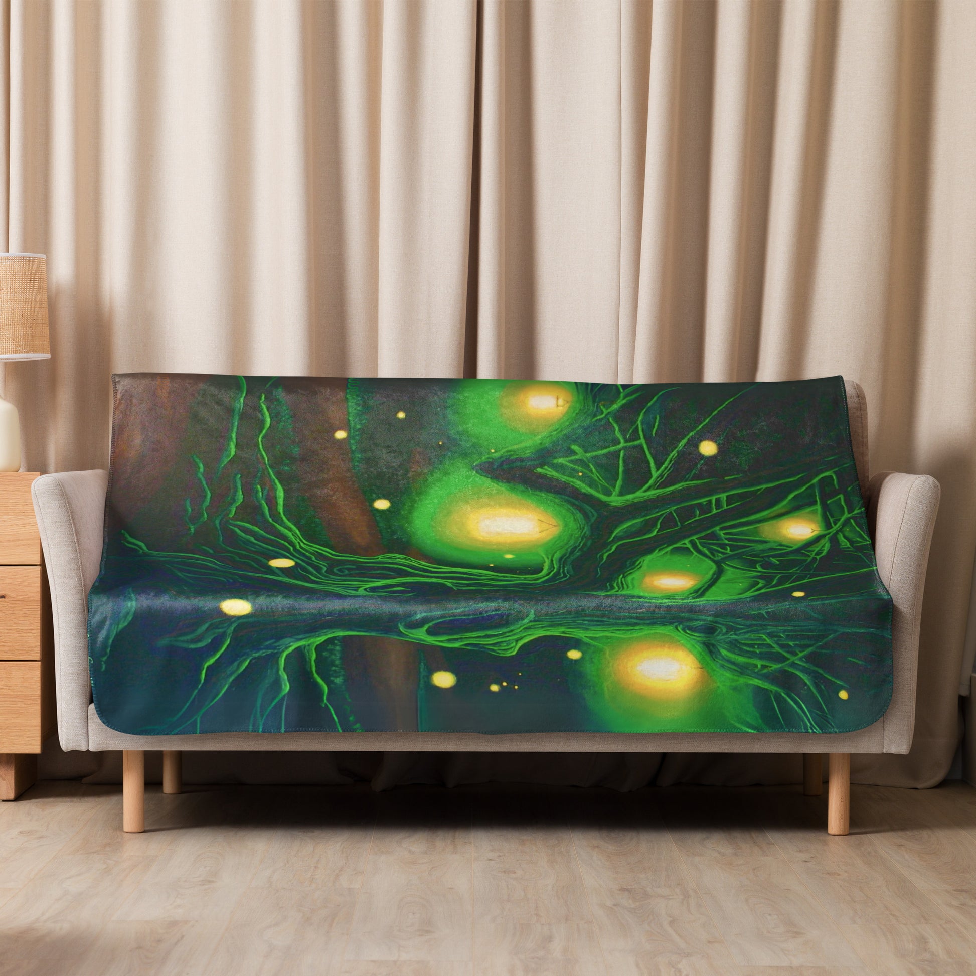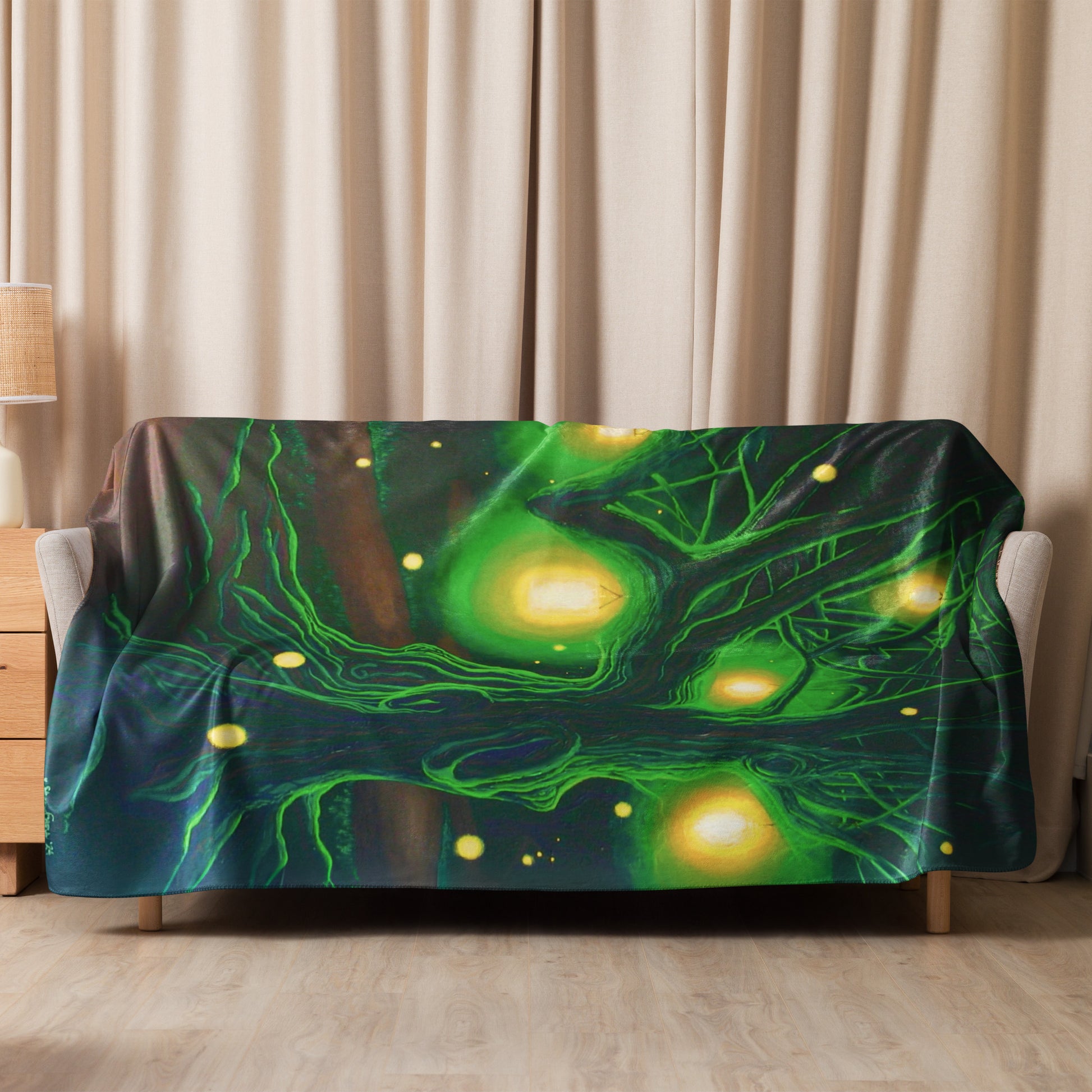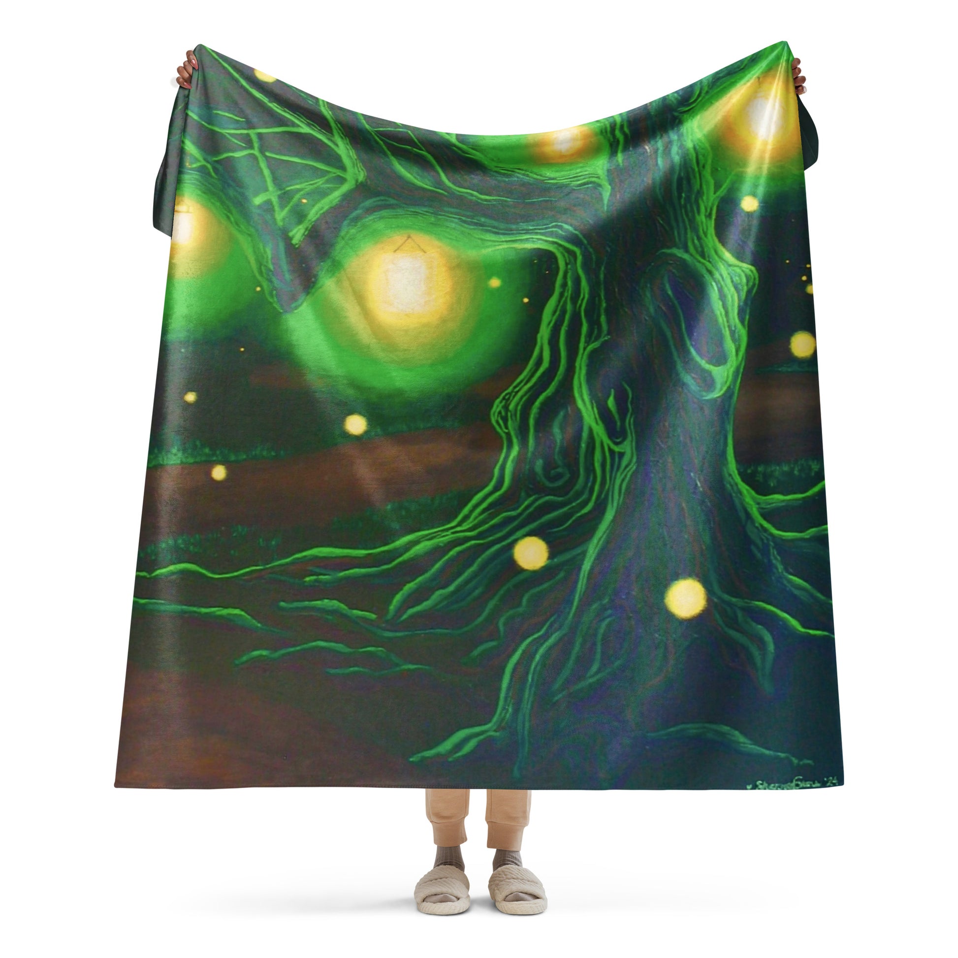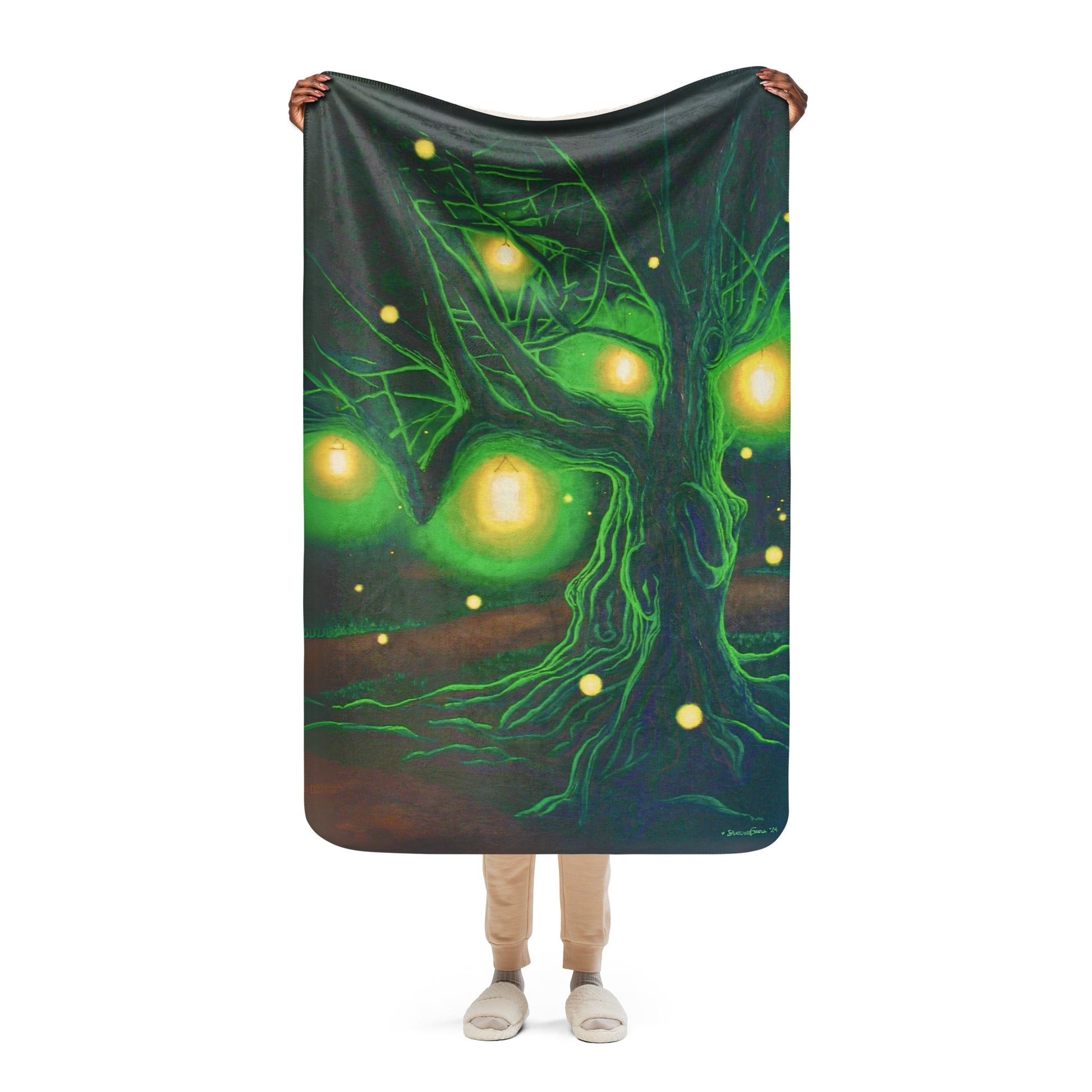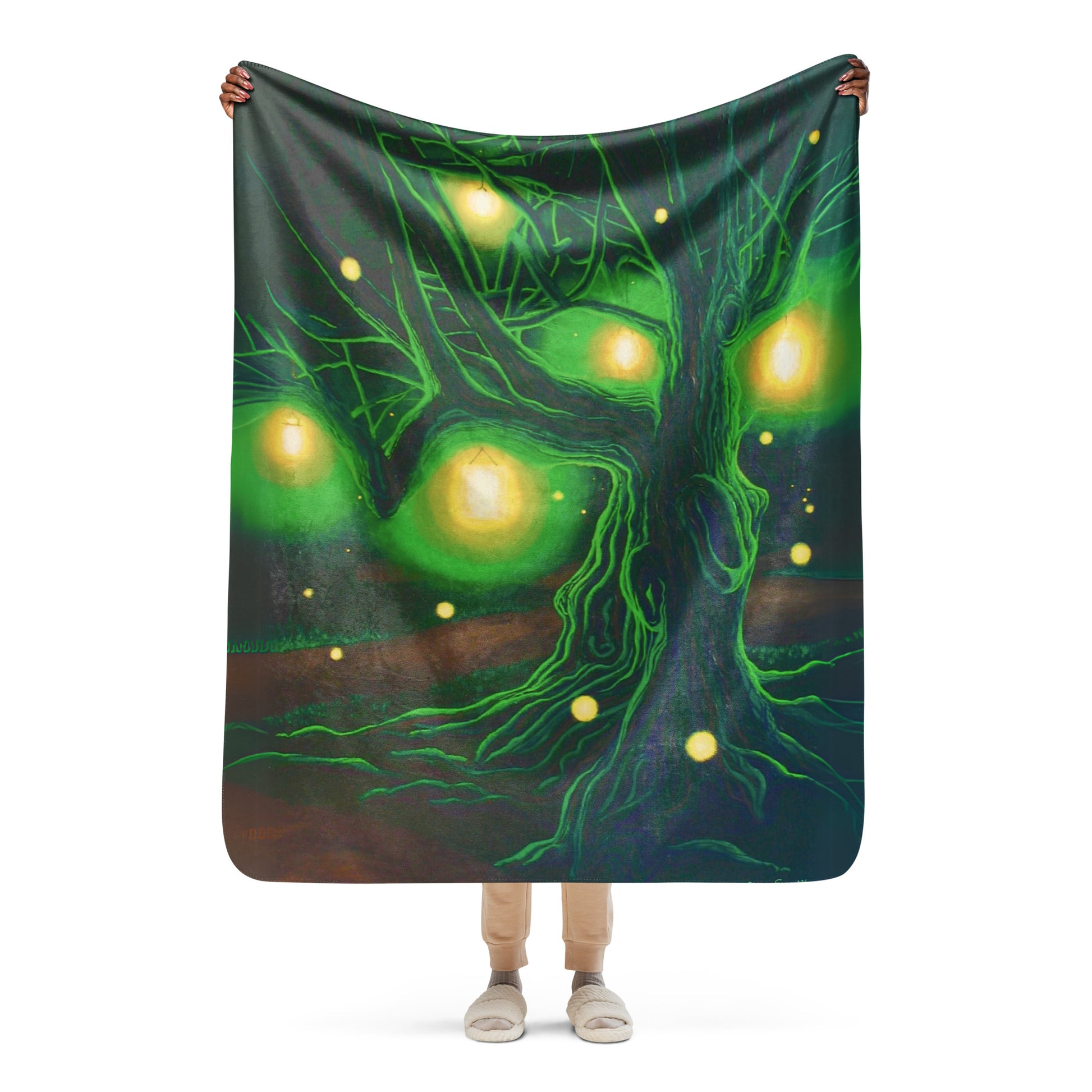 Step into a realm of enchantment with this mesmerizing fantasy painting capturing the ethereal beauty of an ancient tree nestled under the cloak of night and gracefully surrounded by a gentle dance of fireflies. Brightly shining lanterns hang cheerfully from the twisted branches as beacons of light casting a warm glow across the forest path unfolding into the distance. The symphony of fireflies flickers in the cool night air adding a touch of whimsy and invitation.